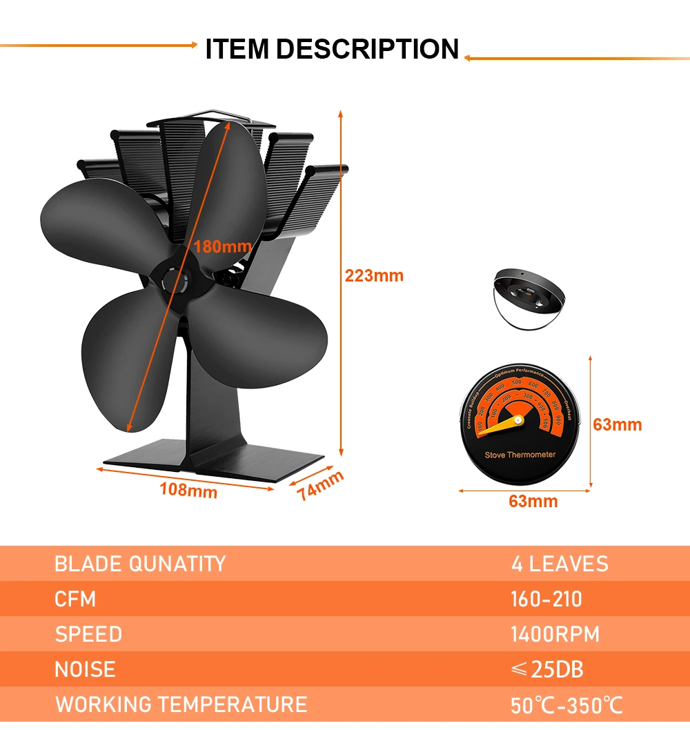 2.The range of working temperature is about: 140°F / 60°C~662°F / 350°C, higher the temperature, faster it starts to spin. Attention: the temperature can not be over 662°F when using the stove fan.