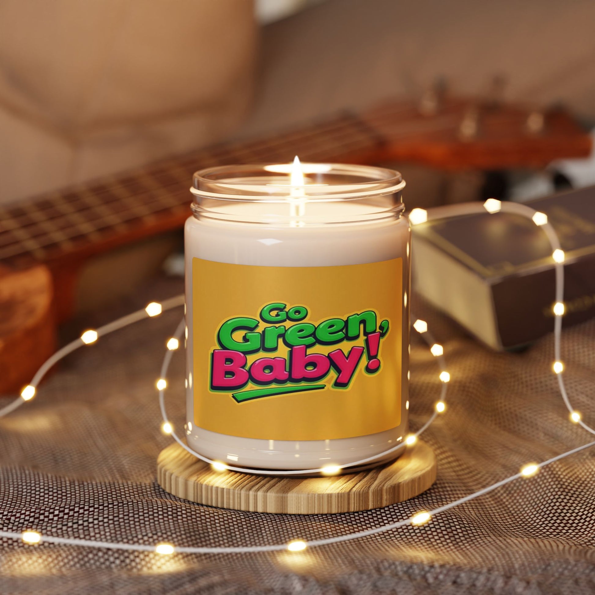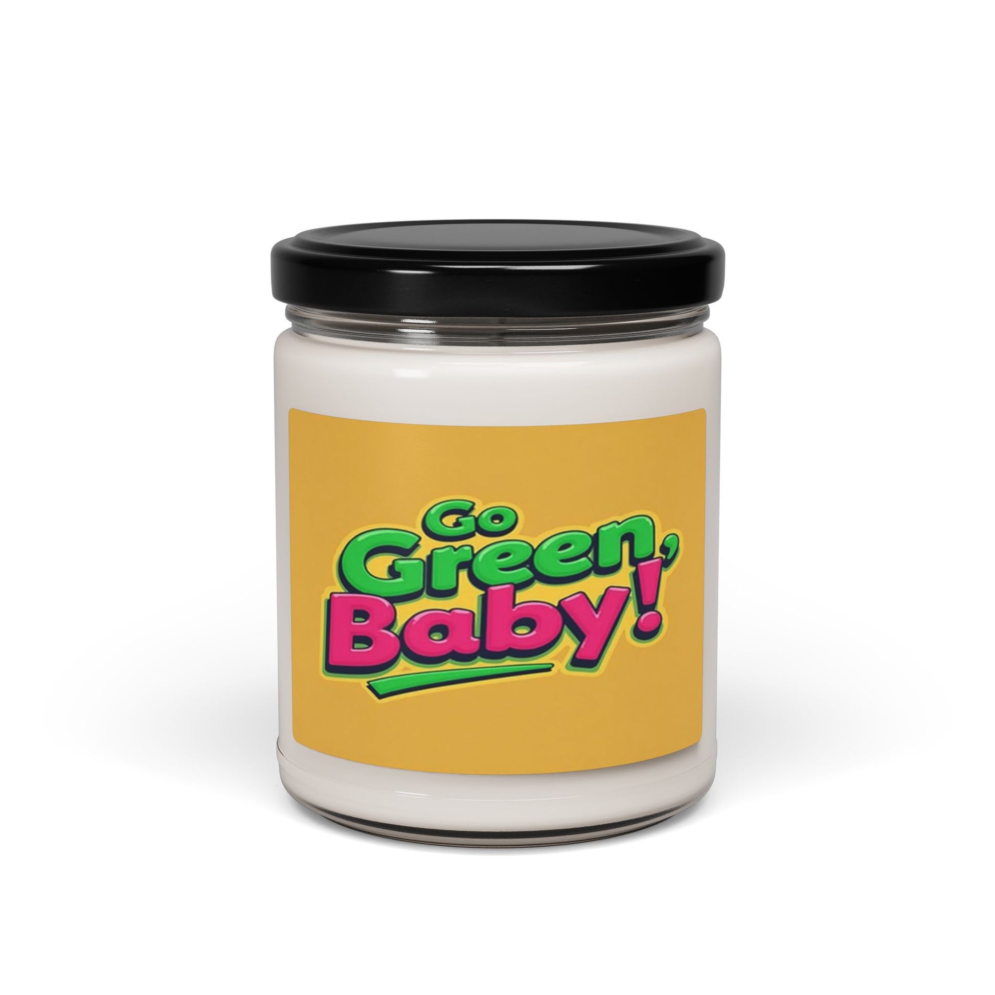 Go Green, Baby! is a bold, feel-good graphic print designed to brighten nurseries, playrooms, and kid-friendly spaces. The centerpiece is the text "Go Green, Baby!" rendered in bold, playful typography, with letters in bright green and pink against a solid yellow-orange backdrop.