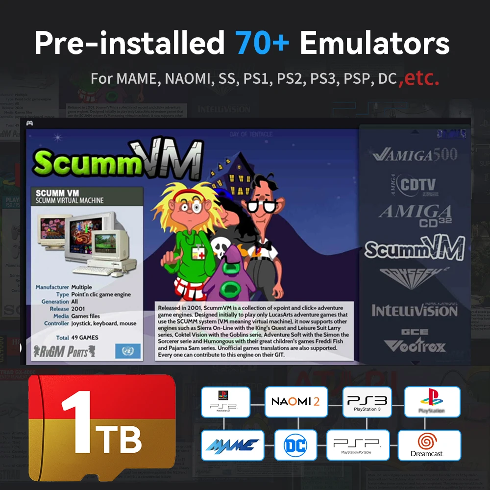 The TF game card pre-installed 70+ emulators, such as ps3,ps2,wii,gamecube,MAME,sega saturn,ps1,psp etc.