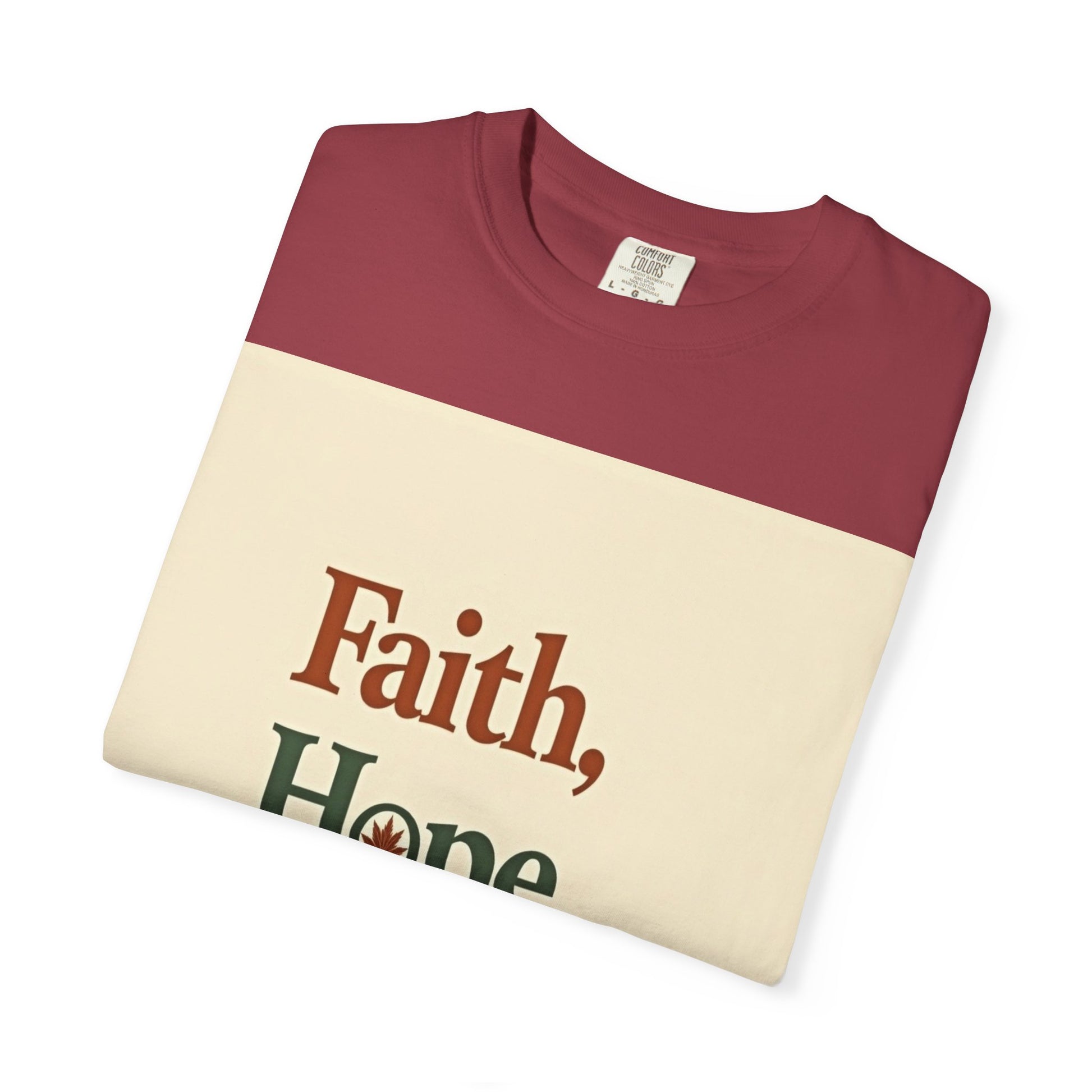 Each word appears in an earthy color palette: Faith in rust orange, Hope in forest green, and Planet in slate blue. This understated combination creates a warm, natural aesthetic that complements a wide range of decor styles while keeping the message front and center.