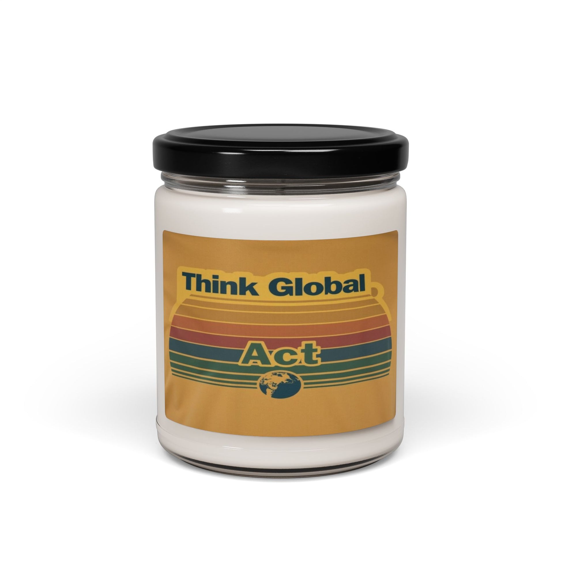 The image depicts a yellow graphic design featuring the text "Think Global" and "Act" in bold, stylized lettering. The design uses a gradient of warm colors including yellow, orange, brown, red, and green, creating a sunset-like effect across horizontal stripes. At the bottom of the design is a small globe icon, emphasizing the global theme of the graphic. The text and visual elements are positioned on what appears to be a mustard-yellow fabric or surface, likely a t-shirt or poster. The overall aesthetic suggests an environmentally conscious or globally-minded message with a retro, vintage-inspired color palette.