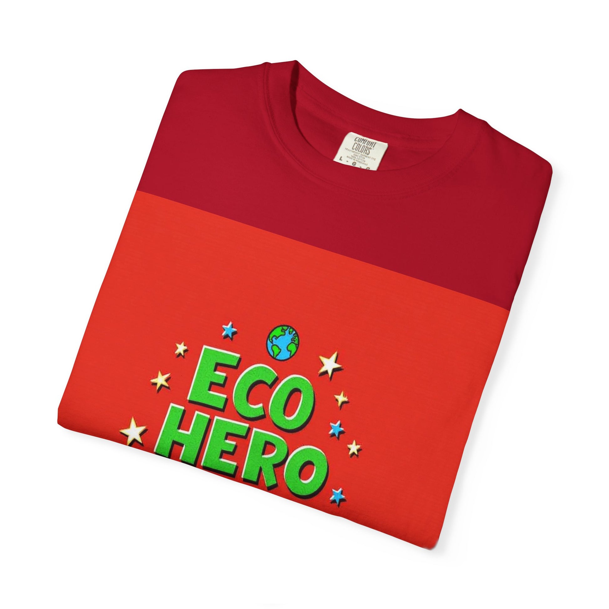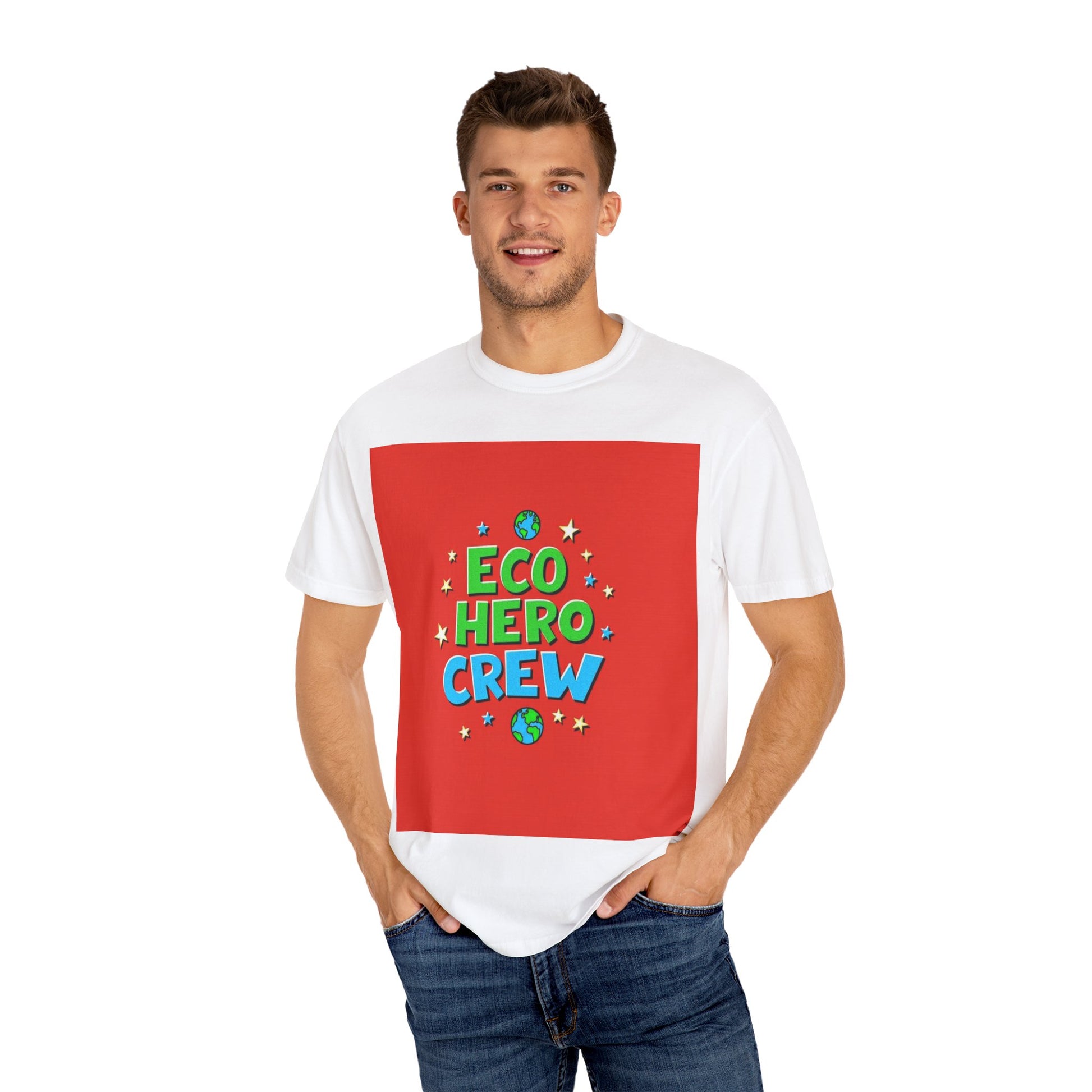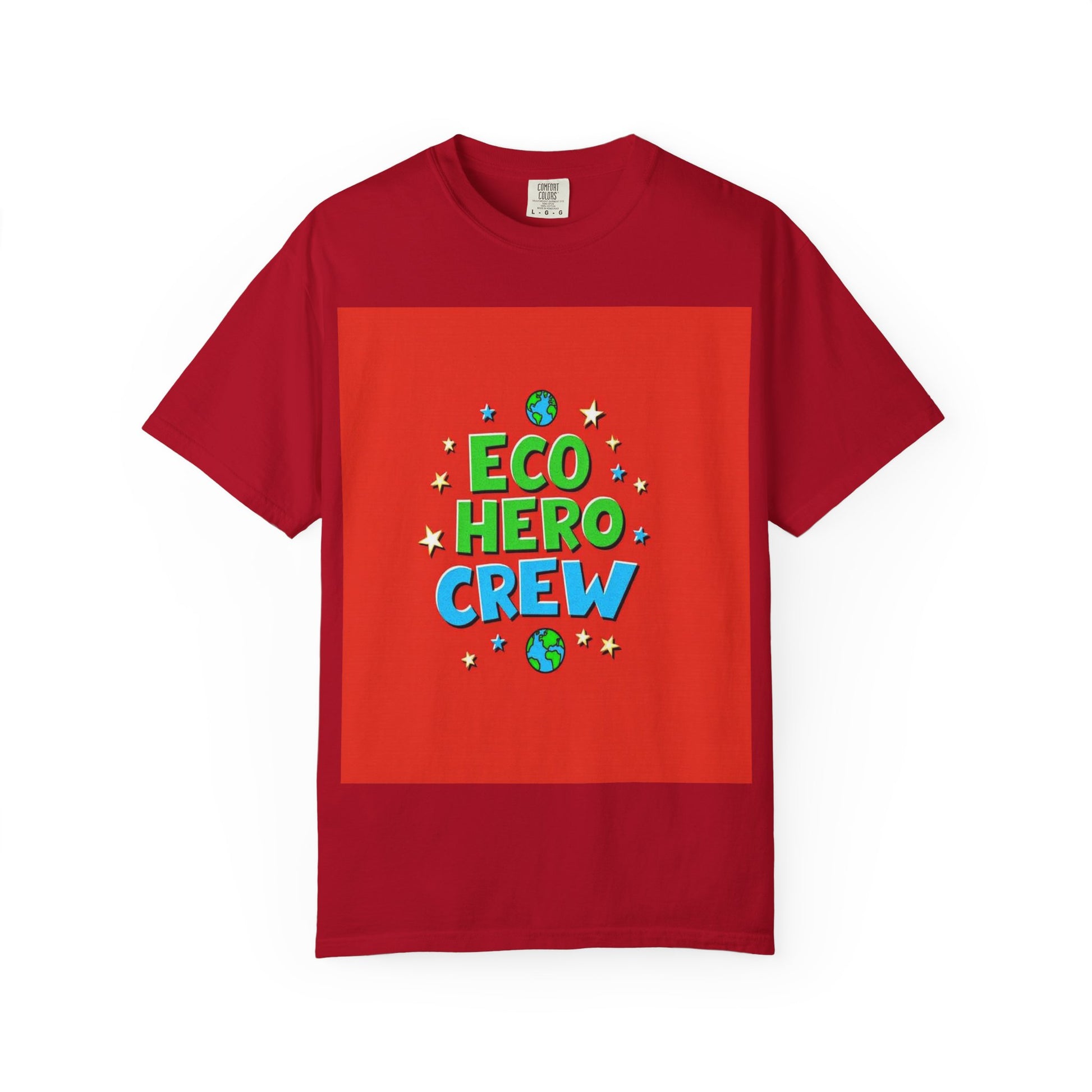 The image features a vibrant graphic design with the text "ECO HERO CREW" displayed in bold, playful lettering against a bright red background. The words are styled in green and blue, with "ECO HERO" in green and "CREW" in blue, giving the design a energetic and youthful feel. Surrounding the text are stylized stars in yellow and blue, along with two small planet Earth icons positioned at the top and bottom of the composition. The typography is three-dimensional and appears slightly rounded, creating a sense of depth and dynamism. The overall design suggests a fun, environmentally-focused team or concept aimed at promoting ecological awareness among children or young people.