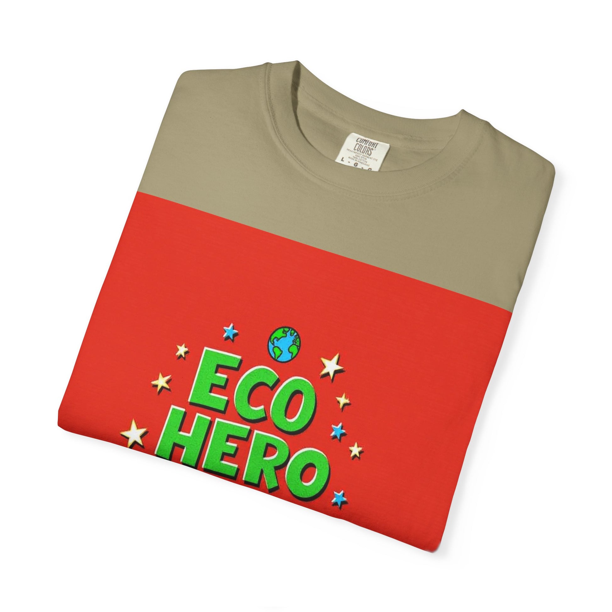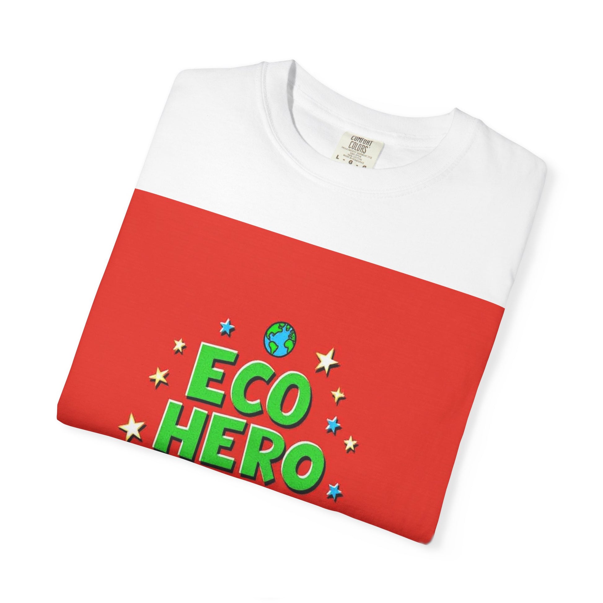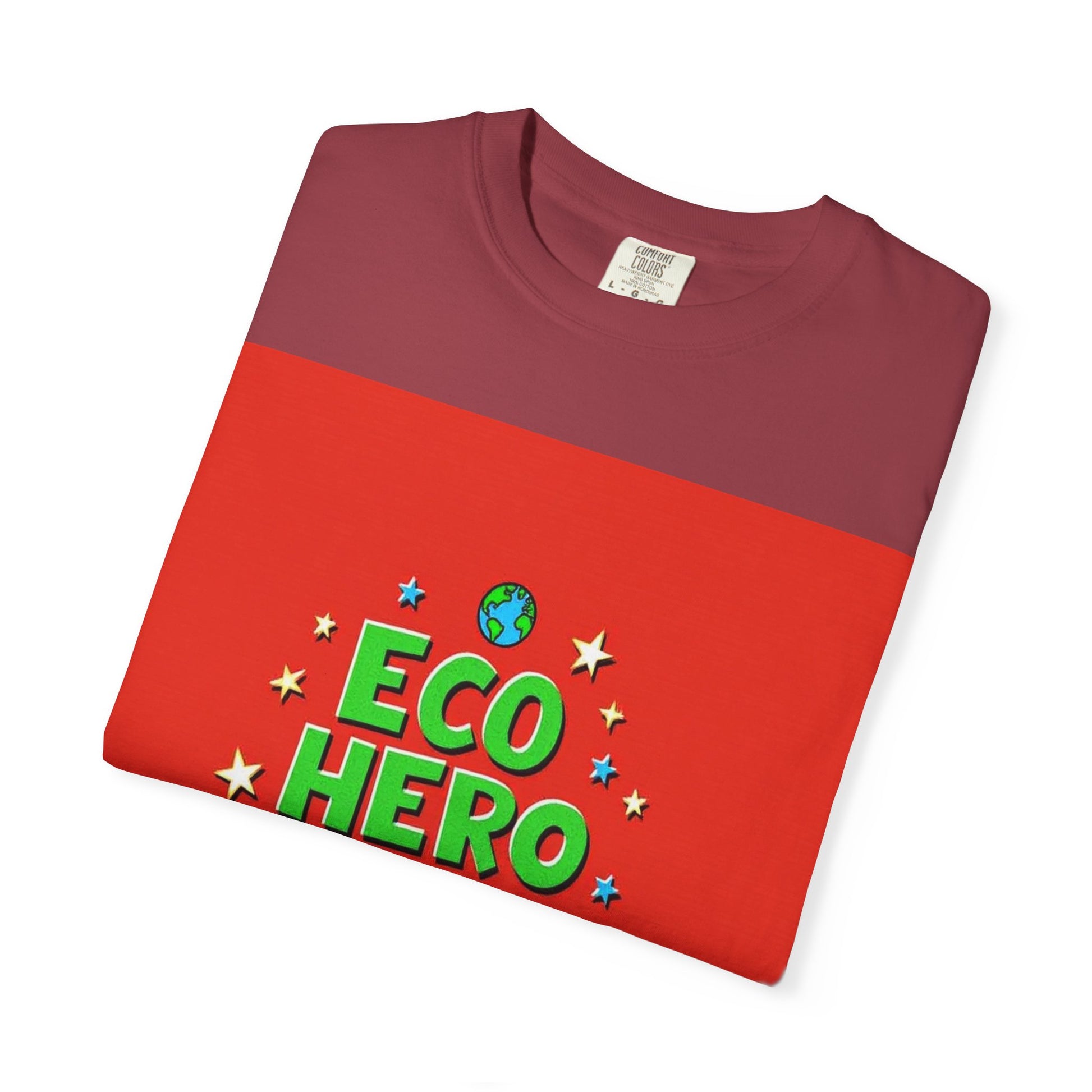 The image features a vibrant graphic design with the text "ECO HERO CREW" displayed in bold, playful lettering against a bright red background. The words are styled in green and blue, with "ECO HERO" in green and "CREW" in blue, giving the design a energetic and youthful feel. Surrounding the text are stylized stars in yellow and blue, along with two small planet Earth icons positioned at the top and bottom of the composition. The typography is three-dimensional and appears slightly rounded, creating a sense of depth and dynamism. The overall design suggests a fun, environmentally-focused team or concept aimed at promoting ecological awareness among children or young people.
