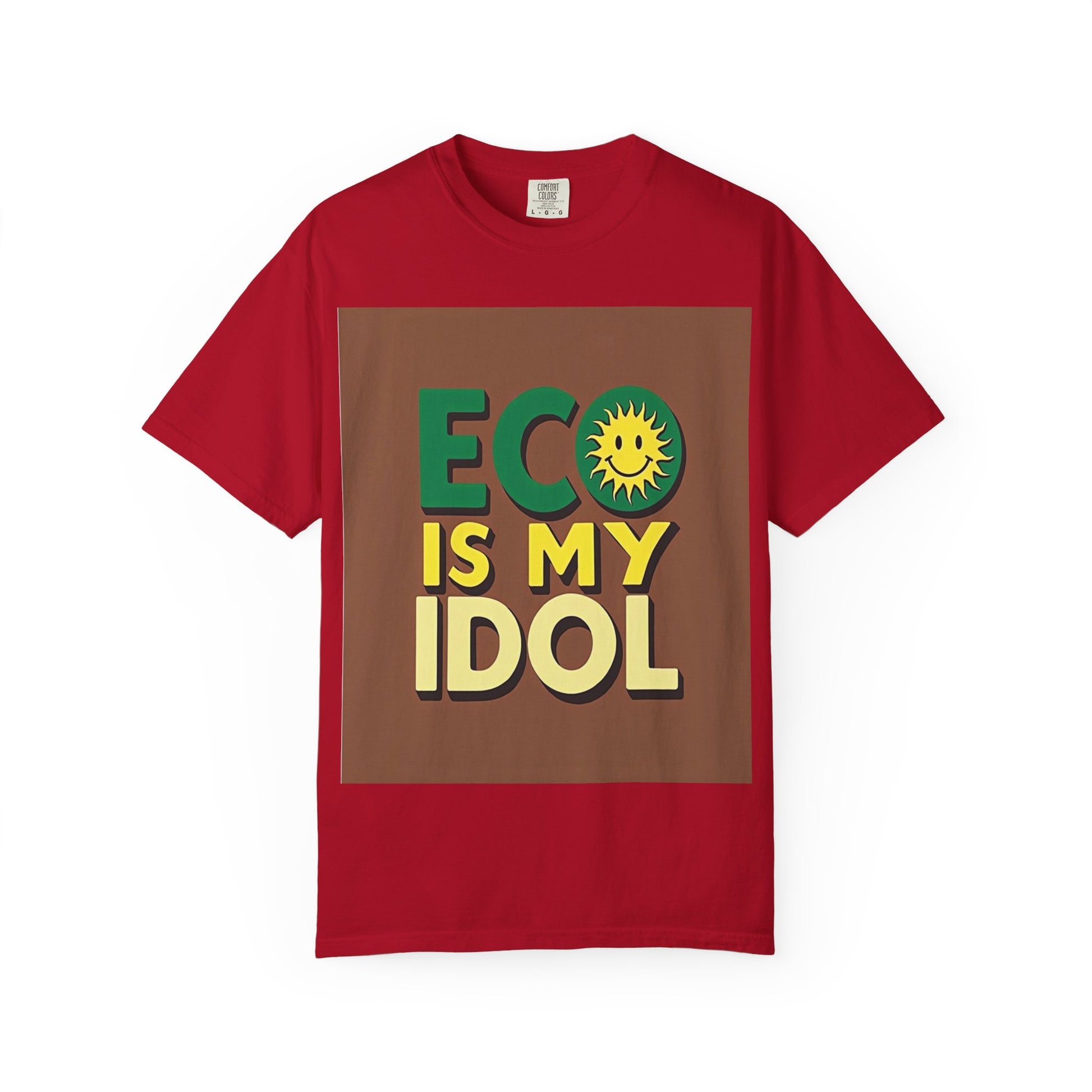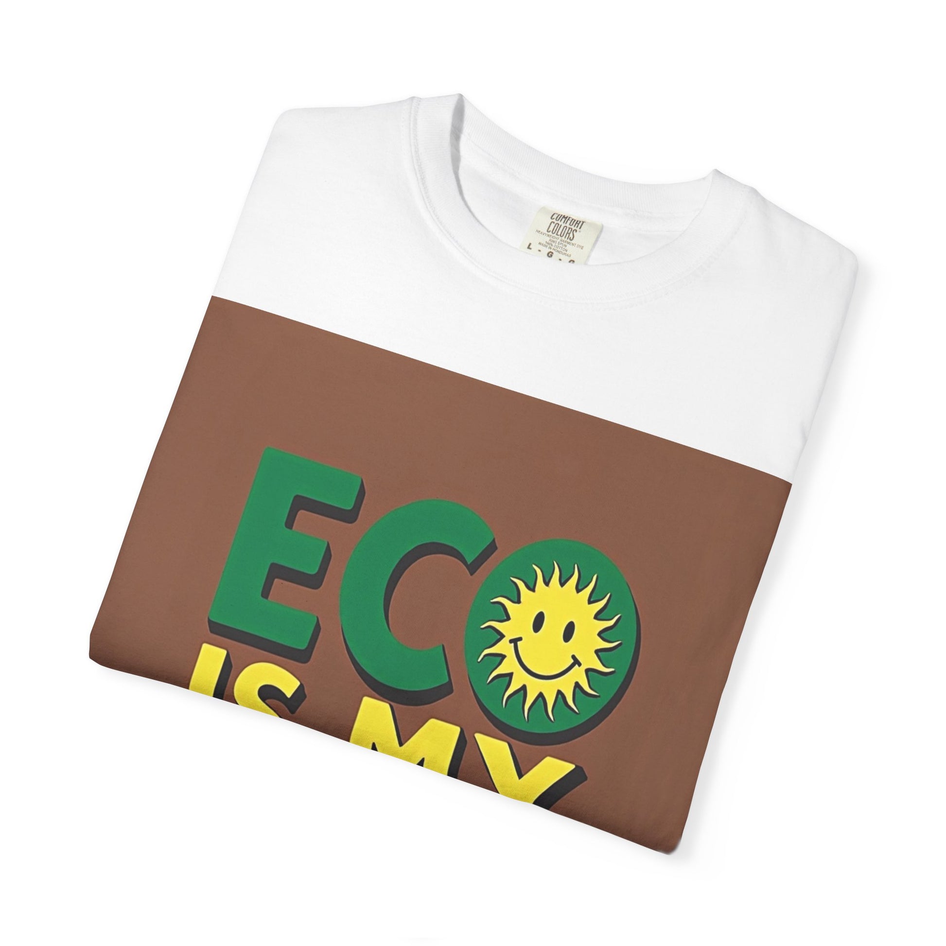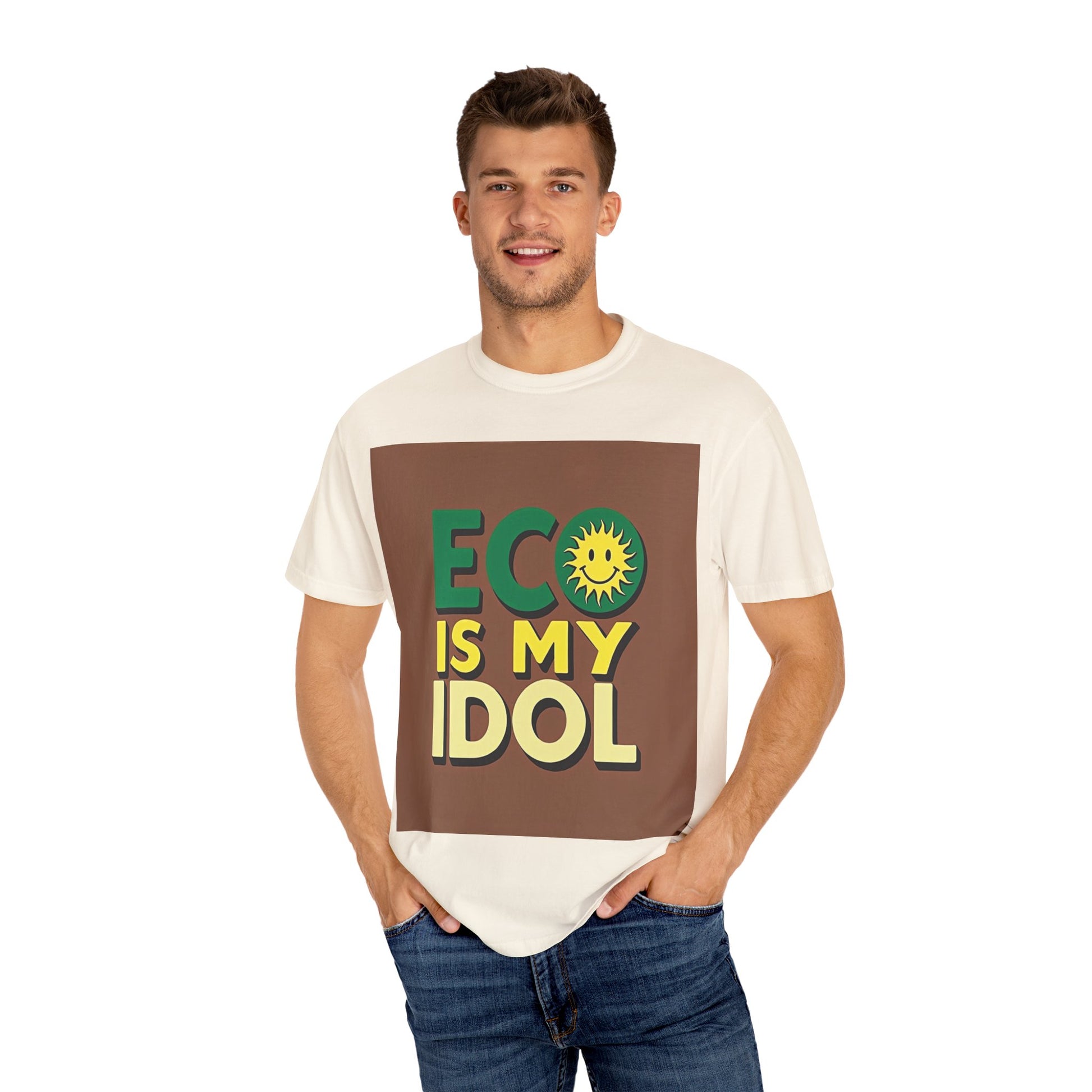 This vibrant graphic design features the text "ECO IS MY IDOL" with stylized typography against a warm brown background. The letters are rendered in green and yellow shades, giving the image a cheerful and environmentally-conscious feel. A smiling sun icon replaces the "O" in "ECO", adding a playful and optimistic element to the design. The text appears to be three-dimensional, with subtle shadowing that gives depth to each letter. The color palette and graphic style evoke a positive, eco-friendly message that celebrates environmental awareness.