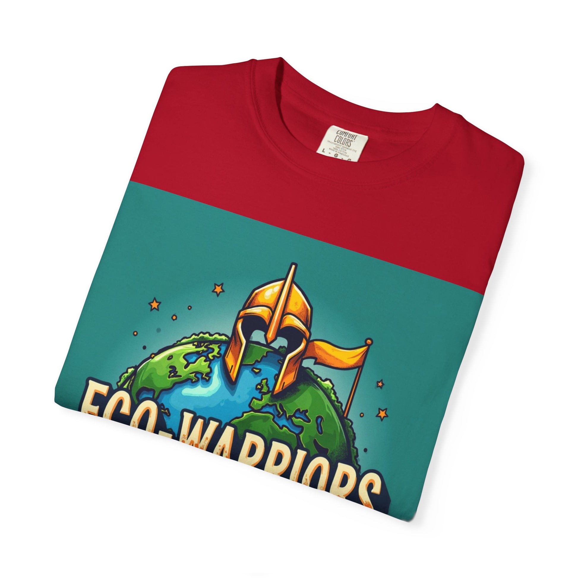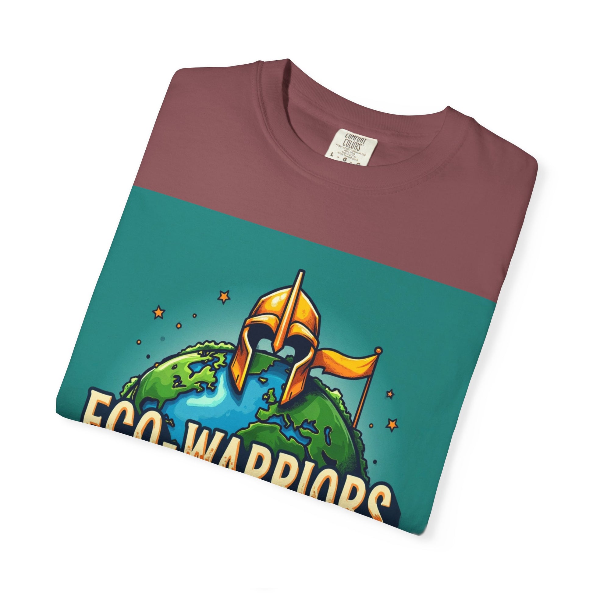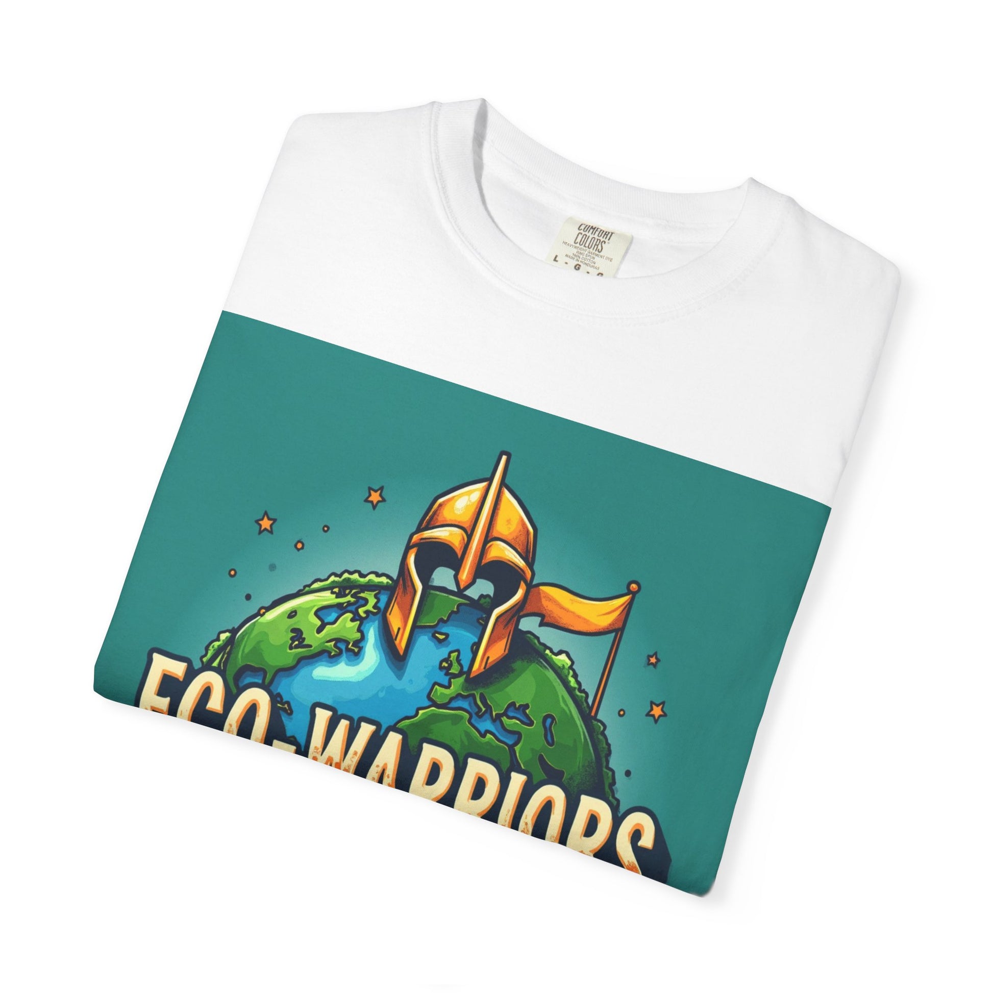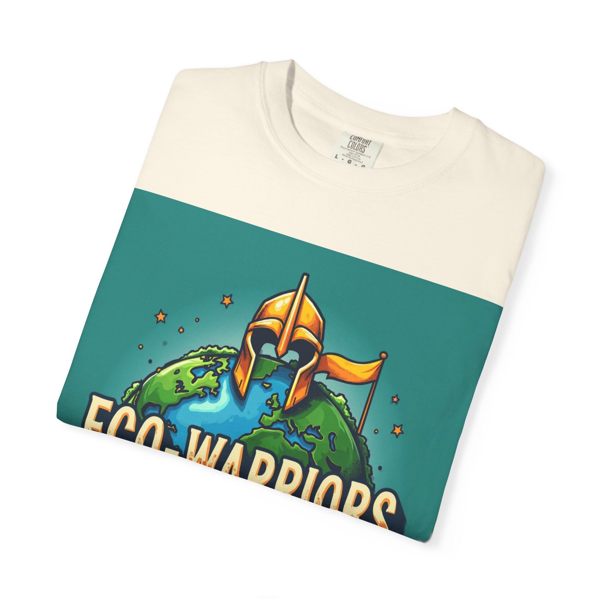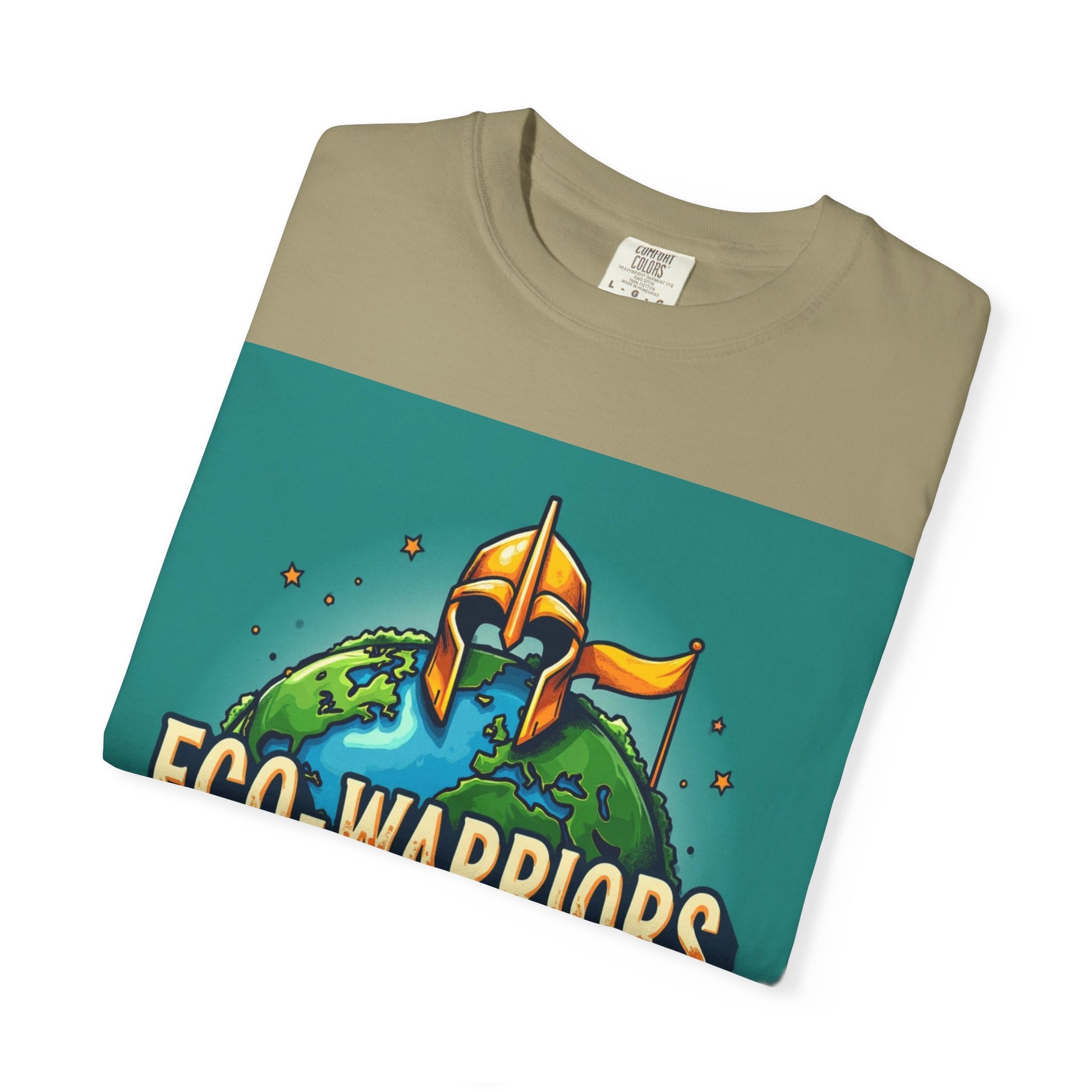 The image depicts a vibrant and stylized graphic design featuring the text "ECO-WARRIORS UNITE" against a teal background. A golden medieval-style helmet sits atop a stylized globe, symbolizing protection and global environmental stewardship. The Earth is rendered in shades of green and blue, with continents visible and a billowing yellow flag emerging from the helmet. Small stars are scattered around the design, adding a sense of dynamism and heroism to the illustration. The typography is bold and three-dimensional, with a textured, slightly worn appearance that suggests strength and resilience.