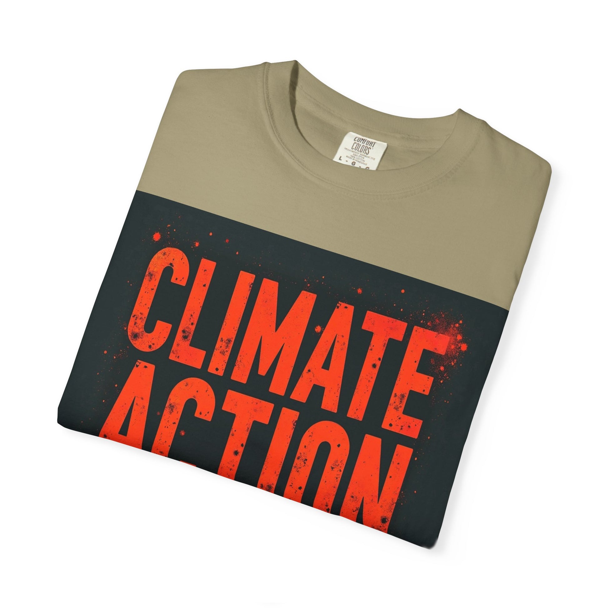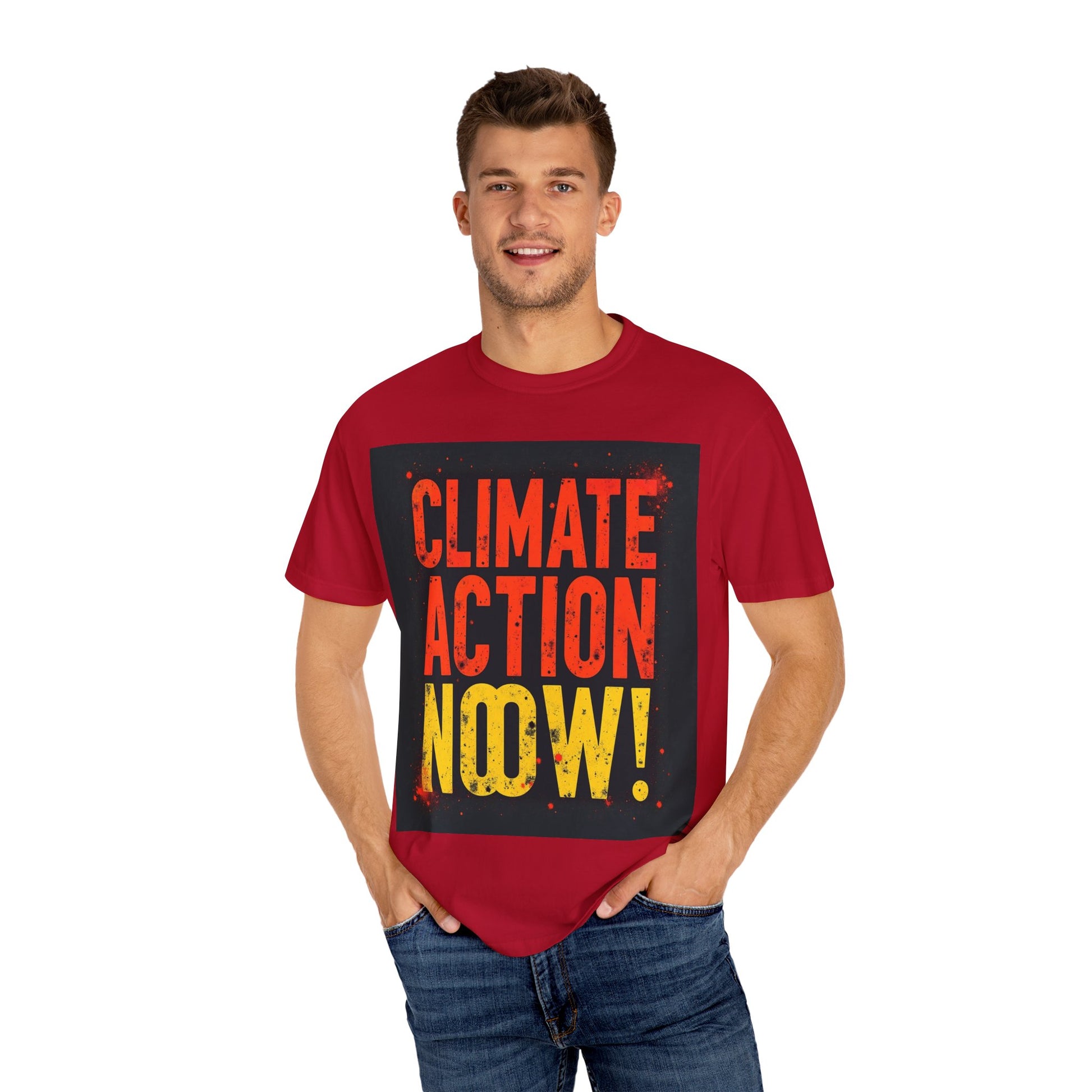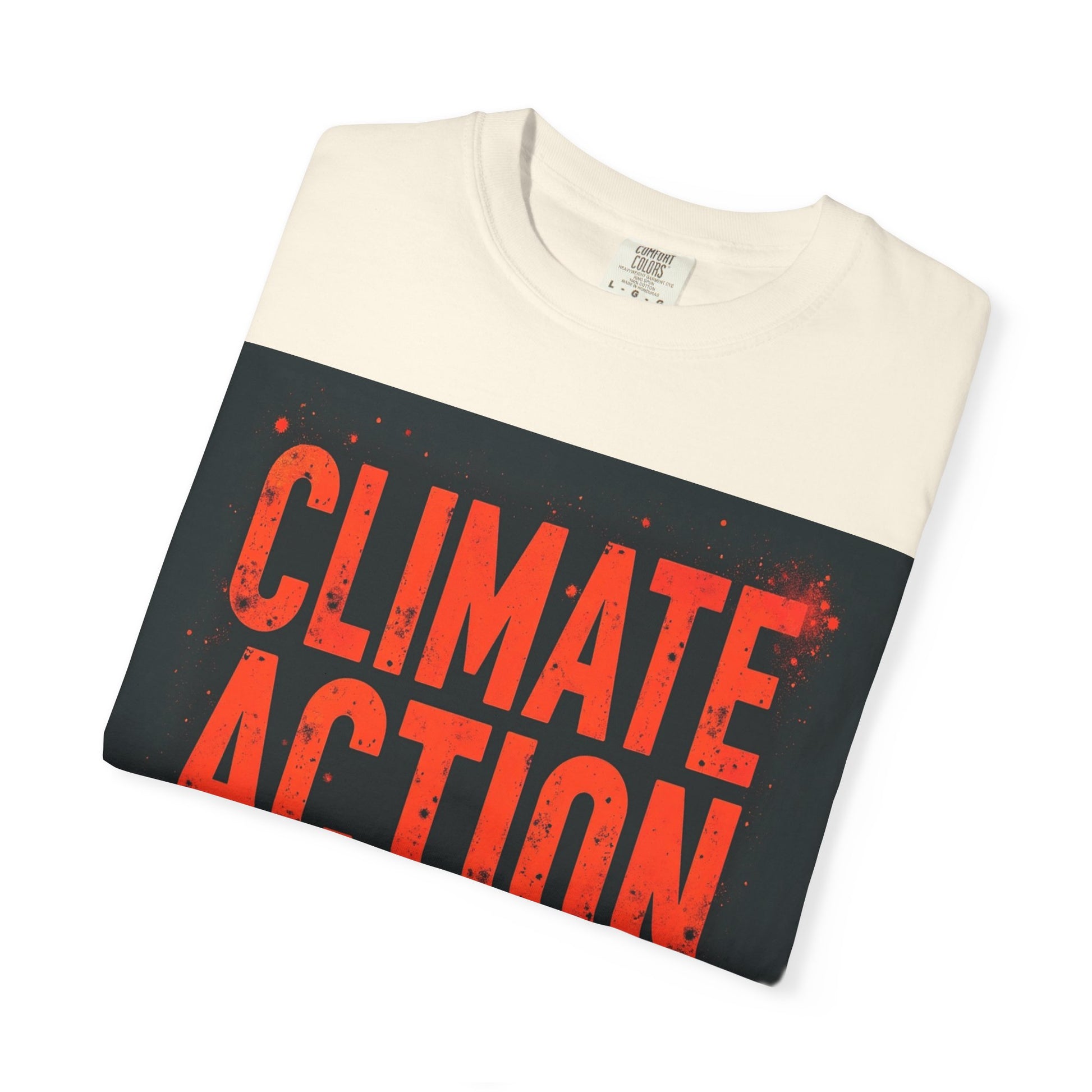 This powerful graphic design image reads "CLIMATE ACTION NOW!" in bold, uppercase letters against a dark background. The text is styled in gradient colors transitioning from orange to yellow, with a gritty, distressed texture that gives the design an urgent and intense feel. Small splattered paint or ink droplets in red and orange surround the letters, creating a sense of dynamism and emphasis. The typography is large, blocky, and impactful, designed to capture immediate attention and convey a sense of urgency about climate change. The stark color palette and aggressive design style suggests an activist or protest-oriented message calling for immediate environmental intervention.