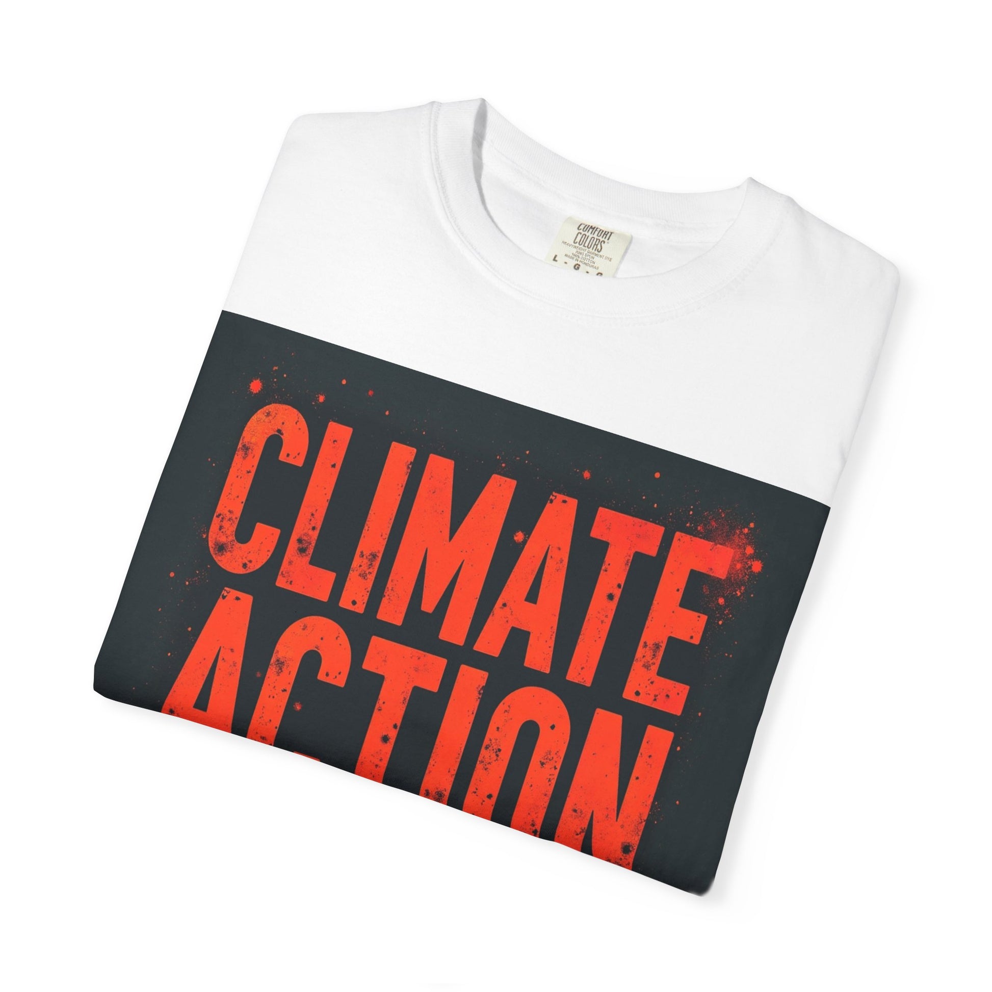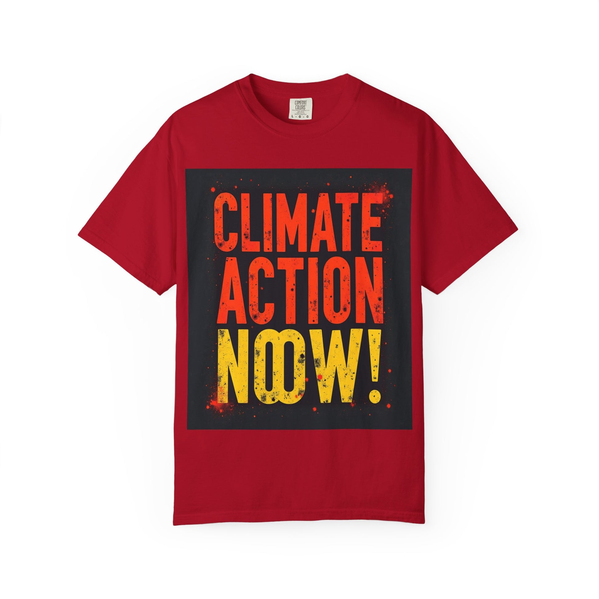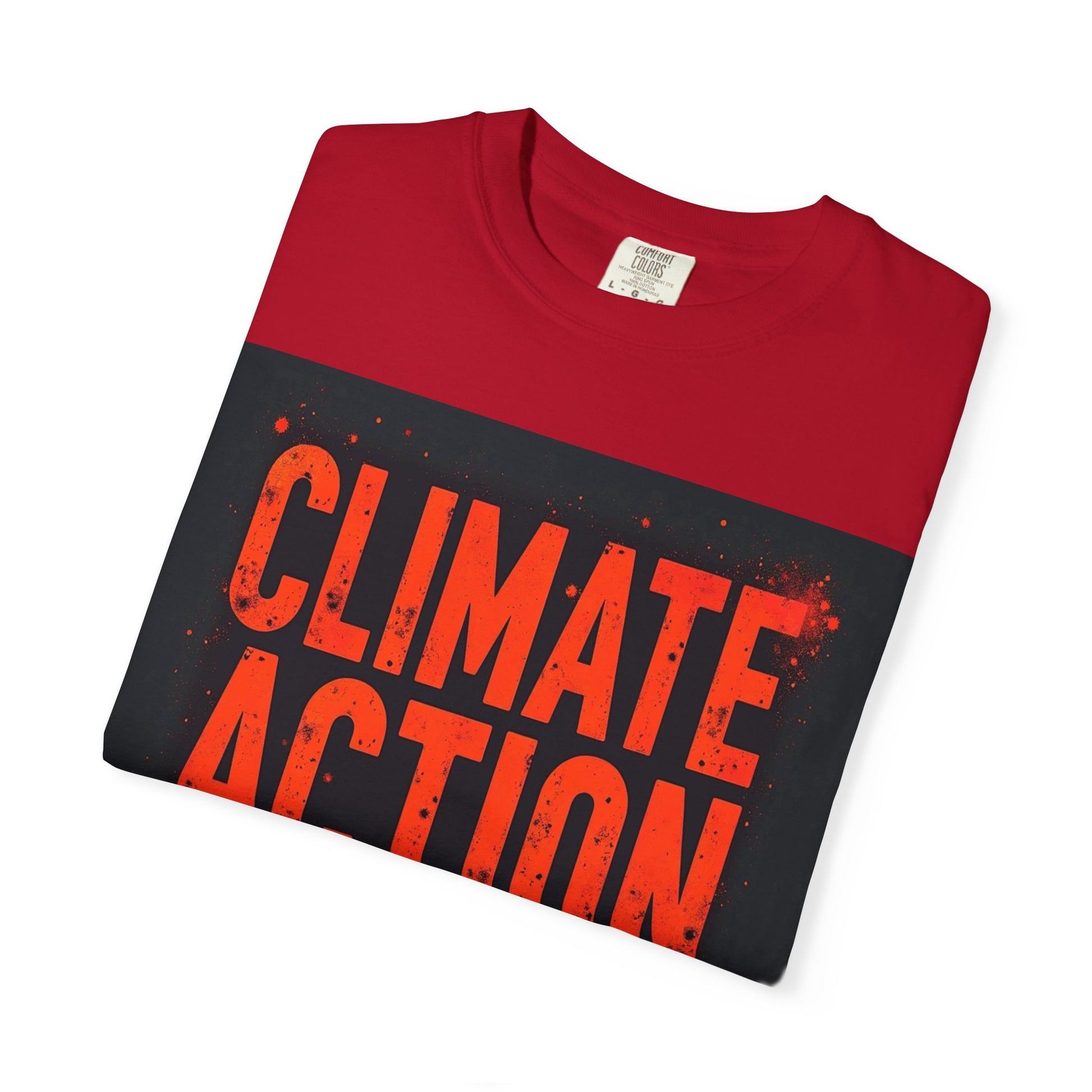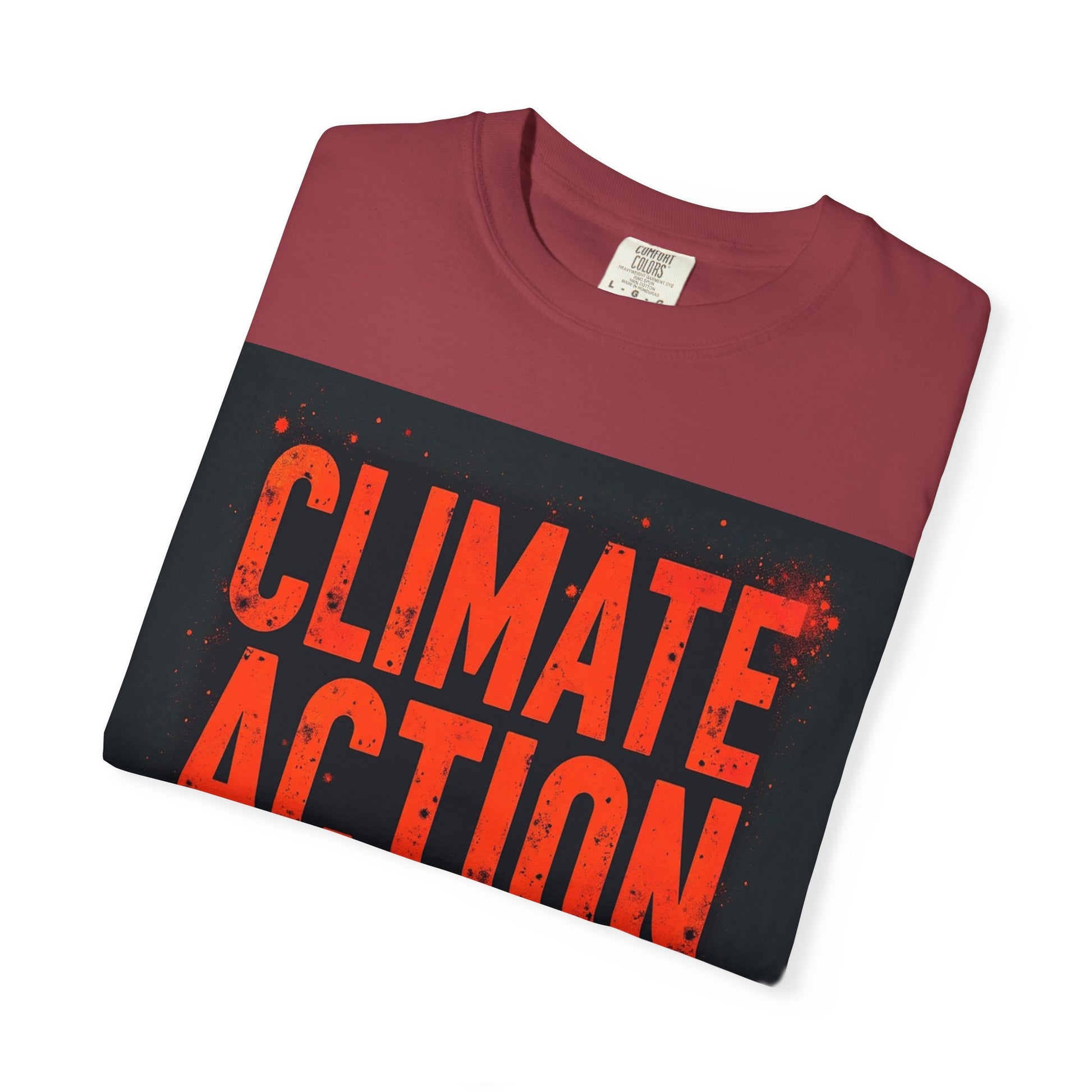 This powerful graphic design image reads "CLIMATE ACTION NOW!" in bold, uppercase letters against a dark background. The text is styled in gradient colors transitioning from orange to yellow, with a gritty, distressed texture that gives the design an urgent and intense feel. Small splattered paint or ink droplets in red and orange surround the letters, creating a sense of dynamism and emphasis. The typography is large, blocky, and impactful, designed to capture immediate attention and convey a sense of urgency about climate change. The stark color palette and aggressive design style suggests an activist or protest-oriented message calling for immediate environmental intervention.