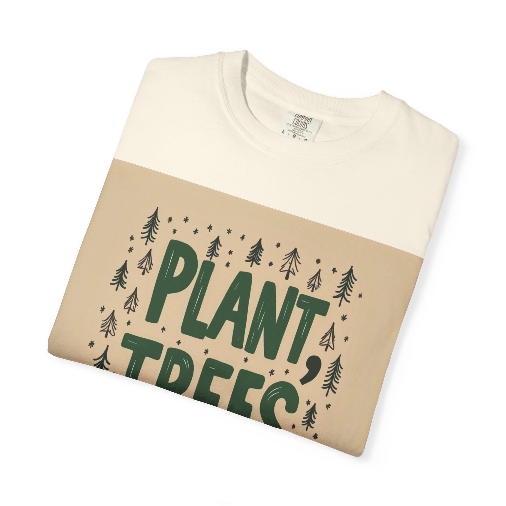 This image features a nature-inspired graphic design with the text "PLANT, TREES, PLEASE" in bold, dark green lettering. The words are centrally positioned and surrounded by a decorative border of stylized evergreen tree silhouettes in varying sizes and designs. Small star-like symbols and asterisks are scattered throughout the background, creating a whimsical and playful atmosphere. The color palette is minimalist, using a muted beige or tan background with the text and tree graphics in a deep forest green. The typography is hand-drawn and slightly chunky, giving the design a friendly, organic feel that emphasizes an environmental message about tree planting and conservation.
