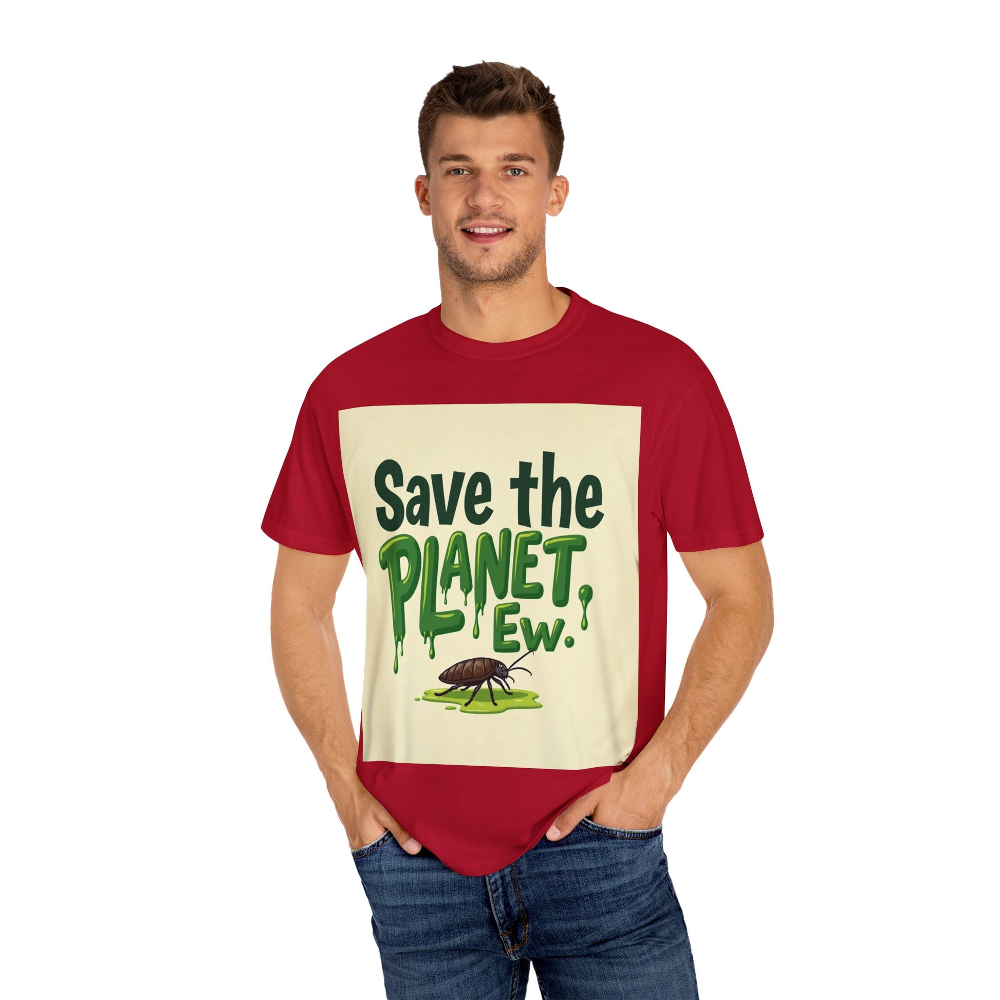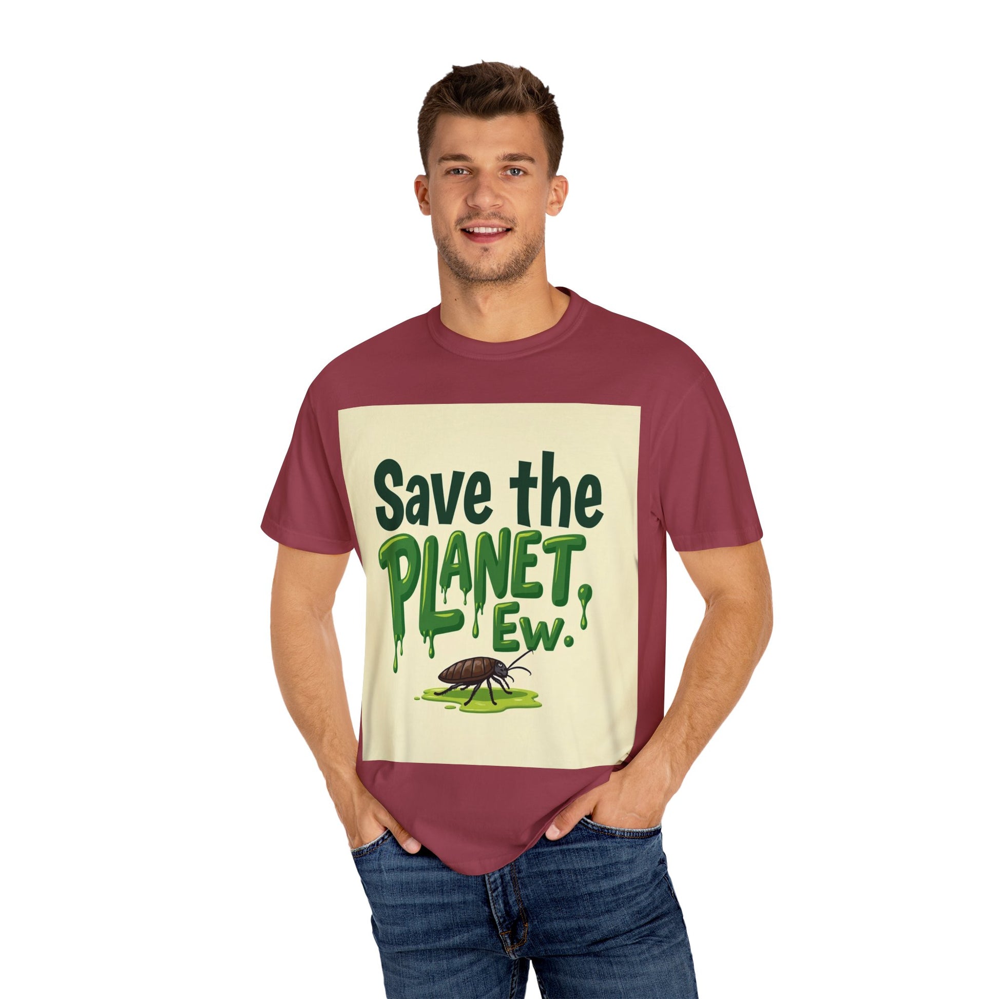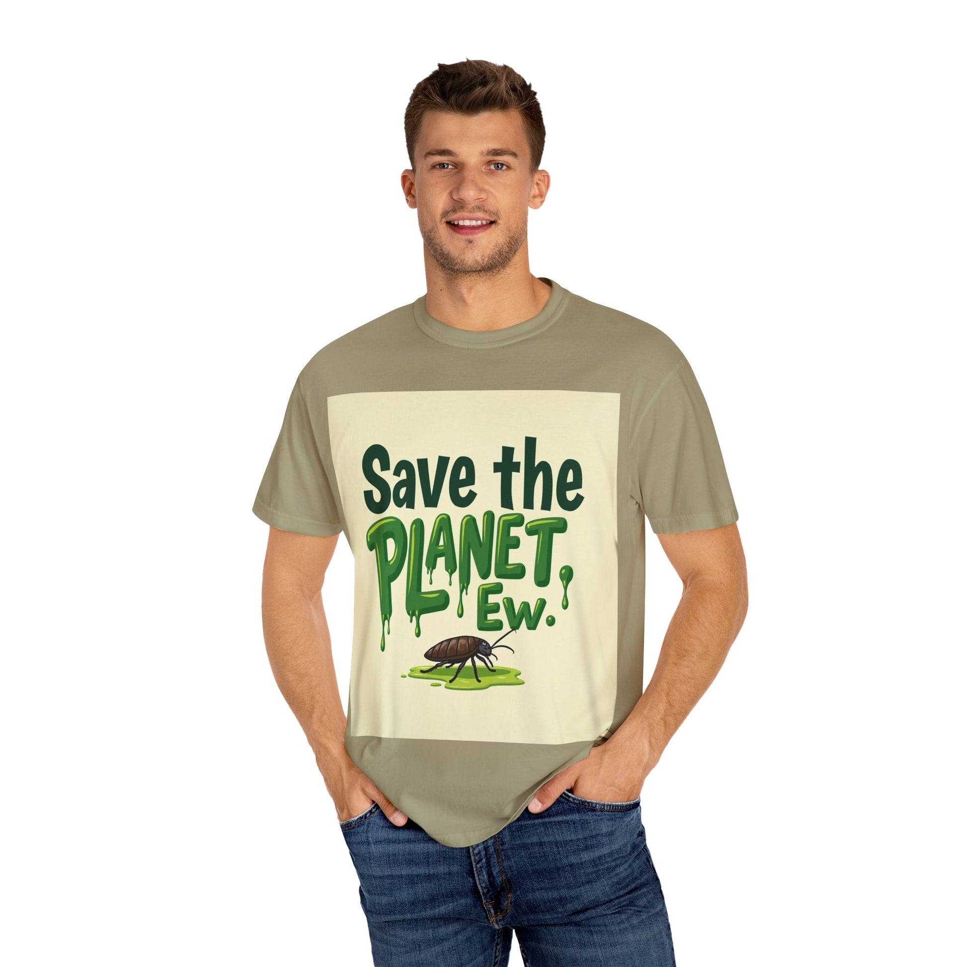 This graphic design image features a playful and environmentally conscious message "Save the Planet Ew." rendered in large, dripping green letters against a light background. The text style mimics a slimy, melting effect, emphasizing the humorous tone of the message. Below the text, a detailed illustration of a brown insect (likely a cockroach or beetle) sits on a green puddle, adding to the quirky visual narrative. The color palette consists primarily of deep and lime greens, creating a cohesive and eye-catching design. The image appears to be a graphic for a t-shirt or poster, blending environmental awareness with a comedic approach to ecological messaging.