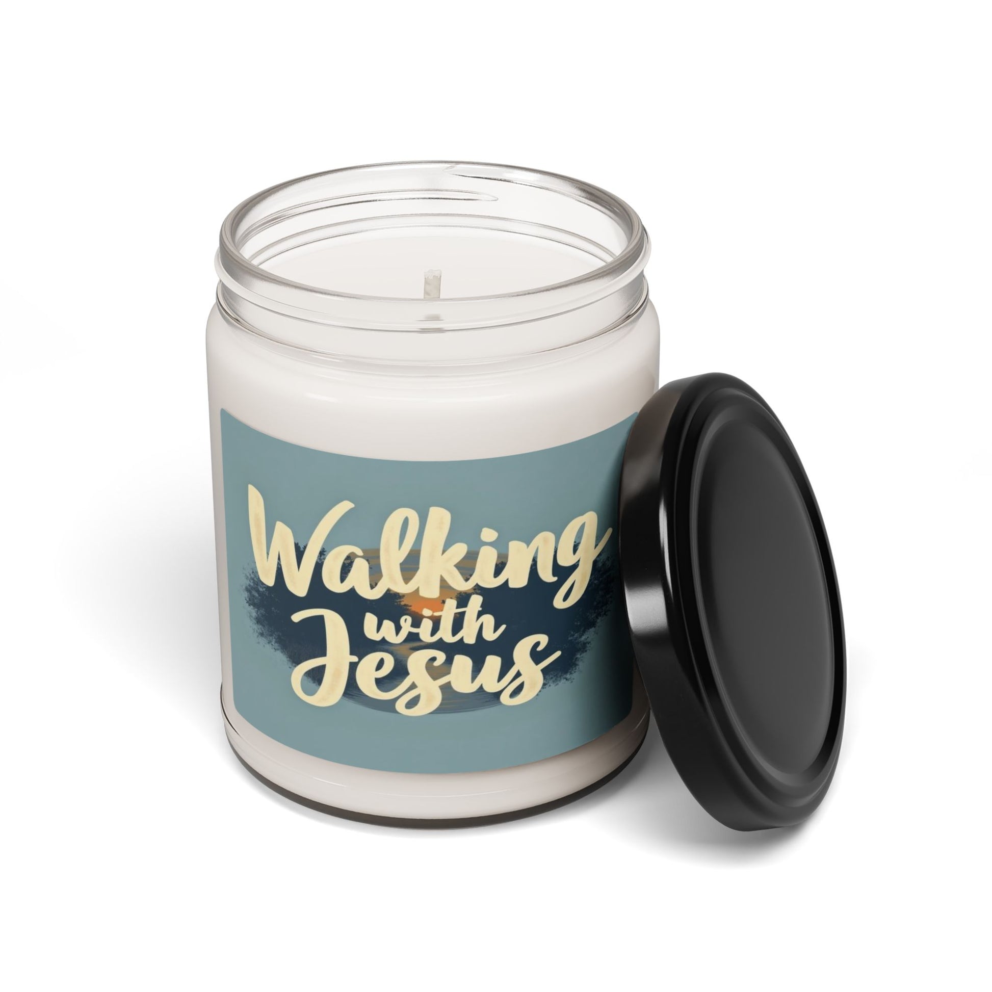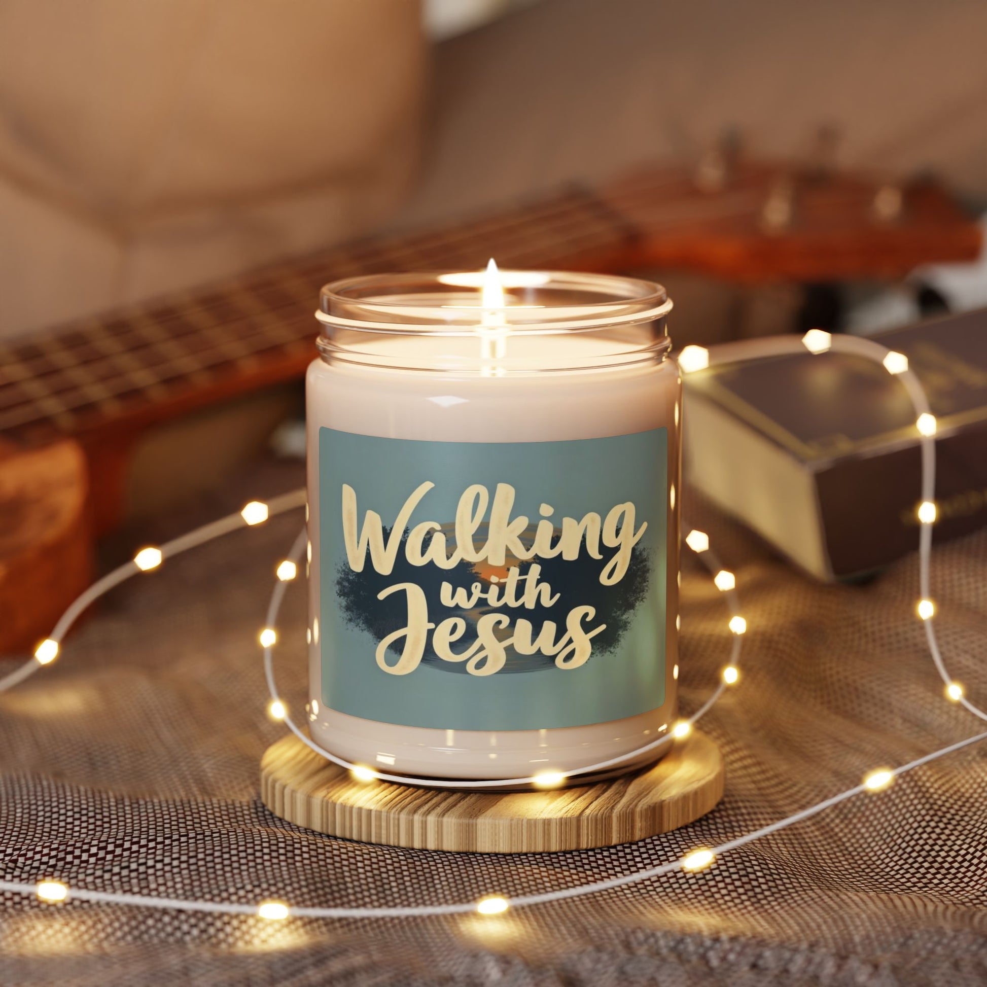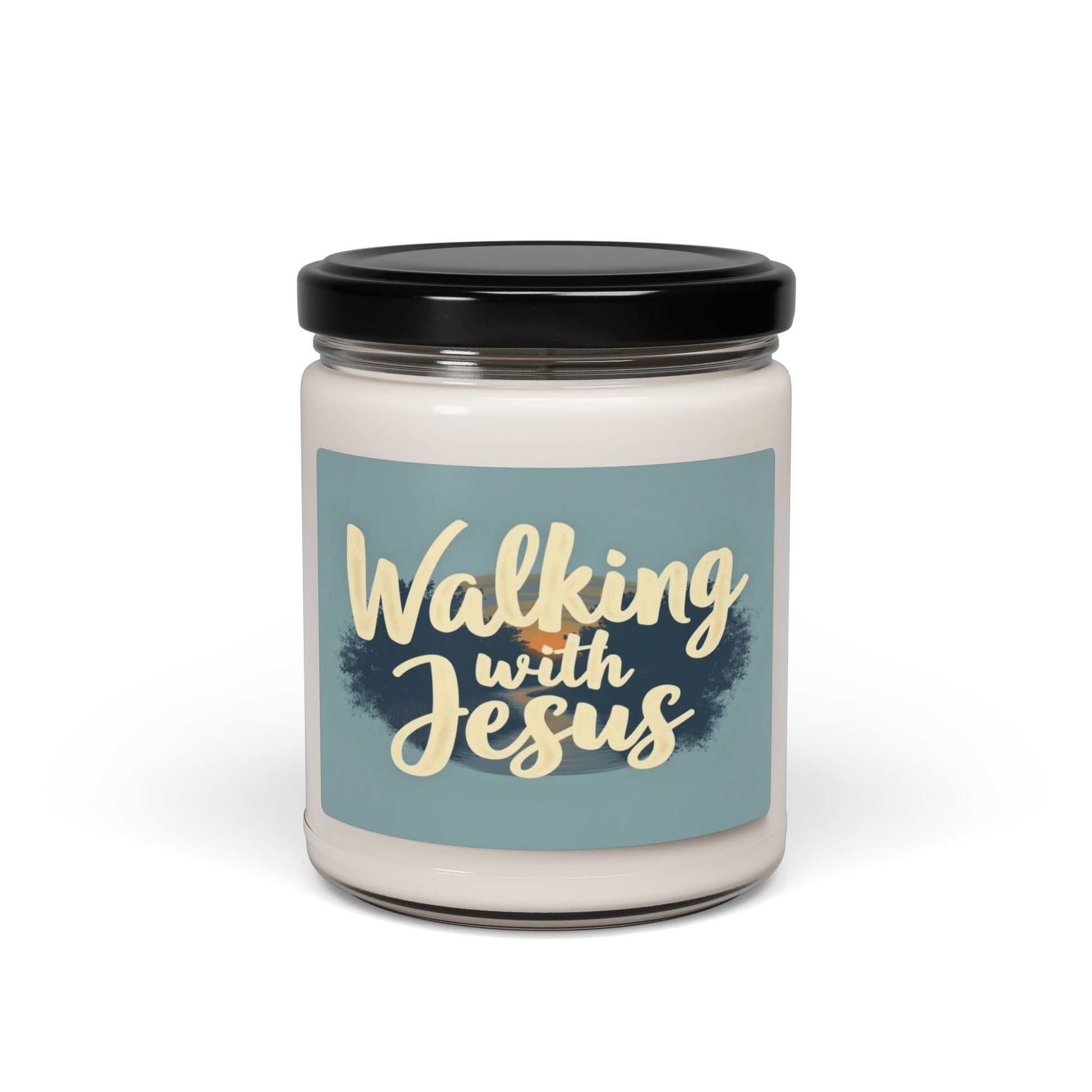 The image features the text "Walking with Jesus" in a soft, creamy-yellow cursive font against a muted blue-gray background. The typography is stylized and appears to be hand-lettered, with a smooth, flowing design that gives the phrase an intimate and personal feel. Behind the text is a blurred, impressionistic landscape with hints of trees, suggesting a serene natural setting with hints of sunset or sunrise colors. The background has a gradient effect with darker navy and blue tones blending into lighter blue-gray areas, creating depth and visual interest. The overall design has a peaceful, inspirational aesthetic that seems to invite contemplation and spiritual reflection.