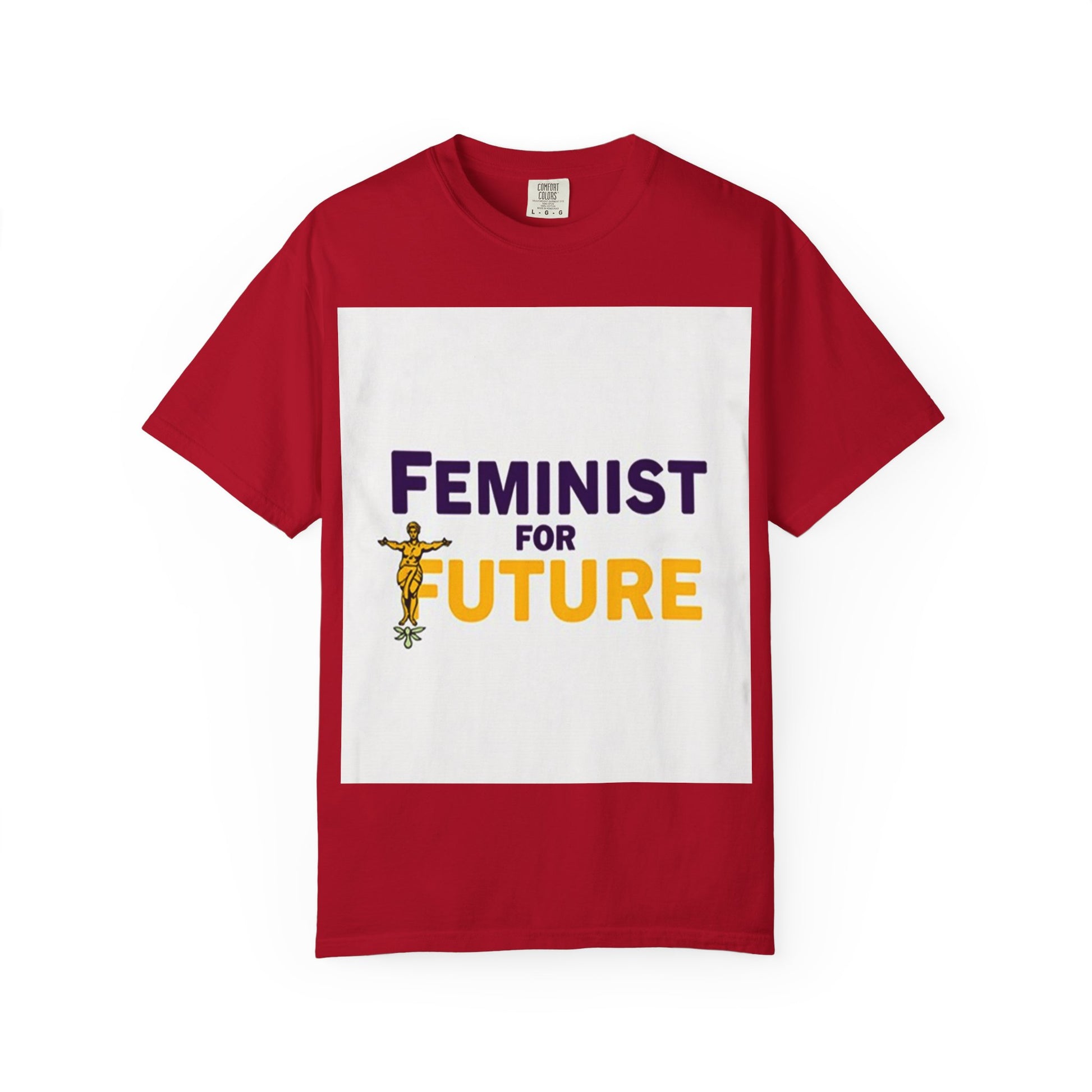 The image displays a bold graphic design with the text "FEMINIST FOR FUTURE" in purple and yellow colors. A stylized golden figure stands to the left of the text, positioned in an open, expansive pose reminiscent of classical statue positioning. The figure appears to be standing on a small base or platform, with arms outstretched in a gesture of empowerment or liberation. The design uses a clean, minimalist aesthetic with a white background, creating high contrast with the vibrant text colors. The graphic seems to combine feminist messaging with a forward-looking, progressive vision for the future.