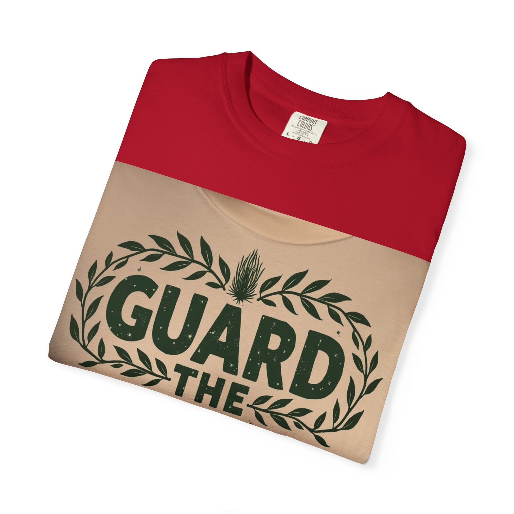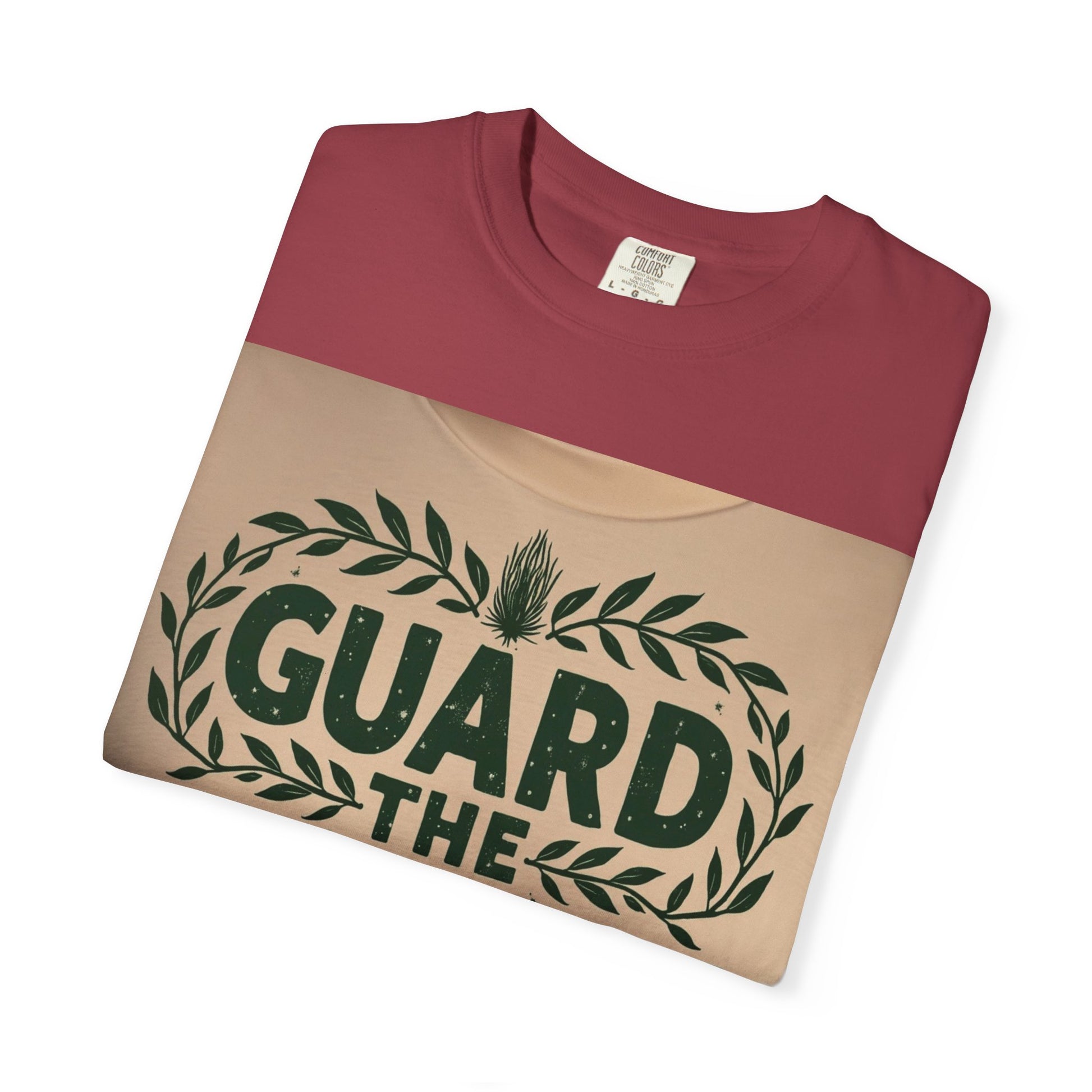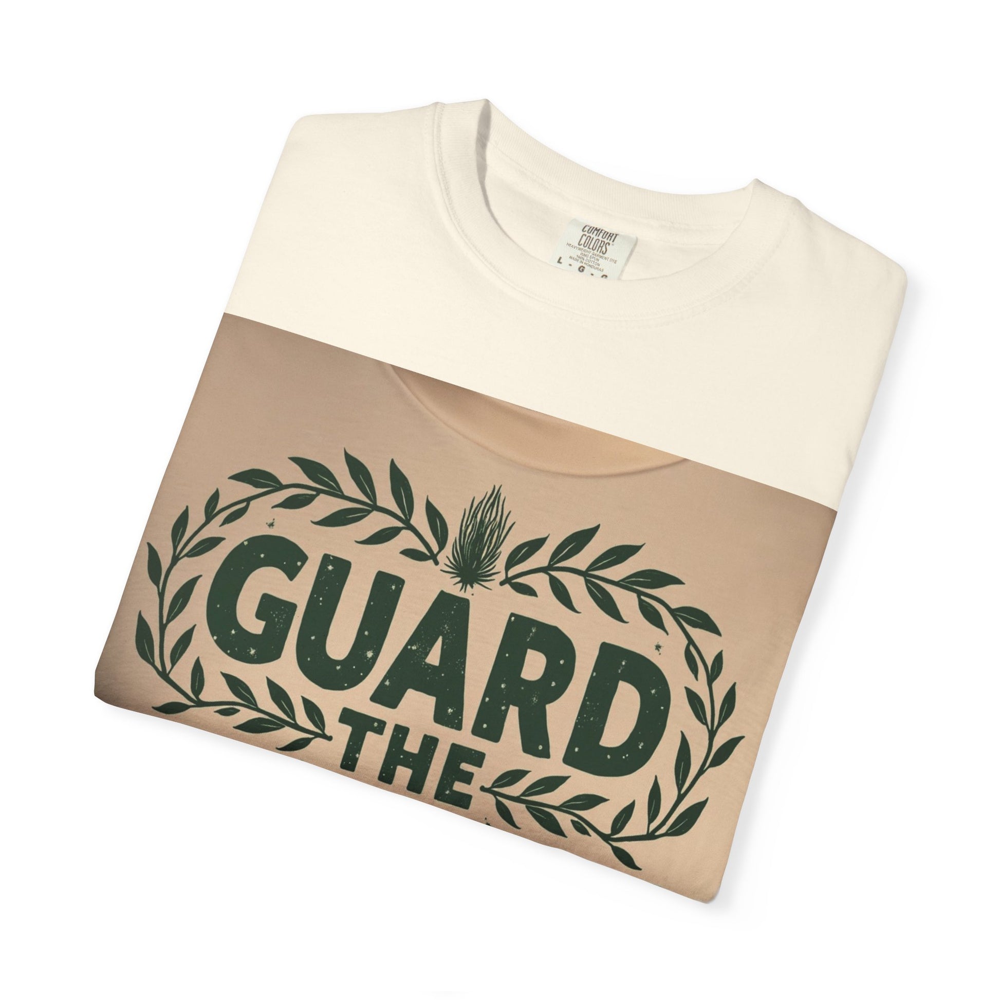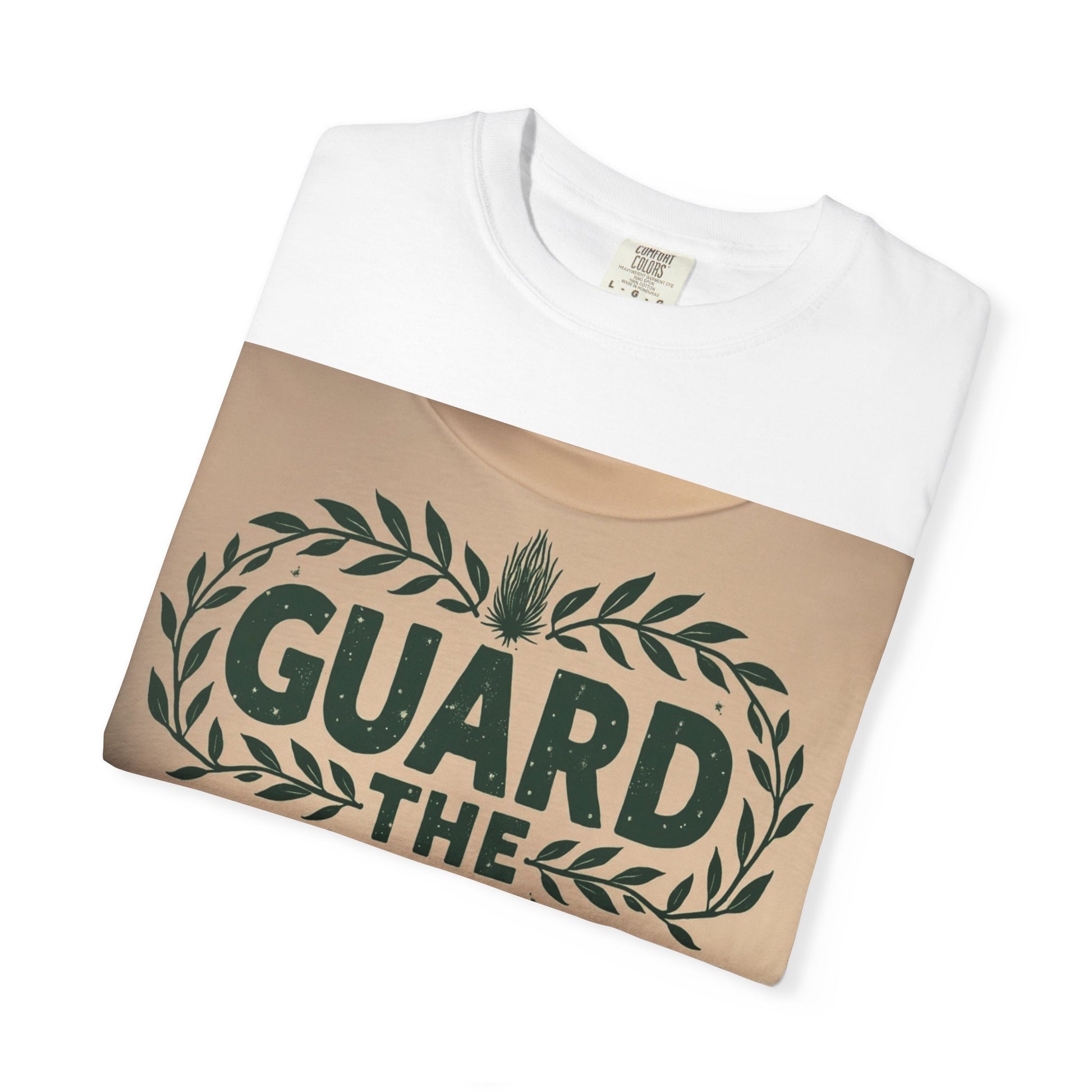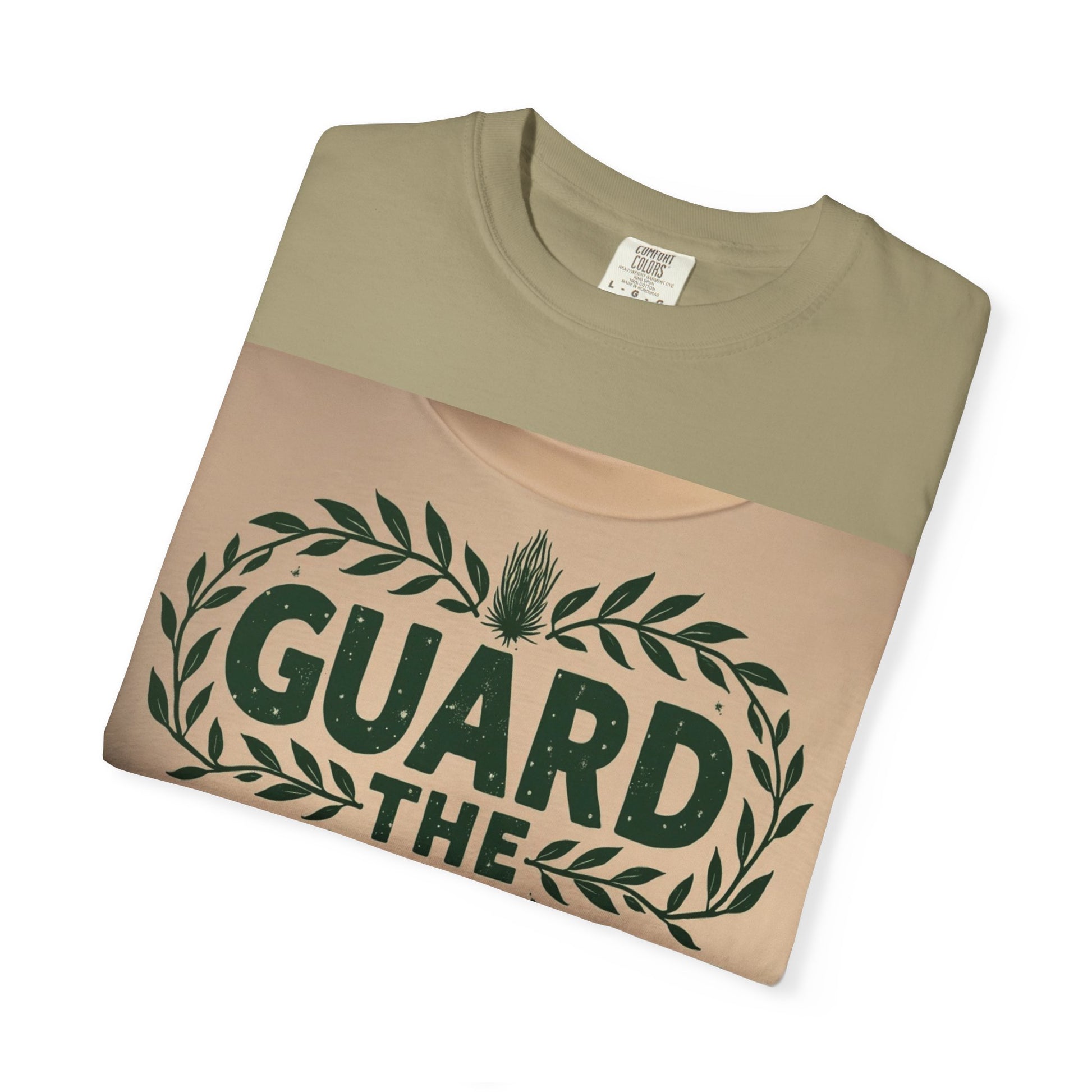 This graphic design appears on what seems to be a light beige or cream-colored textile, featuring the text "GUARD THE GARDEN" in bold, dark green letters. The typography is surrounded by an elegant laurel wreath-style border composed of stylized green leaves, creating a symmetrical and decorative frame. At the top and bottom of the text, there are two unique plant or botanical illustrations that resemble spiky, textured botanical forms, adding visual interest to the design. The letters have a slightly distressed or textured appearance, giving the graphic a vintage or hand-crafted aesthetic. The overall color palette is minimal, using only dark green against a neutral background, which creates a clean and impactful visual presentation.