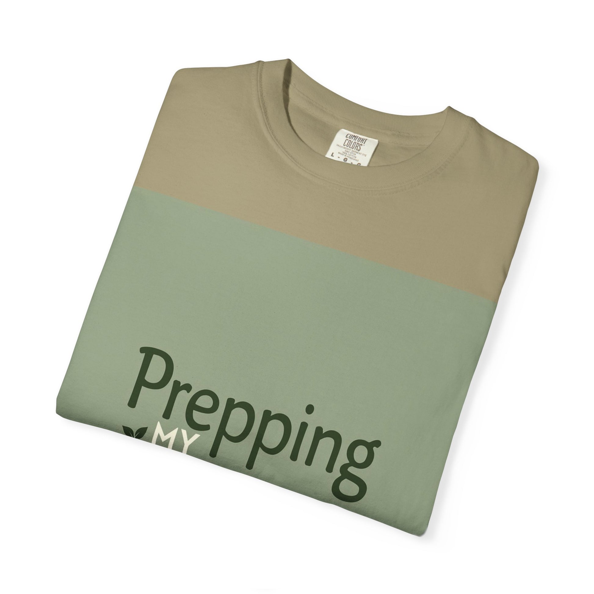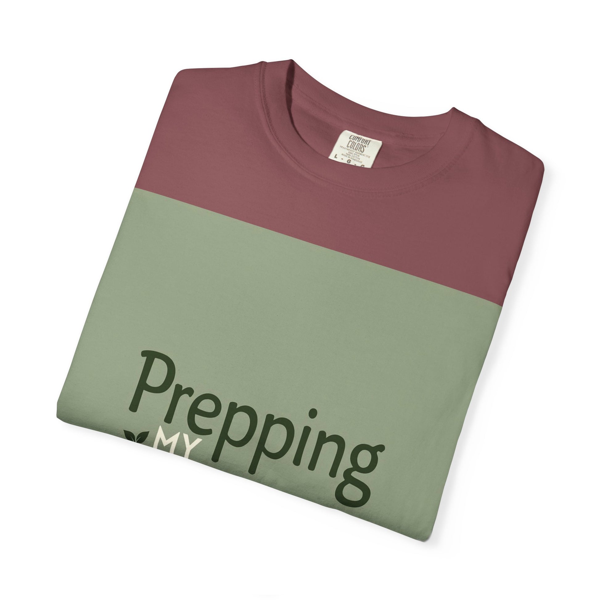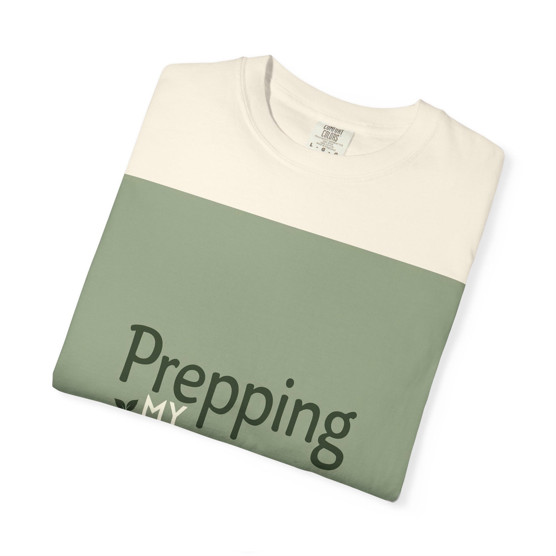 The image is a minimalist graphic design featuring the text "Prepping MY GARDEN" on a sage green background. The words are styled in a clean, modern typography with "Prepping" in a darker green and "MY GARDEN" in a light cream color. A small leaf sprout icon is nestled between "MY" and "GARDEN", adding a subtle botanical touch to the design. The color palette evokes a sense of nature and gardening, with soft, earthy green tones. The design appears to be a logo or title graphic for a gardening-related project or content.