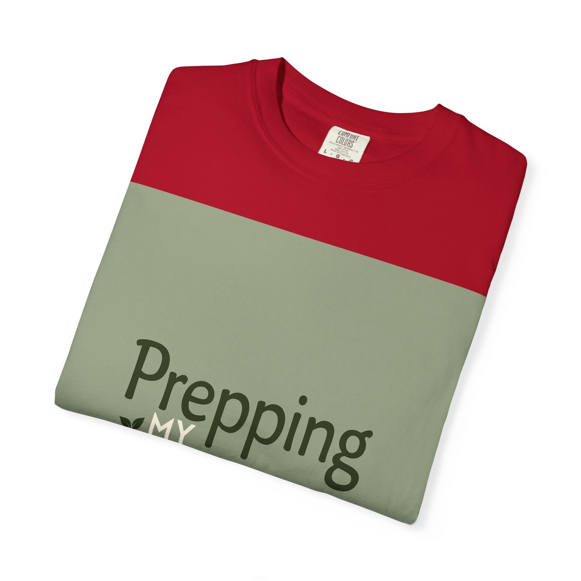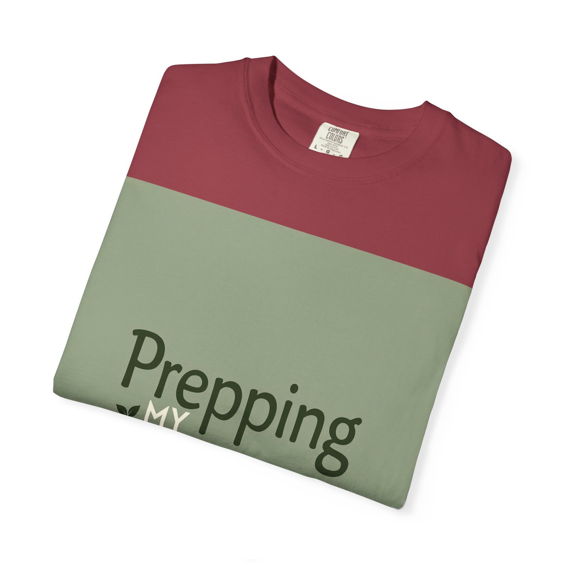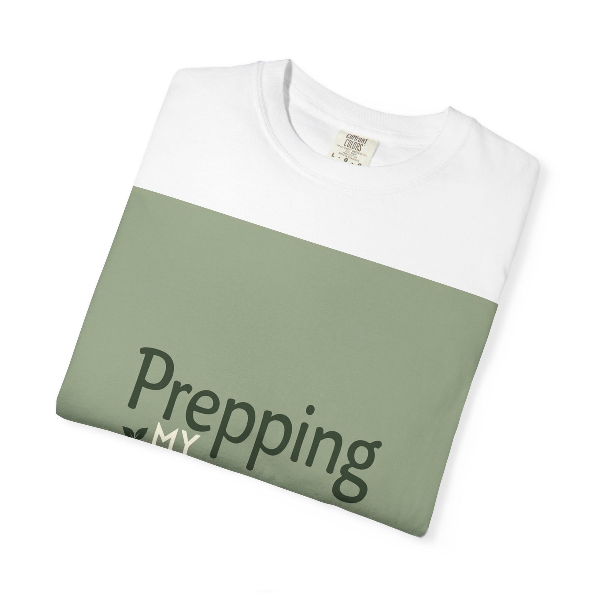 The image is a minimalist graphic design featuring the text "Prepping MY GARDEN" on a sage green background. The words are styled in a clean, modern typography with "Prepping" in a darker green and "MY GARDEN" in a light cream color. A small leaf sprout icon is nestled between "MY" and "GARDEN", adding a subtle botanical touch to the design. The color palette evokes a sense of nature and gardening, with soft, earthy green tones. The design appears to be a logo or title graphic for a gardening-related project or content.