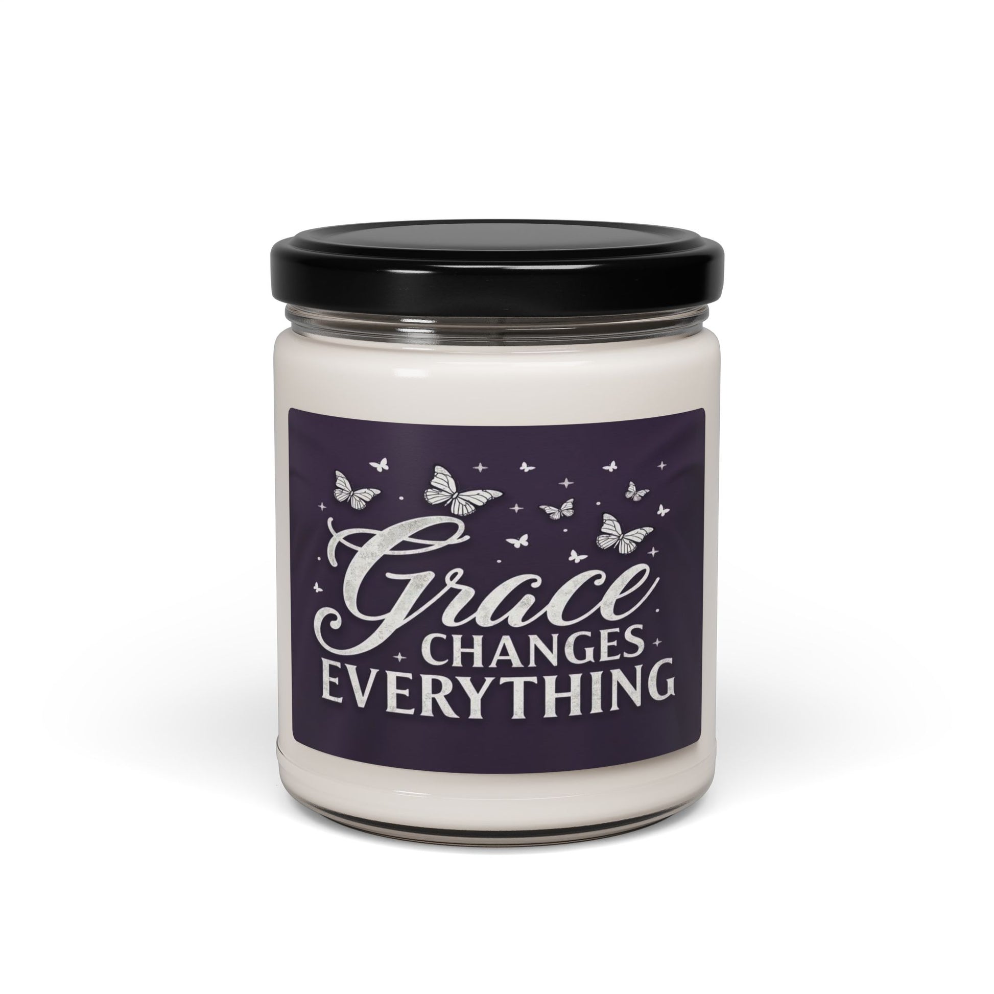 This graphic design features the inspirational text "Grace Changes Everything" in an elegant, cursive white typography against a deep purple background. Surrounding the text are multiple white butterflies of varying sizes, creating a delicate and ethereal visual effect. The design incorporates small star-like elements interspersed among the butterflies, adding a subtle sense of sparkle and dimension. The text is rendered with a slightly distressed or textured finish, giving it a vintage or worn aesthetic. The overall color palette and composition create a serene, uplifting, and motivational visual message.
