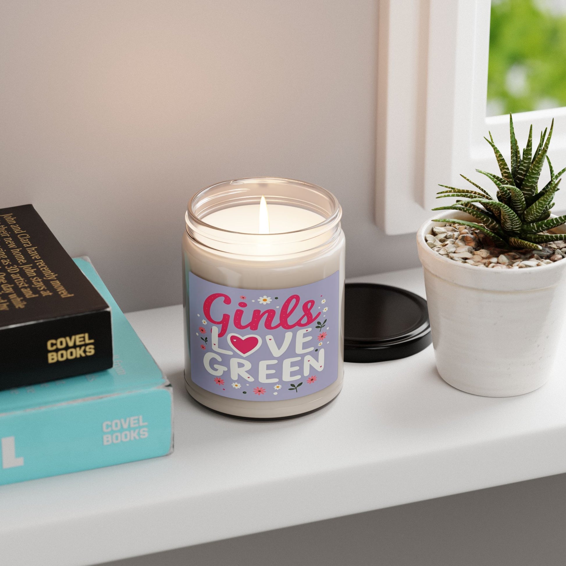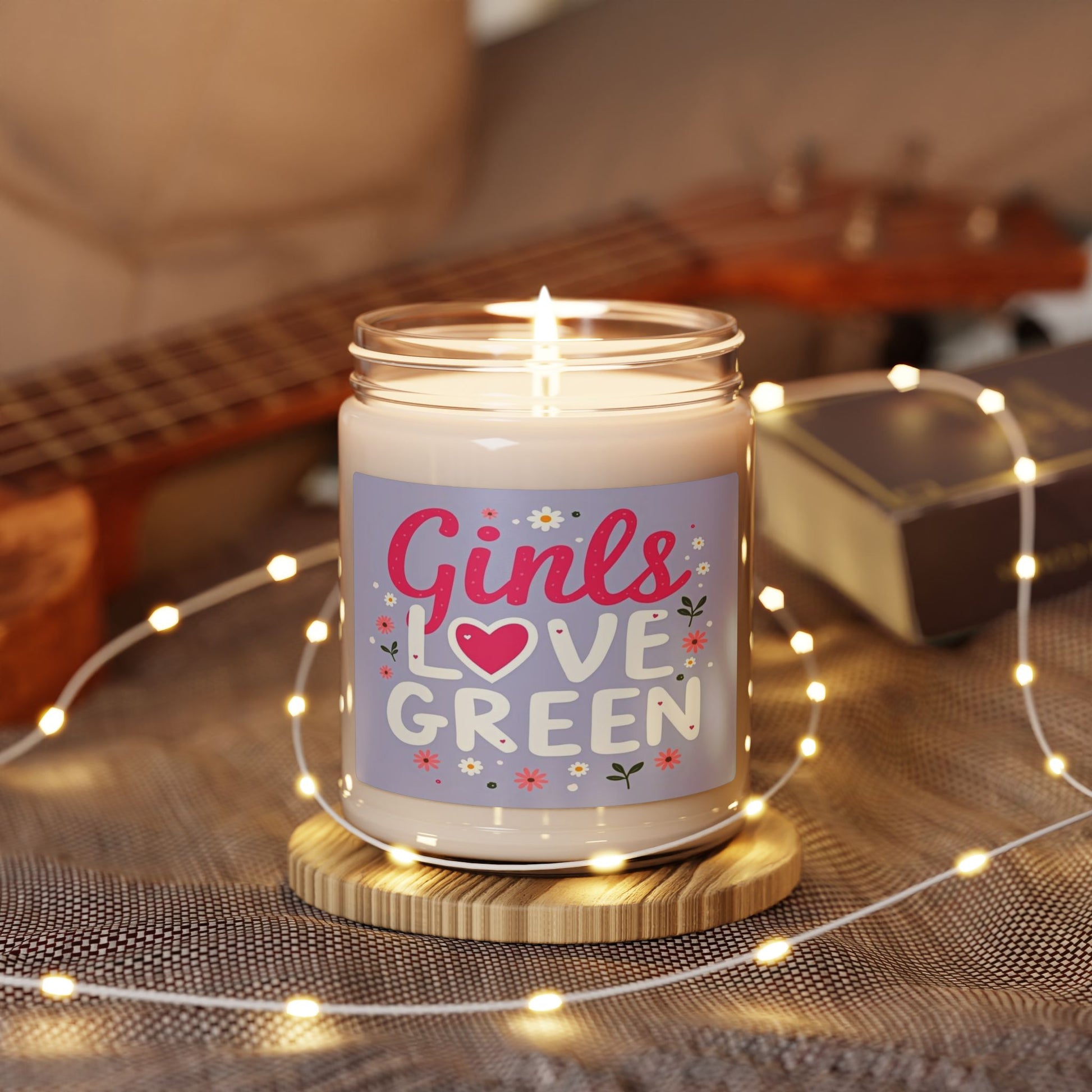 This vibrant graphic design features the phrase "Girls Love Green" in a playful, stylized typography against a soft lavender background. The text is rendered in bold pink and white letters, with a pink heart replacing the "O" in "Love". Decorative white and pink daisy flowers, along with small green leaves and dots, surround the text, creating a whimsical and cheerful composition. The image has a modern, hand-drawn feel with slightly textured letters and a cute, feminine aesthetic. The color palette of pink, white, lavender, and green gives the design a fresh, positive, and empowering feel.
