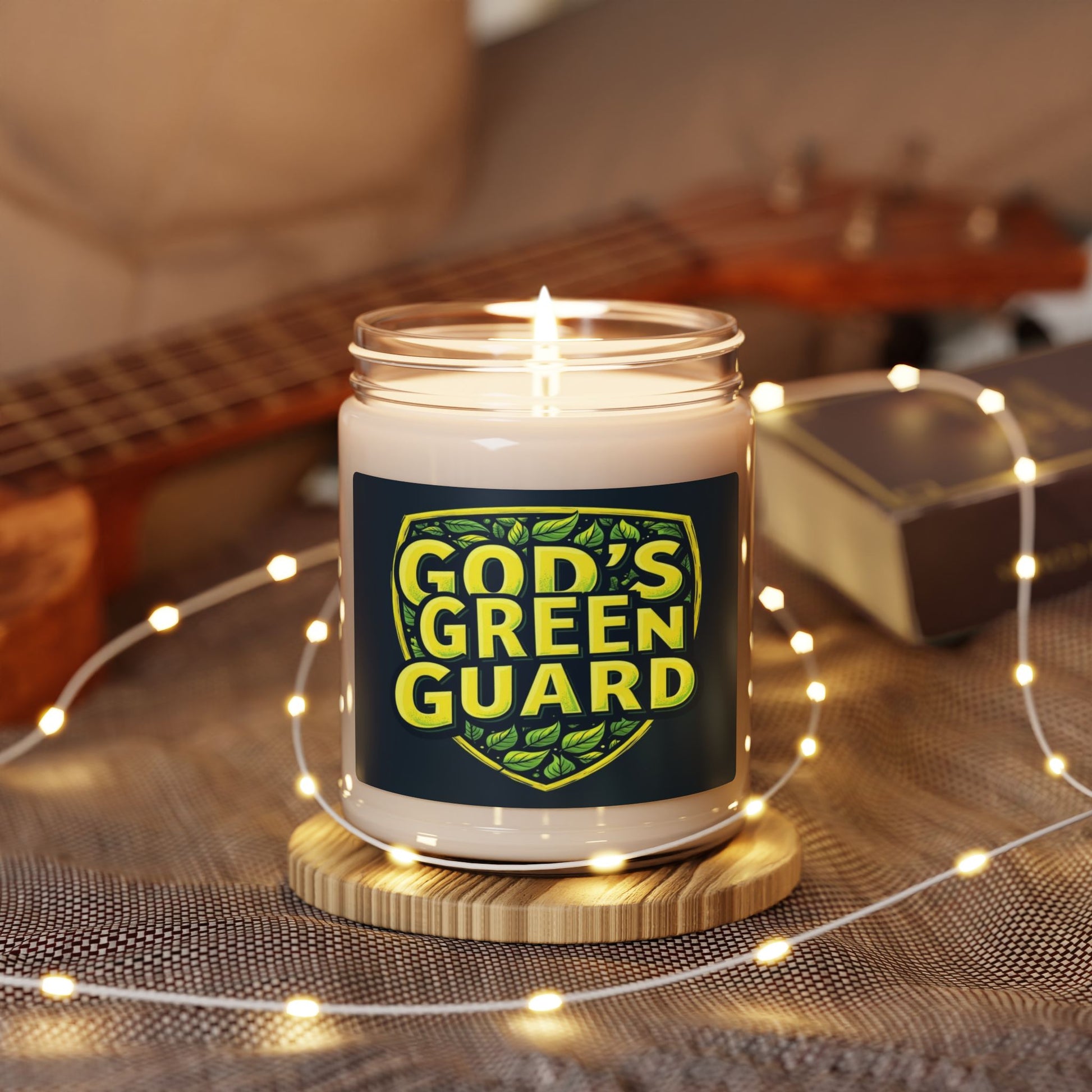 This vibrant logo design features the text "GOD'S GREEN GUARD" in bold, bright yellow letters set against a dark blue background. The text is encased in a shield-shaped emblem adorned with various shades of green leaves, creating a natural and ecological theme. The typography is large, impactful, and slightly textured, giving the design a robust and dynamic feel. Green leaves are intricately scattered throughout the background and border of the shield, symbolizing environmental protection and sustainability. The overall color palette of yellow and green creates a striking visual contrast that draws the eye and communicates a sense of energy and environmental stewardship.