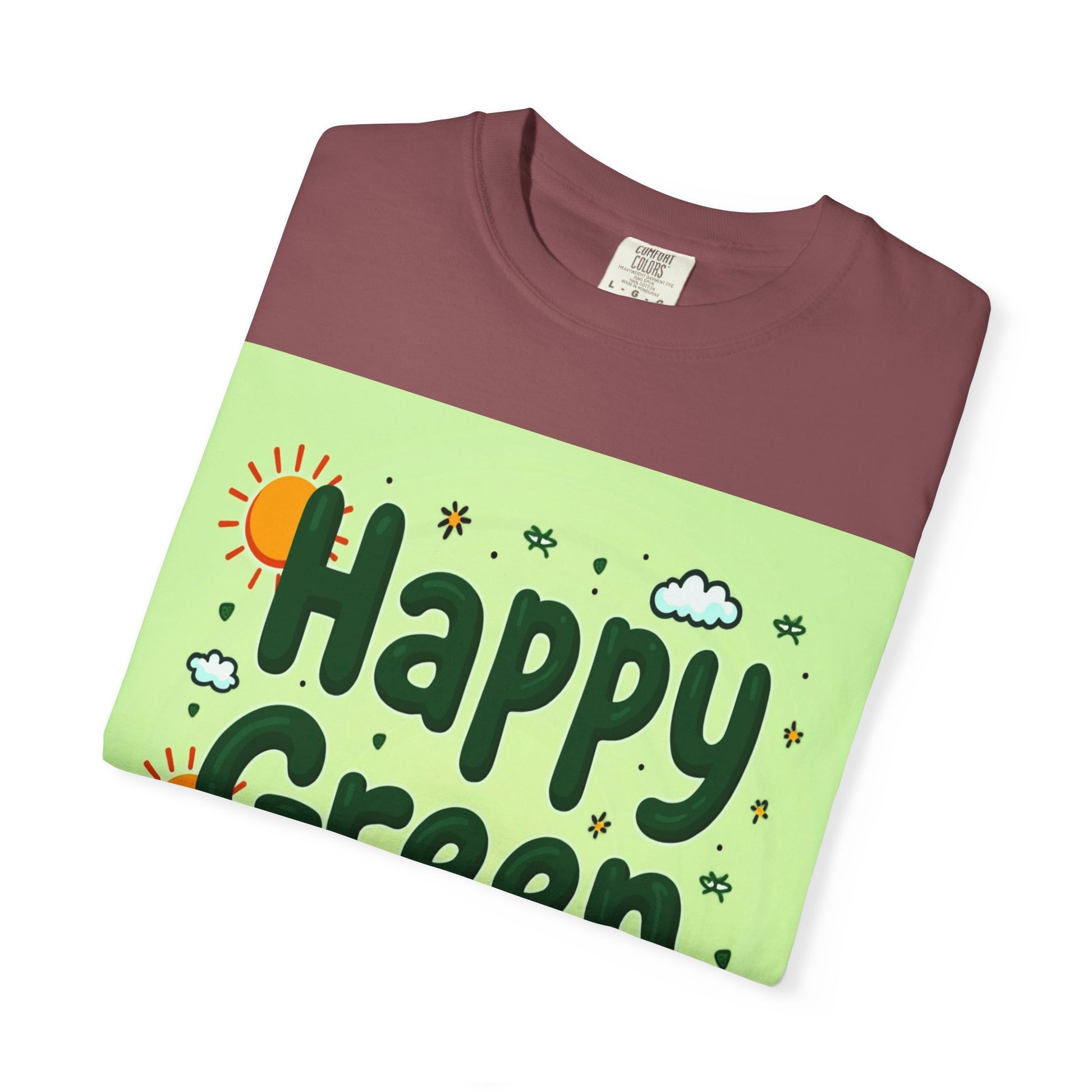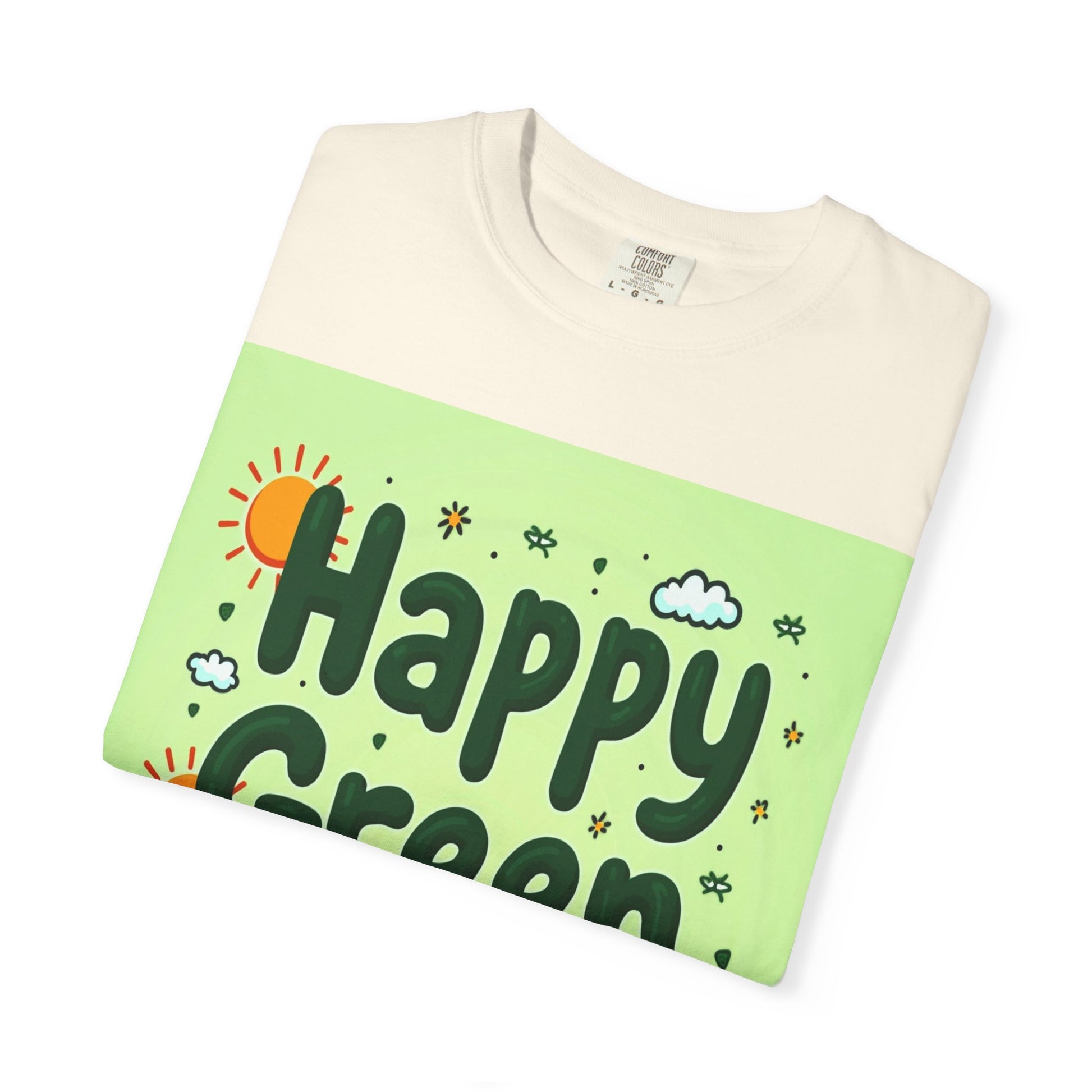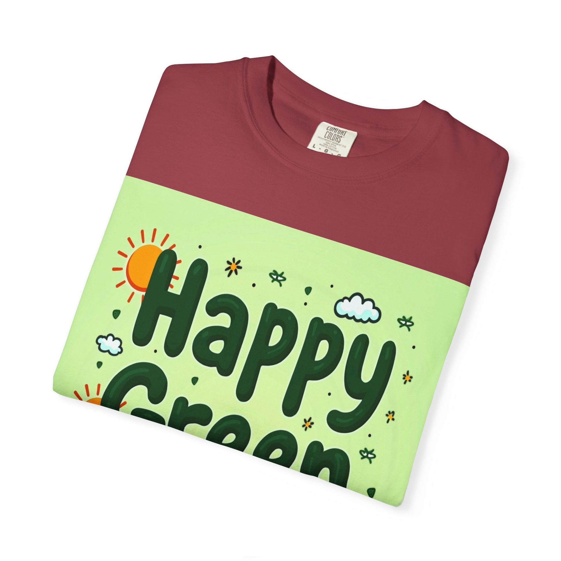 This vibrant graphic design image features the text "Happy Green World" in large, rounded dark green letters against a light green background. The typography is playful and bubbly, with a soft, cheerful aesthetic that evokes positivity and environmental themes. Decorative elements include three stylized suns with radiating rays positioned around the text, as well as small white clouds and tiny flower-like icons scattered throughout the image. The color palette is predominantly green and yellow, creating a fresh and natural feel that aligns with the message of environmental wellness. The overall design has a whimsical, optimistic quality that suggests celebration and appreciation for the natural world.