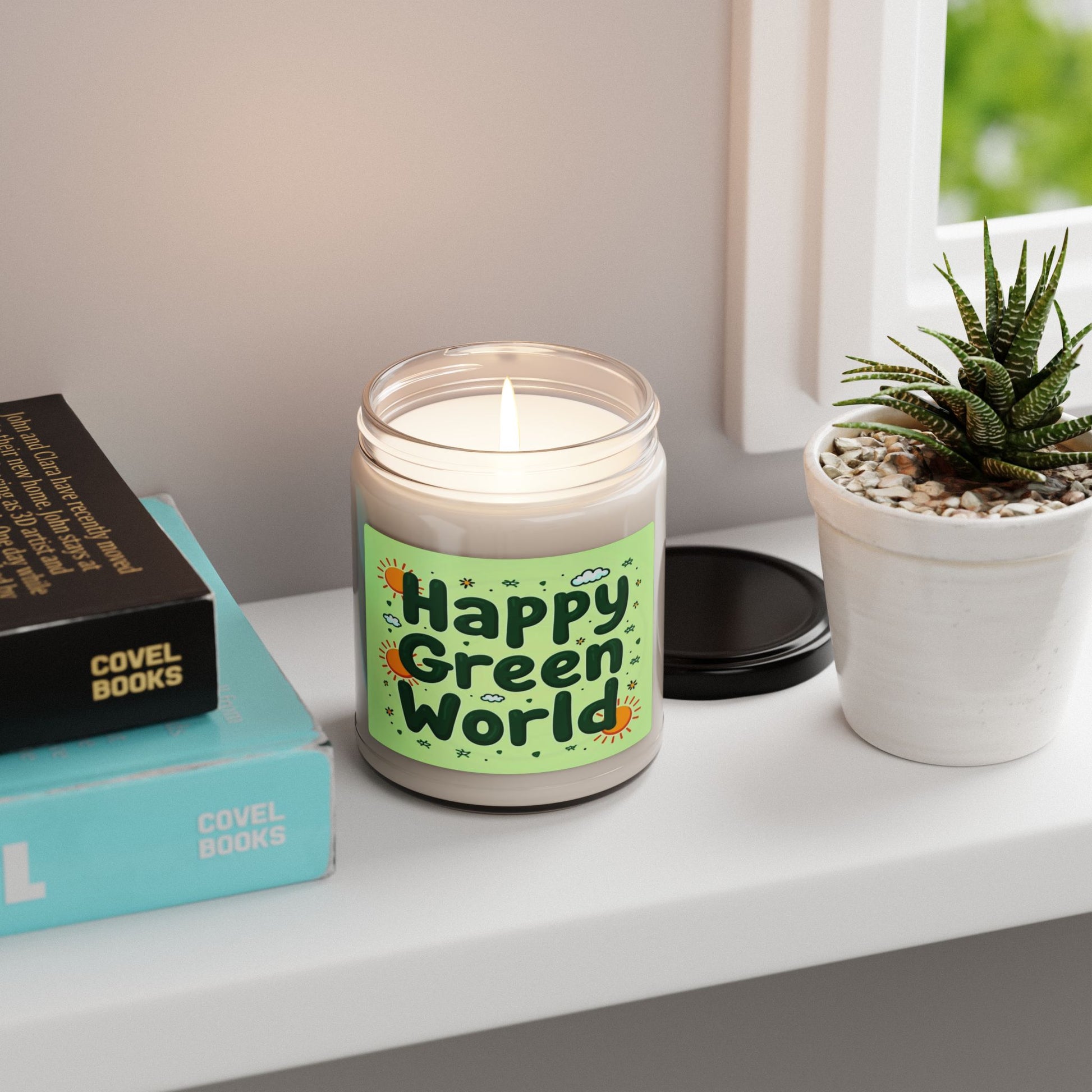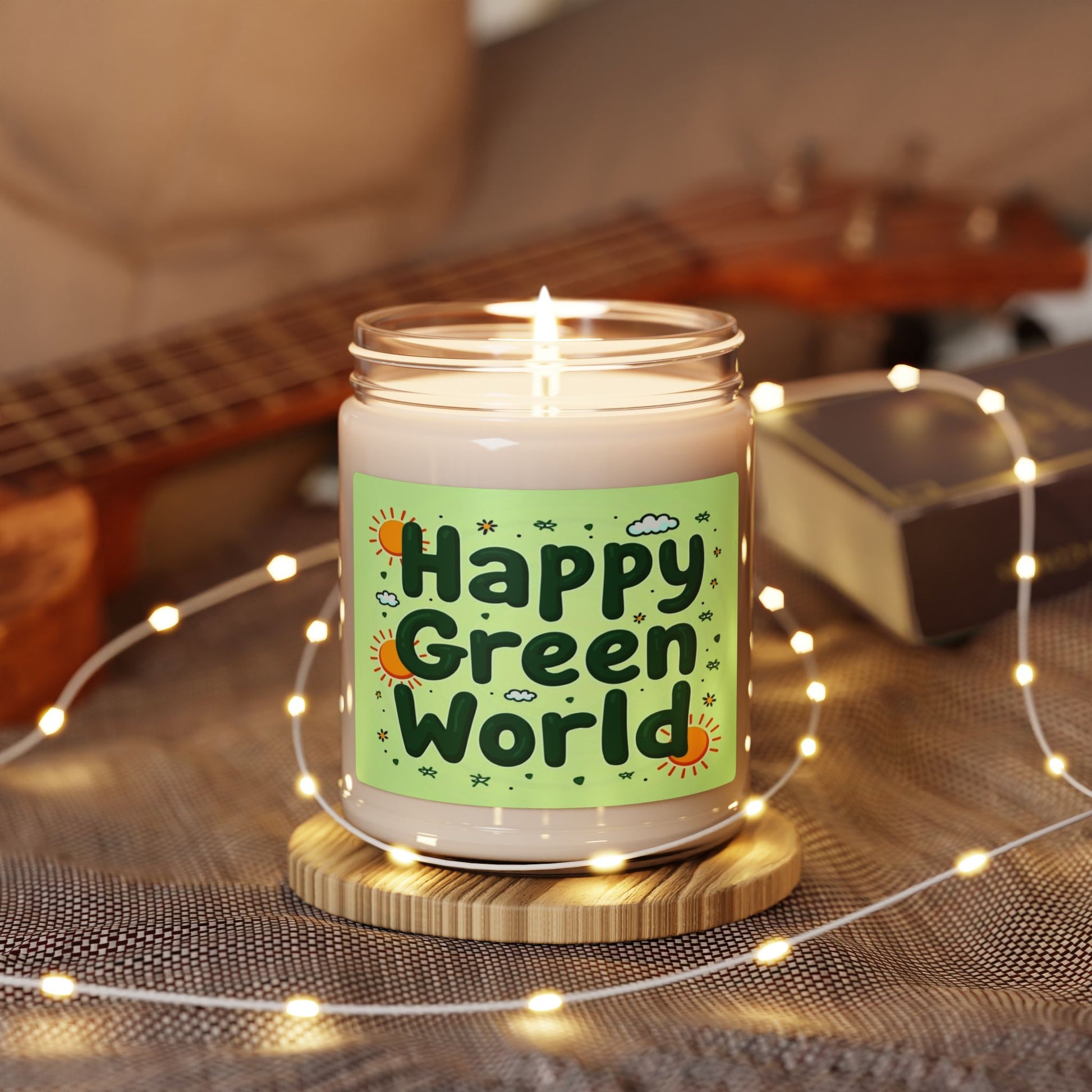 This vibrant graphic design features the text "Happy Green World" in large, rounded dark green letters against a light green background. The typography is playful and buoyant, with a soft, rounded style that gives the text a friendly and approachable feel. Three bright, stylized suns with radiating rays are positioned around the text, complemented by small white clouds and decorative flower-like elements scattered across the image. The color palette is predominantly green and yellow, creating a cheerful and nature-inspired visual composition. The overall design appears to be a celebratory or motivational graphic promoting environmental positivity and sustainability.