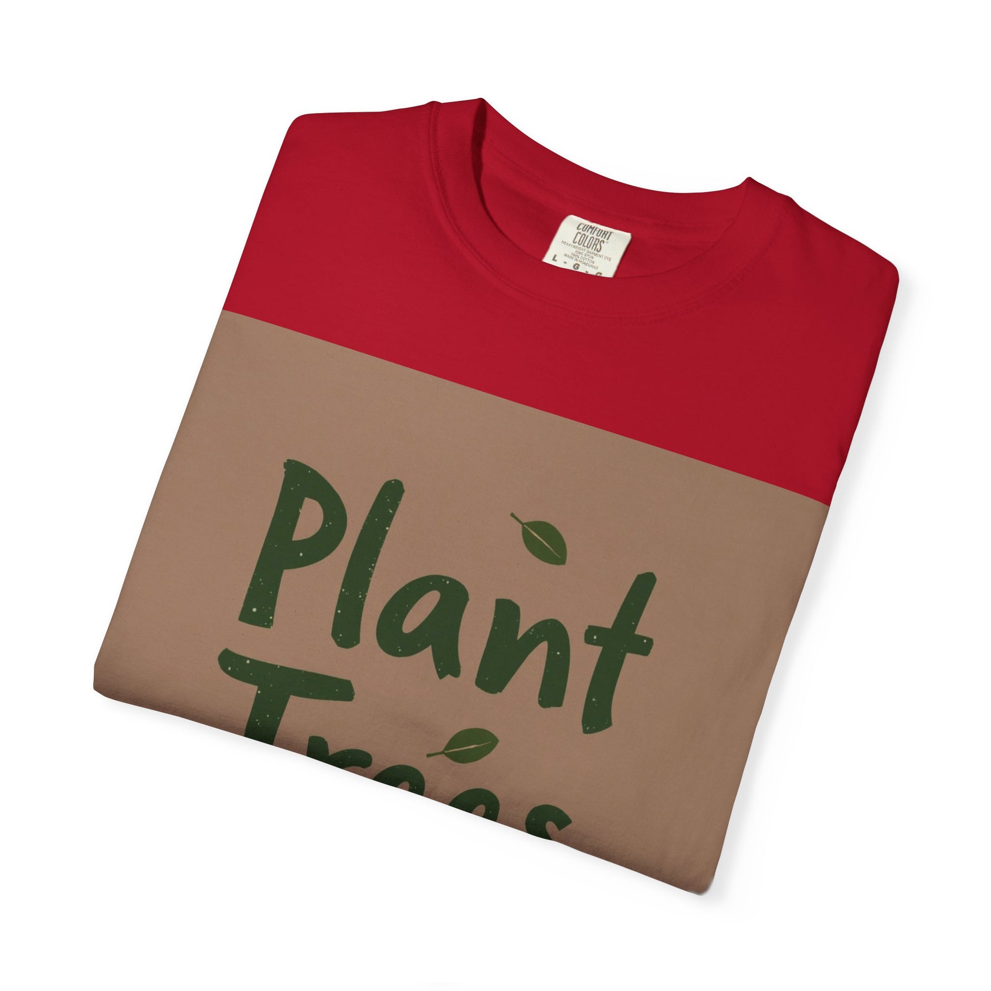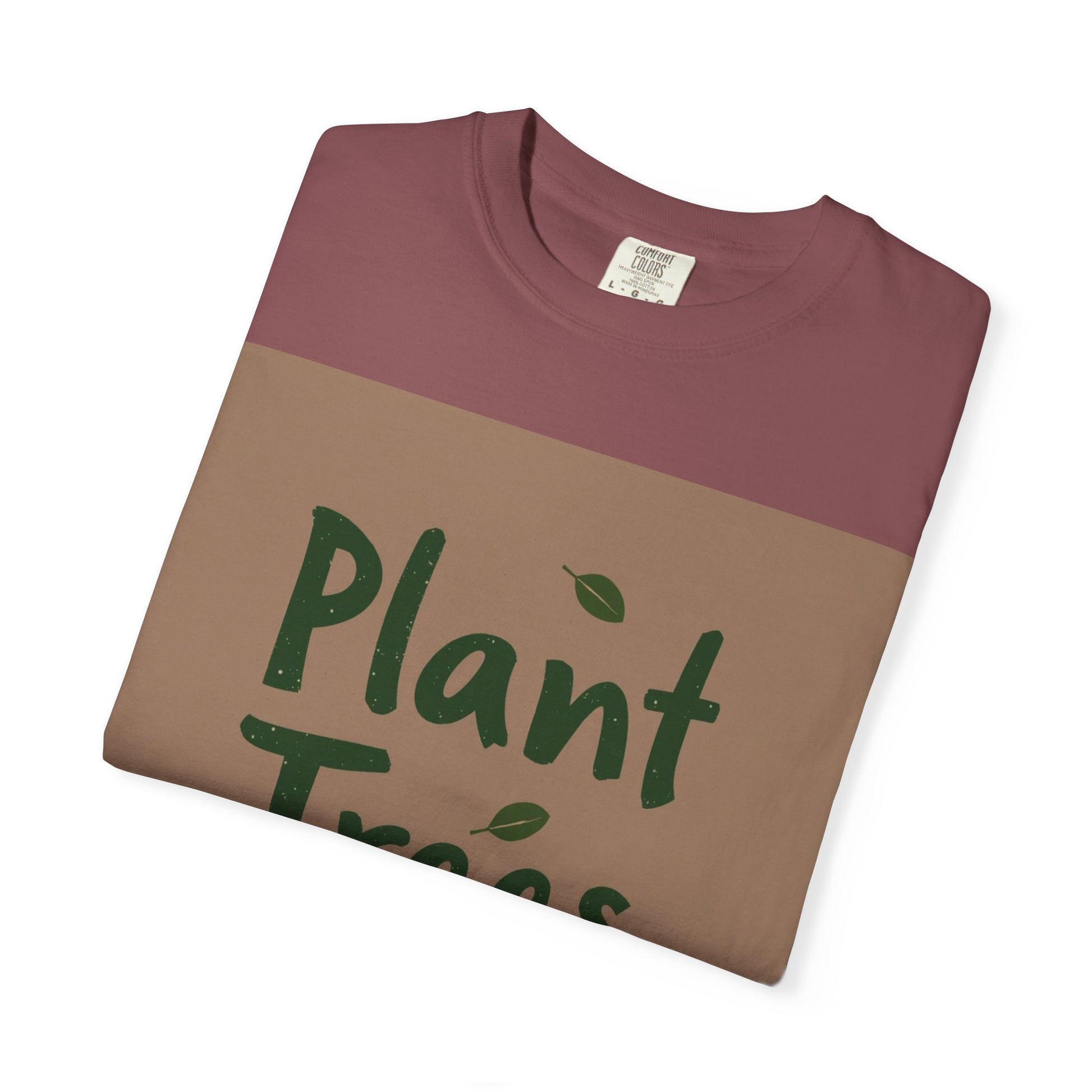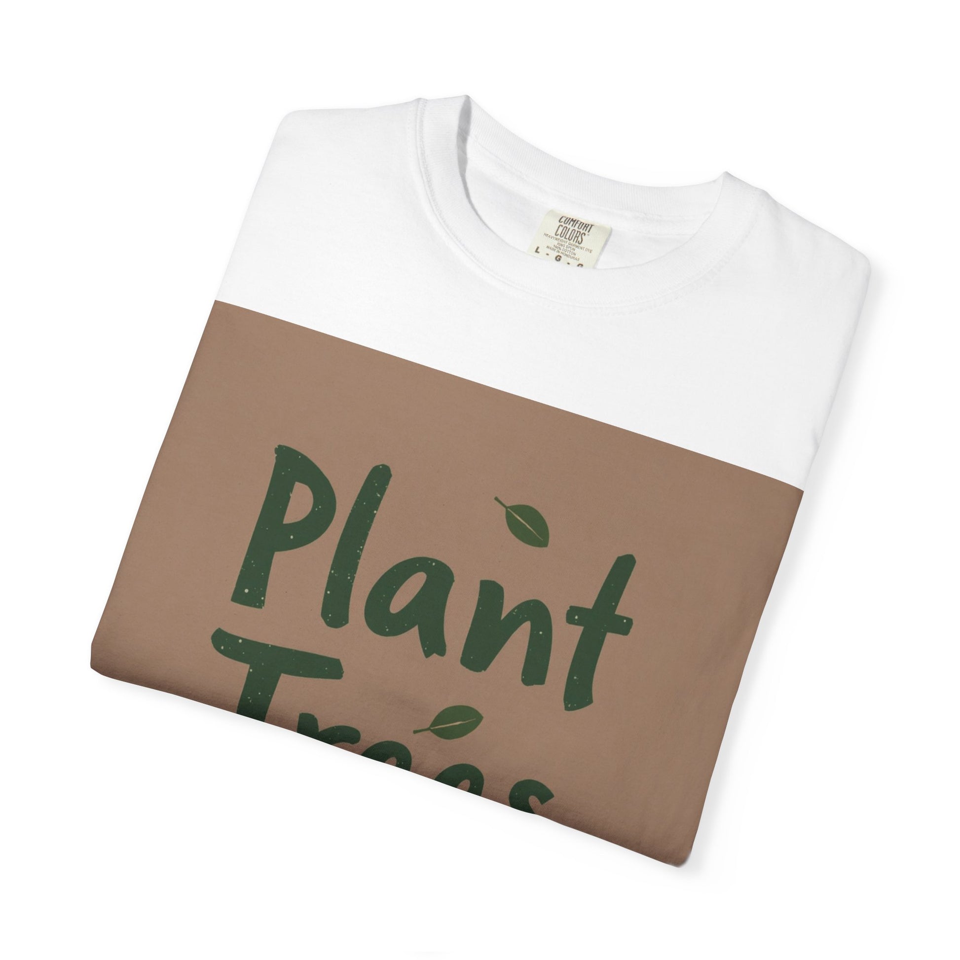 This image features the text "Plant Trees Please" in a bold, textured green font against a warm beige or light brown background. Small green leaf icons are strategically placed around the text, adding a natural and organic feel to the design. The typography is rustic and slightly distressed, giving the message a handcrafted and eco-friendly aesthetic. The color palette of forest green and earthy brown evokes a sense of environmental consciousness and sustainability. The simple yet impactful message encourages viewers to take action in support of tree planting and environmental preservation.