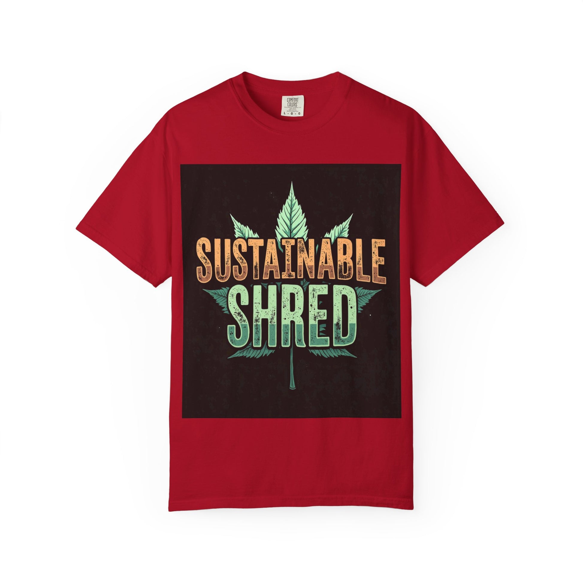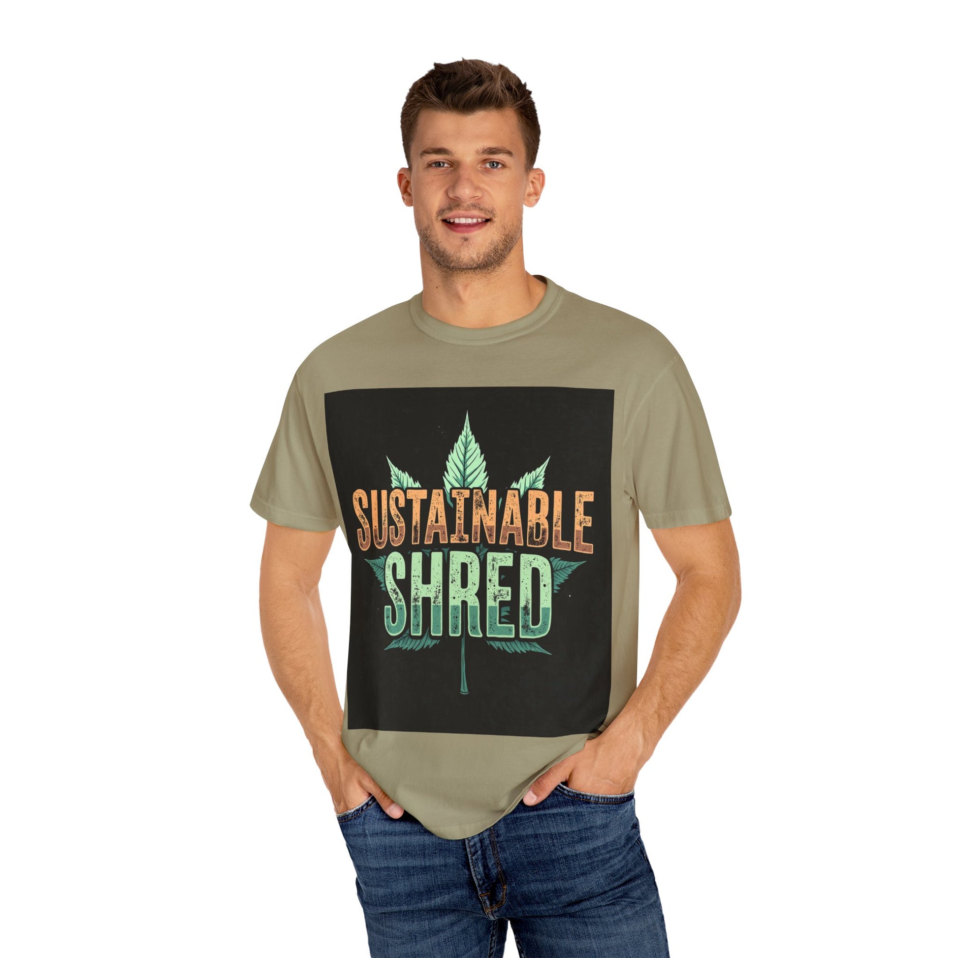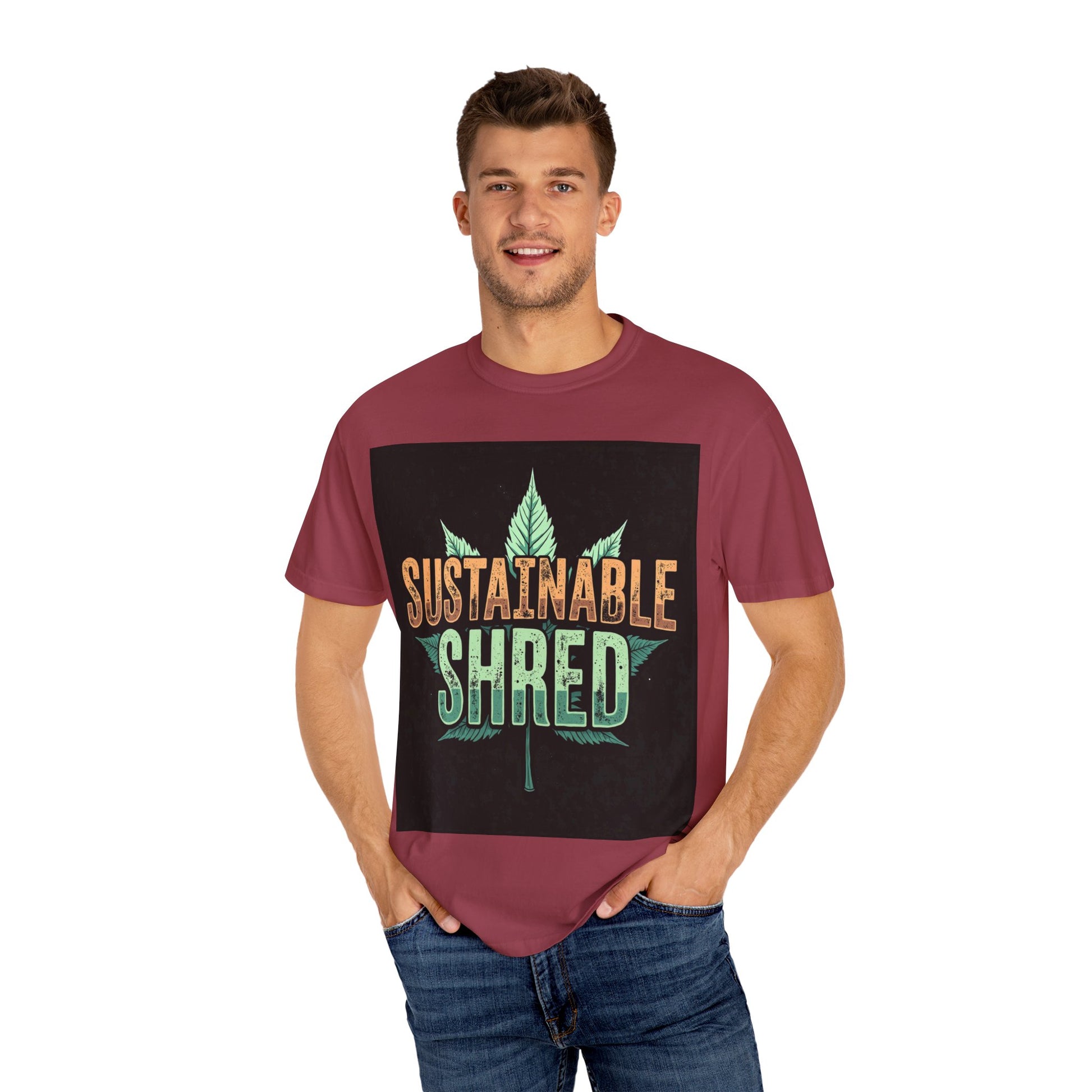 This graphic design image features the text "SUSTAINABLE SHRED" stylized with a distressed, vintage look against a black background. The words are prominently displayed, framed by a central cannabis leaf and additional leaf elements in varying shades of green and mint. The typography uses bold, textured letters in warm orange and cool green tones, creating a visually striking contrast. The design appears to be a graphic for sustainability or eco-friendly practices related to cannabis or outdoor activities. The overall aesthetic combines a grunge-style texture with a nature-inspired color palette, giving the image an organic and modern feel.