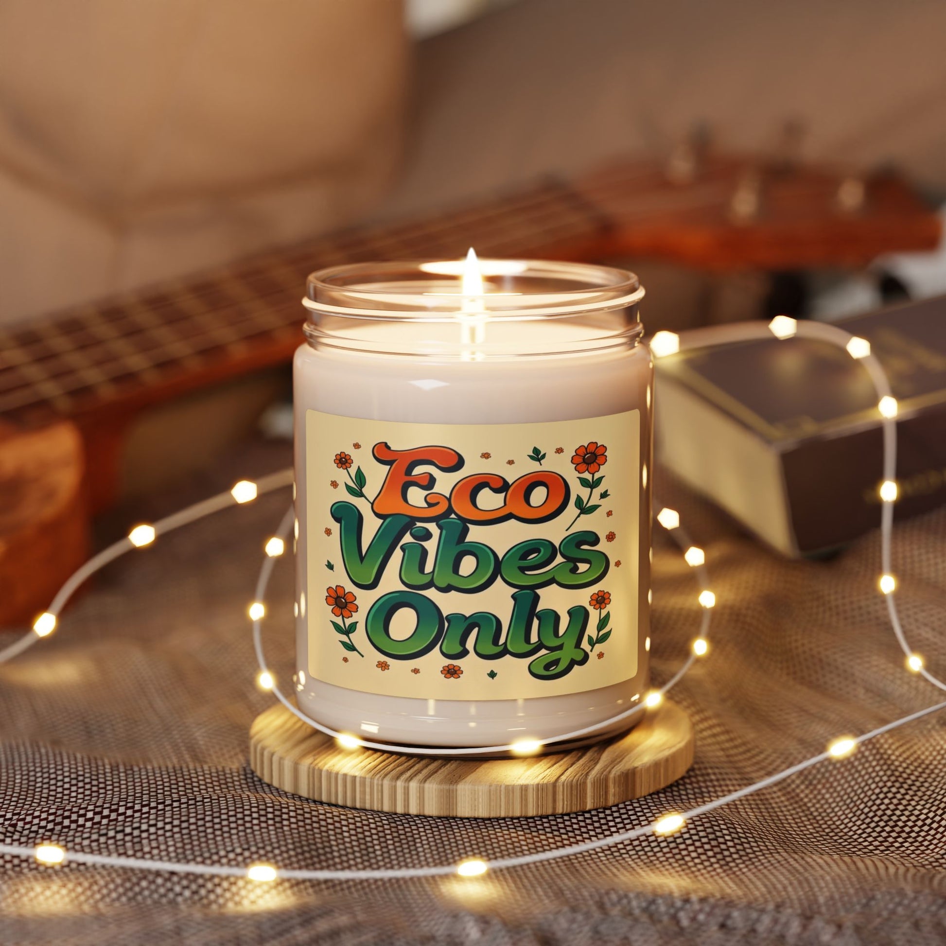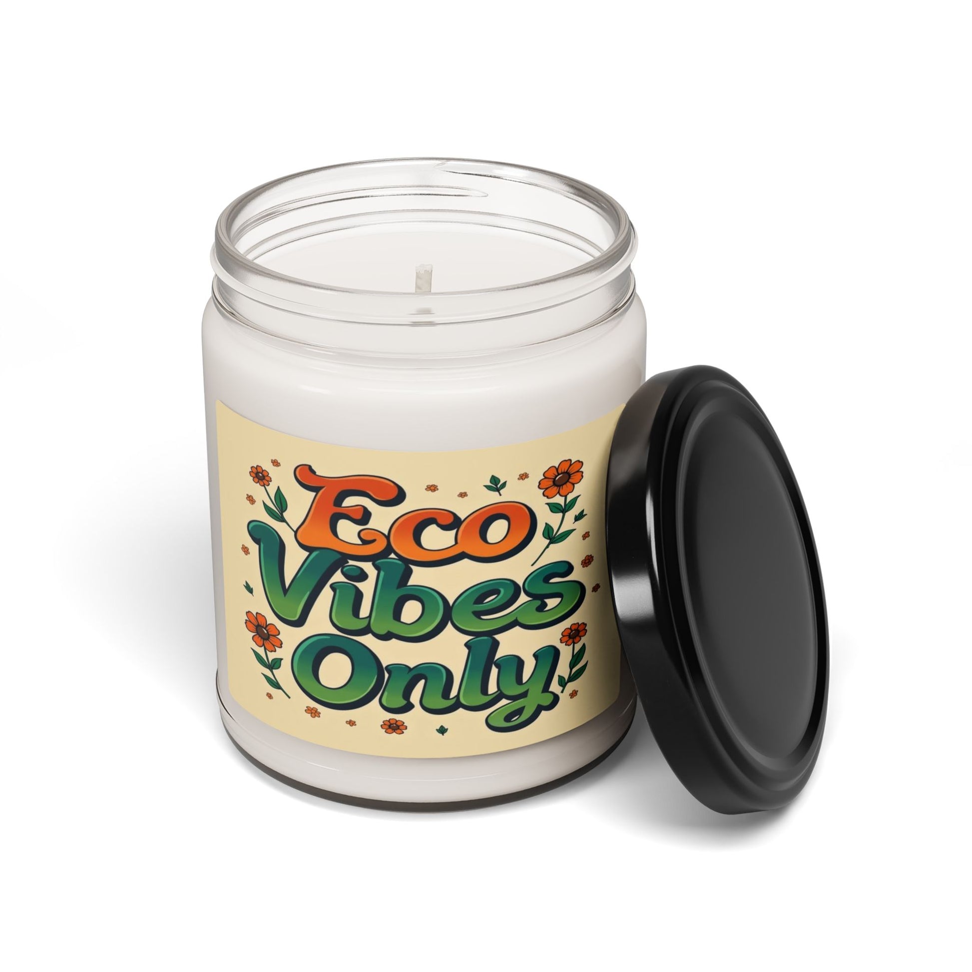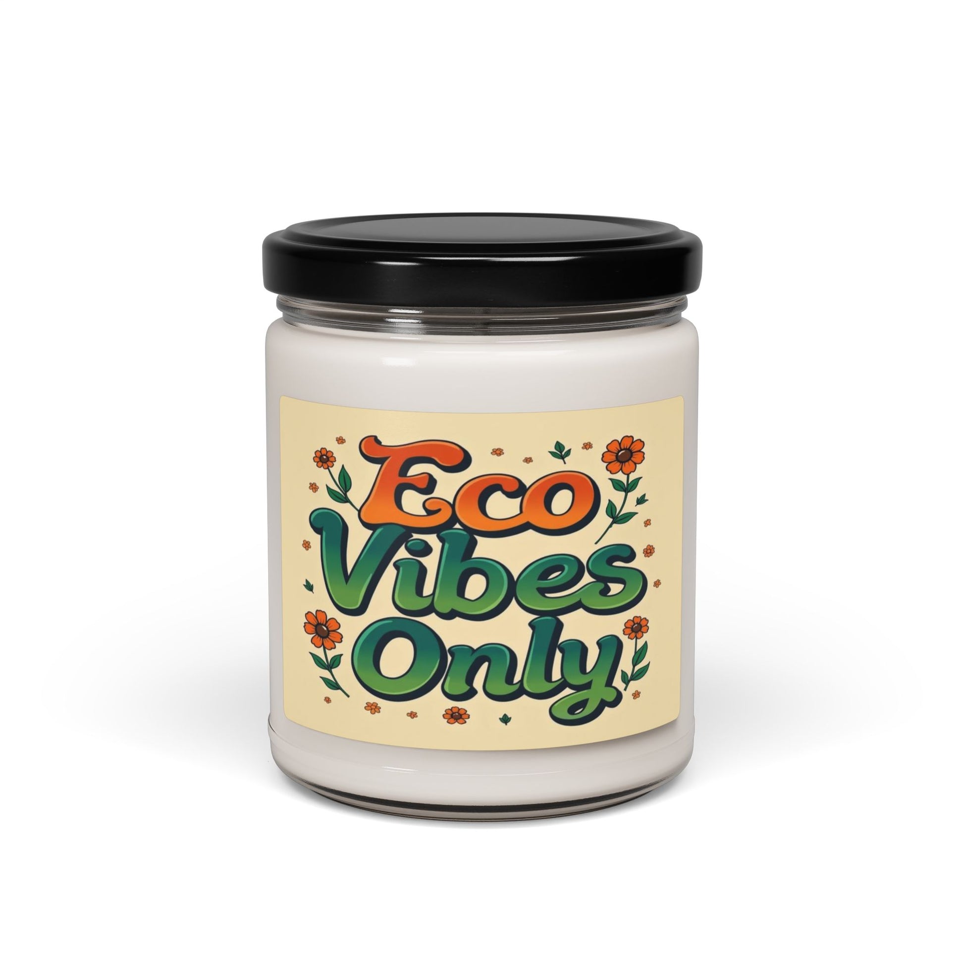 This vibrant graphic design features the text "Eco Vibes Only" in stylized, gradient green and orange lettering with a retro, bubbly font style. The text is surrounded by decorative orange flowers with green stems and leaves, creating a nature-inspired and cheerful composition. Small additional flower and leaf elements are scattered around the main text, adding to the organic, environmentally-friendly aesthetic. The color palette consists of warm oranges, deep greens, and a soft cream background, evoking a sense of natural harmony and sustainability. The overall design has a vintage, 1970s-inspired look that communicates a positive, eco-conscious message.