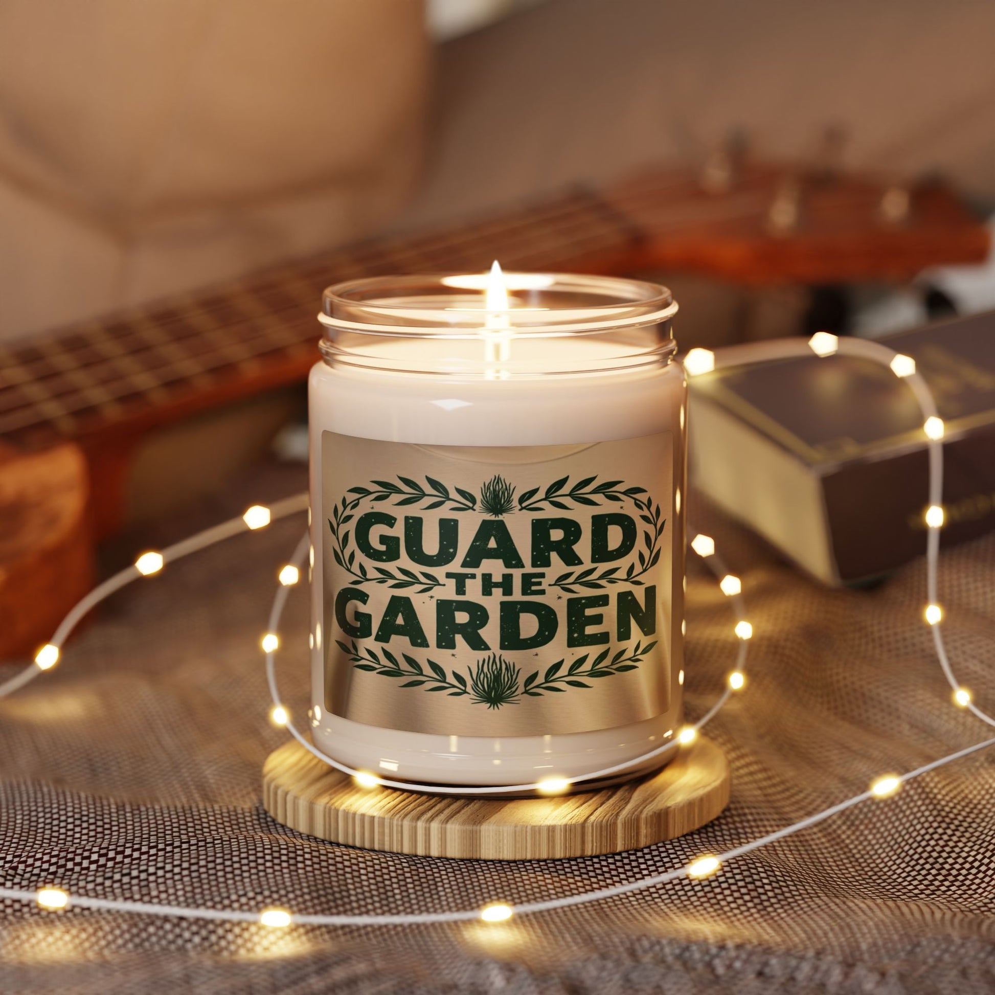 This image features a graphic design on what appears to be a light beige or cream-colored textile, displaying the text "GUARD THE GARDEN" in large, dark green, slightly textured letters. The text is elegantly framed by a symmetrical laurel wreath of green leaves, with two stylized plant or thistle-like motifs positioned at the top and bottom of the design. The typography has a vintage or distressed look, with subtle speckled textures giving the green letters an organic, weathered appearance. The overall design evokes a sense of gardening, nature, and protective stewardship, with the leafy border symbolizing growth, nurturing, and preservation. The color palette is minimal, using only dark green against the light background, which creates a clean, striking visual contrast.