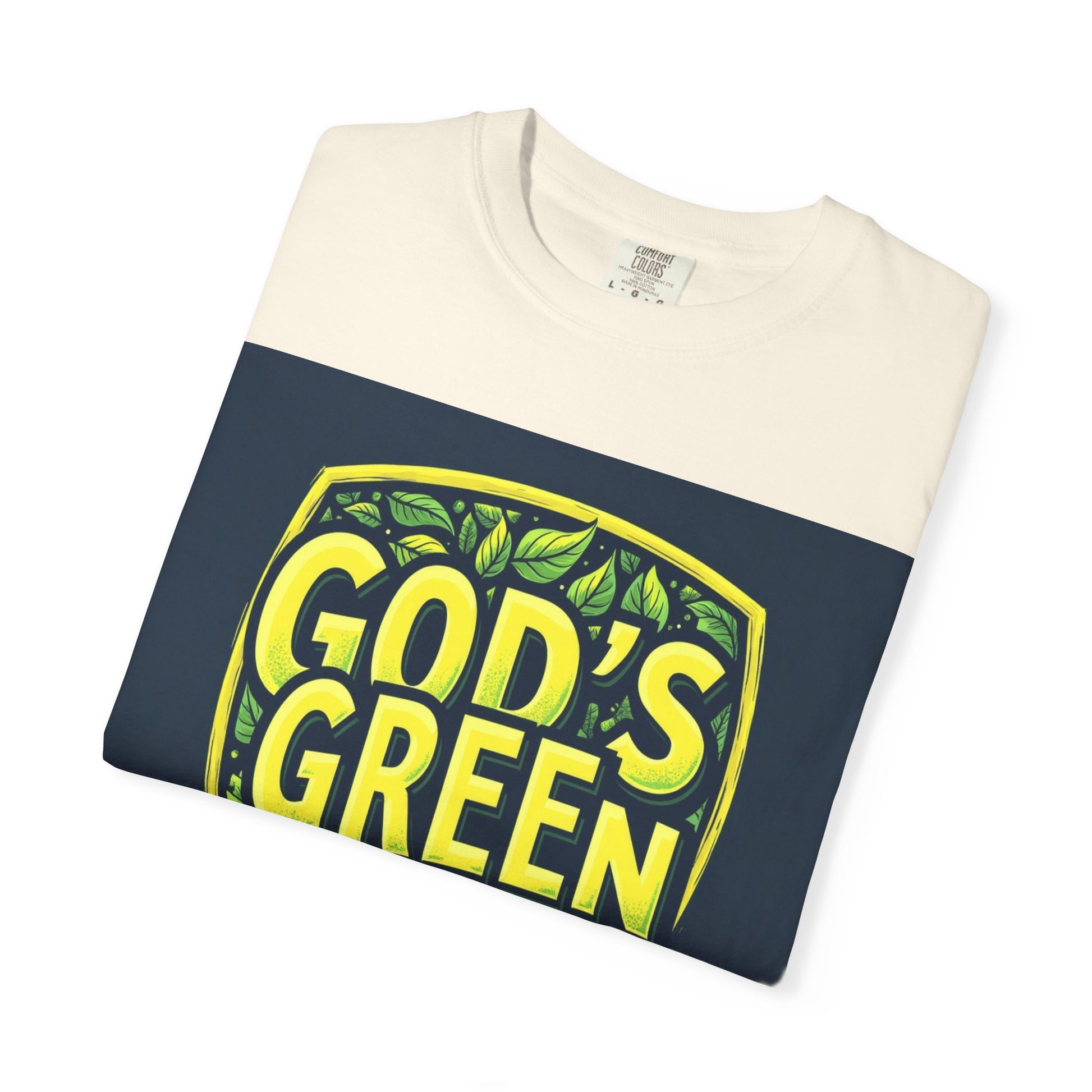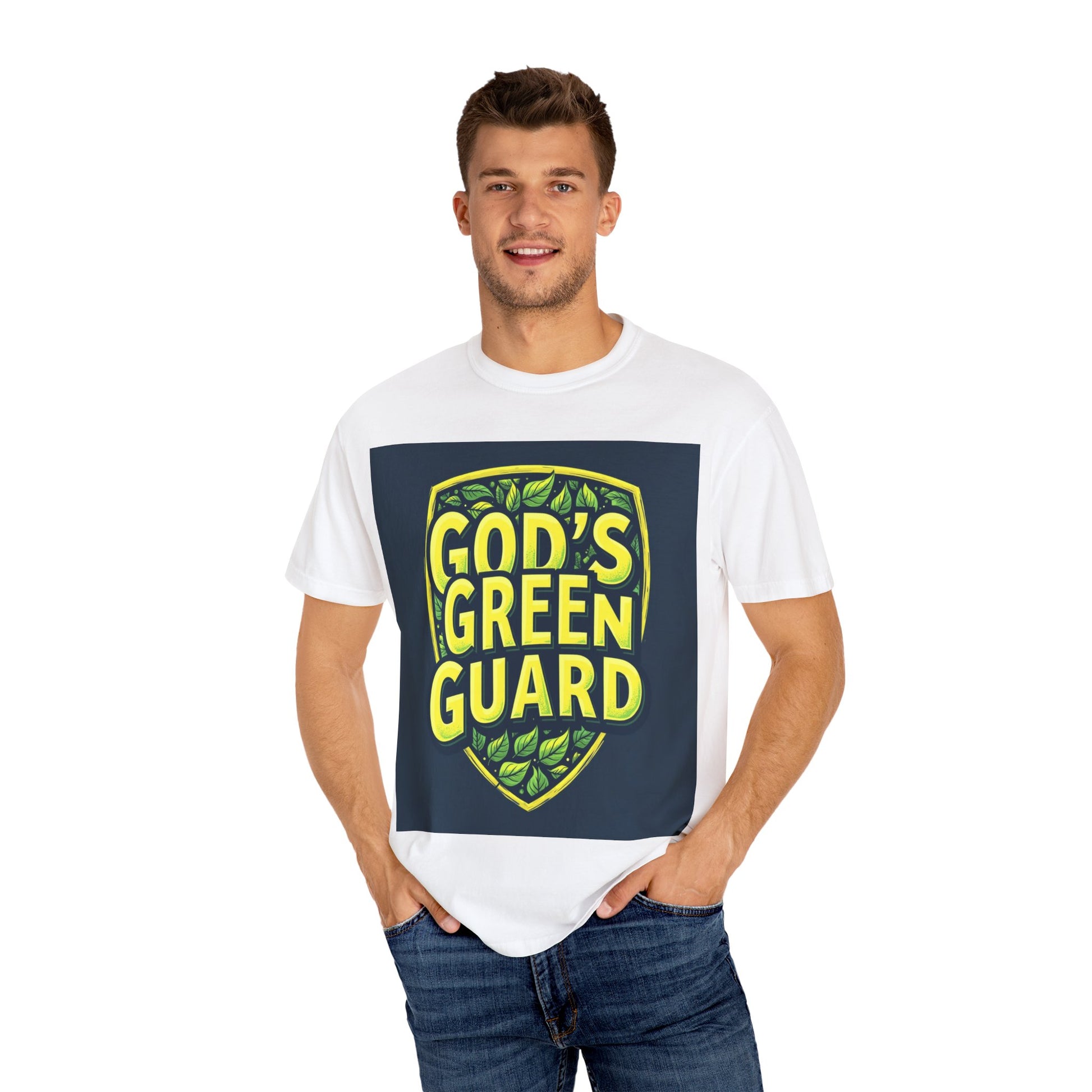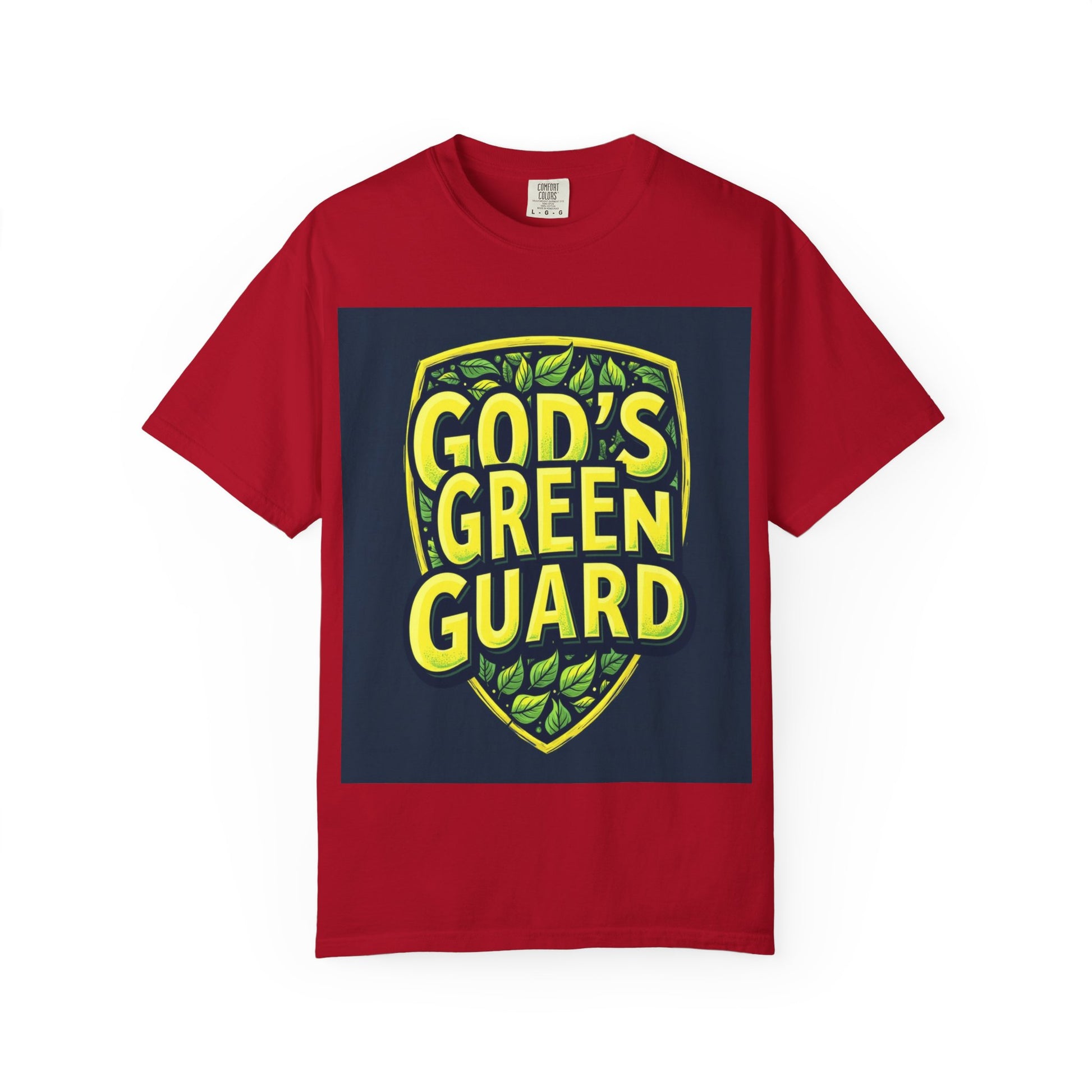 This vibrant graphic design features the text "GOD'S GREEN GUARD" in bold, bright yellow lettering against a dark blue background. The text is arranged within a shield-shaped emblem, giving it a badge-like appearance that suggests protection or authority. The shield is adorned with various green leaves of different shapes and shades, creating a lush, natural background that complements the text. The design uses a stylized, modern typography with a textured, slightly worn effect that adds depth and visual interest to the letters. The color palette of yellow and green evokes themes of nature, environmental protection, and sustainability.
