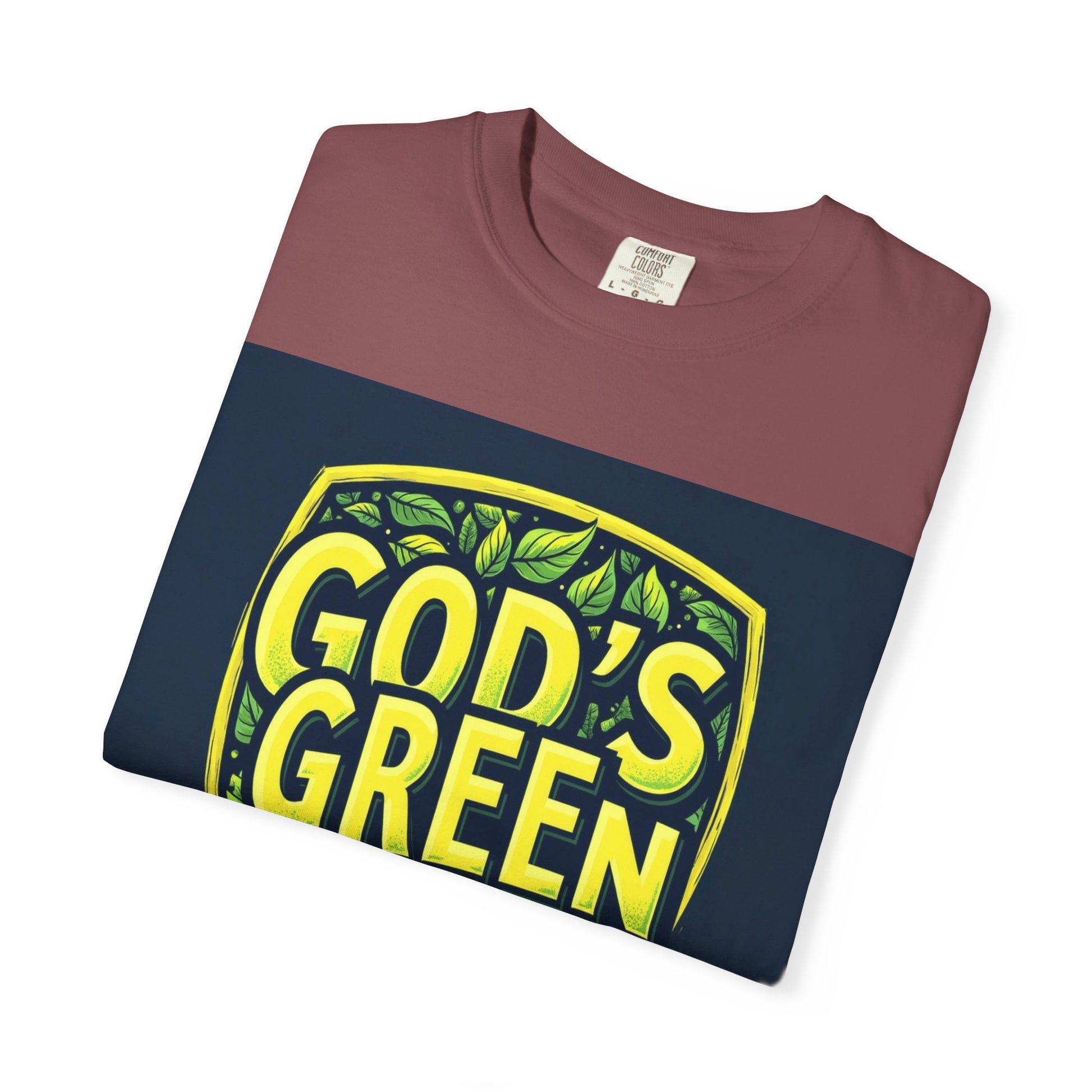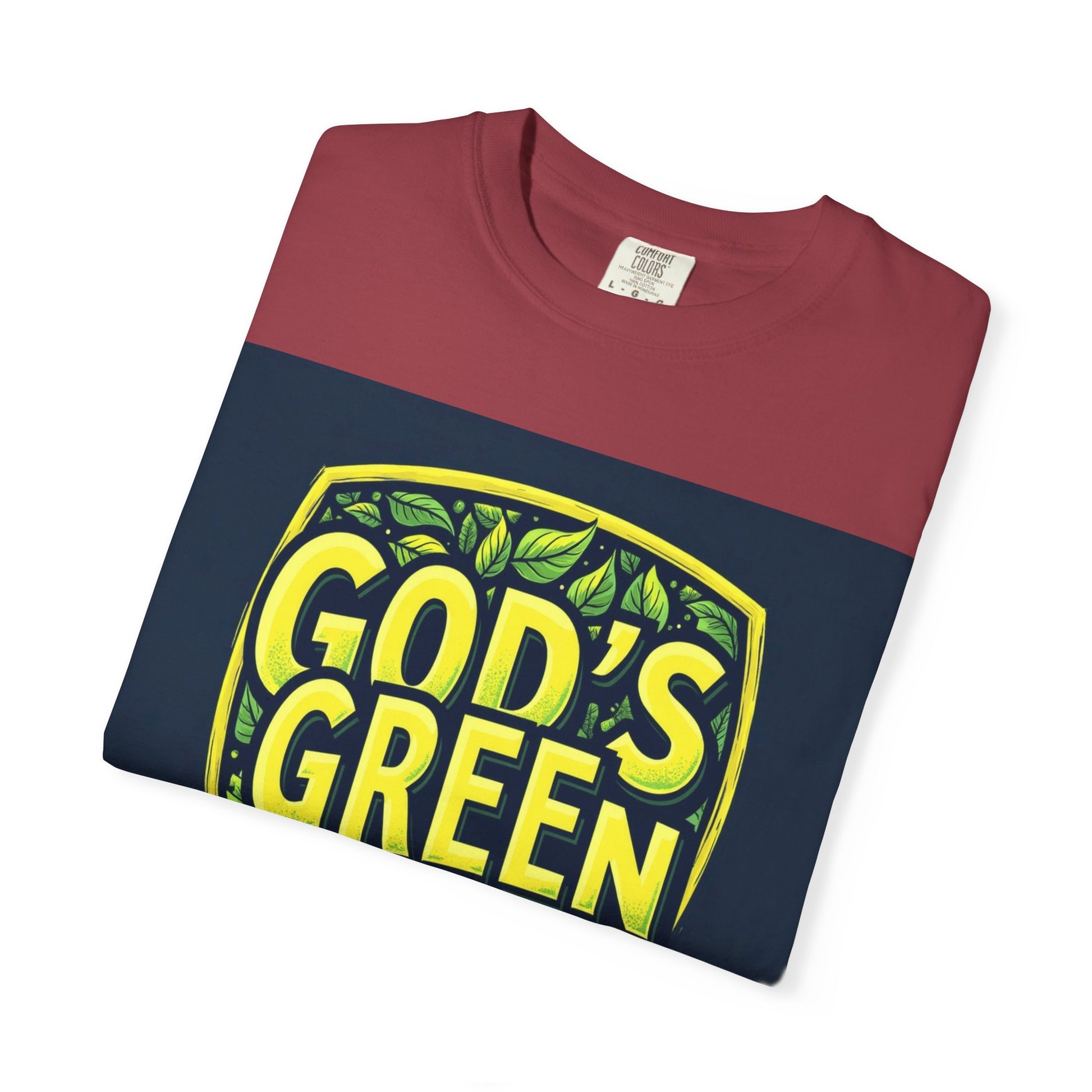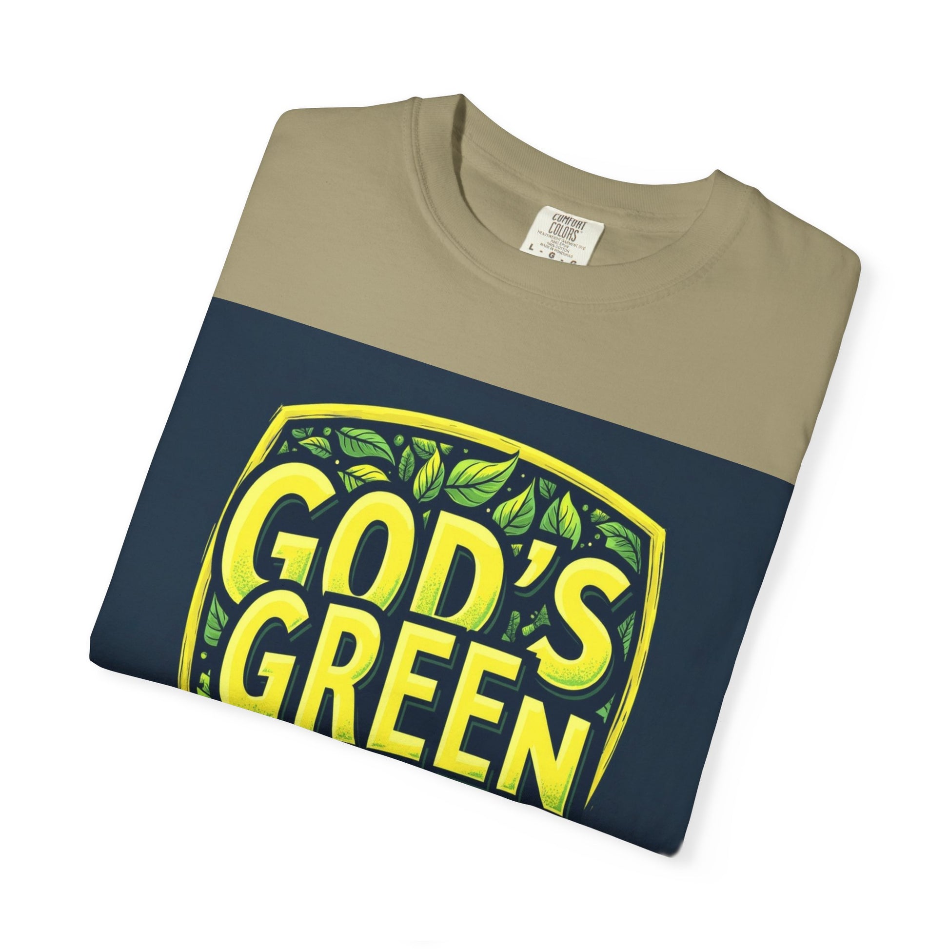 This vibrant graphic design features the text "GOD'S GREEN GUARD" in bold, bright yellow lettering against a dark blue background. The text is arranged within a shield-shaped emblem, giving it a badge-like appearance that suggests protection or authority. The shield is adorned with various green leaves of different shapes and shades, creating a lush, natural background that complements the text. The design uses a stylized, modern typography with a textured, slightly worn effect that adds depth and visual interest to the letters. The color palette of yellow and green evokes themes of nature, environmental protection, and sustainability.