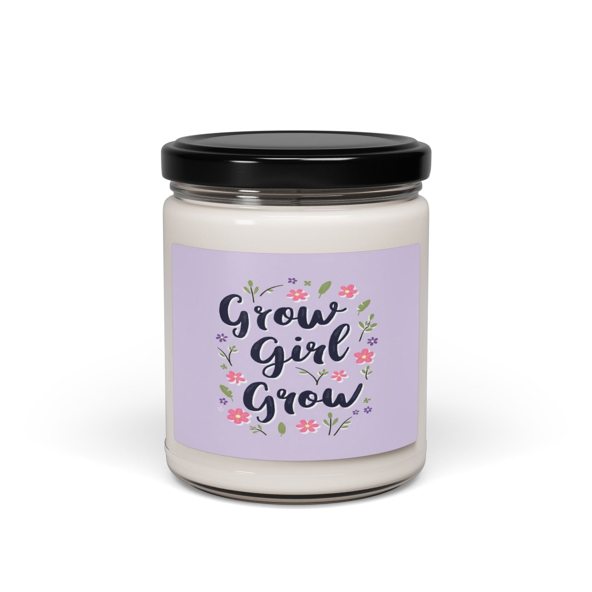 This inspirational graphic features the phrase "Grow Girl Grow" in stylized, dark navy lettering against a soft lavender background. The text is surrounded by delicate floral elements, including pink and purple flowers with green leaves and stems. The typography is handwritten and appears to be brush-styled, giving the image a modern, feminine, and empowering feel. Small decorative flowers are artfully arranged around the text, creating a whimsical and organic frame. The overall design has a pastel color palette with a clean, minimalist aesthetic that suggests personal growth, motivation, and encouragement.