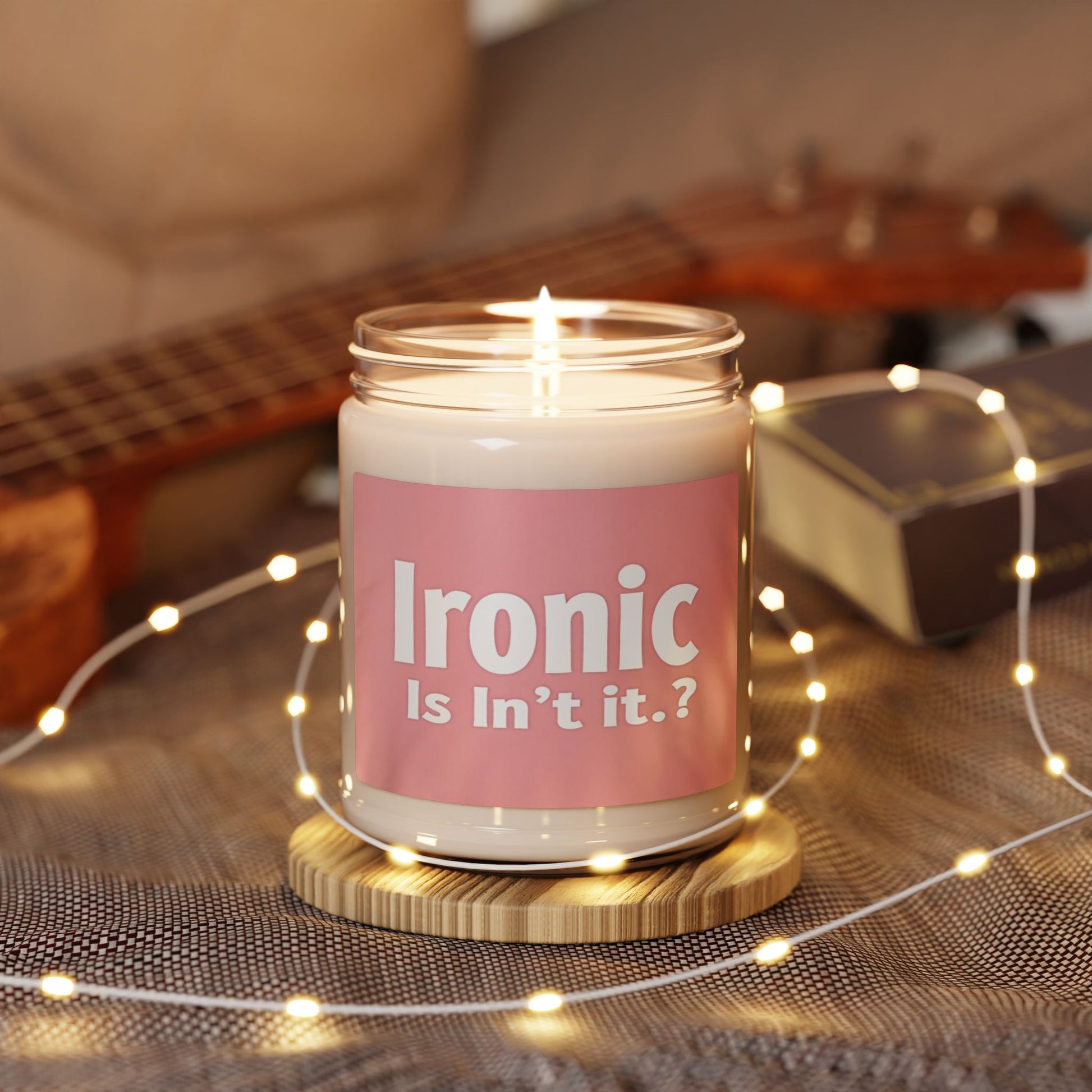 The image features the text "Ironic Is In't it?" in large, white letters against a soft pink background. The typography is bold and clean, with a modern, minimalist design aesthetic. The phrase plays with language, intentionally using a grammatically incorrect contraction to highlight the concept of irony. The color palette is gentle and subdued, with the white text standing out sharply against the pastel pink backdrop. The image appears to be a graphic design or t-shirt print, conveying a witty, self-aware message through its typographic treatment.