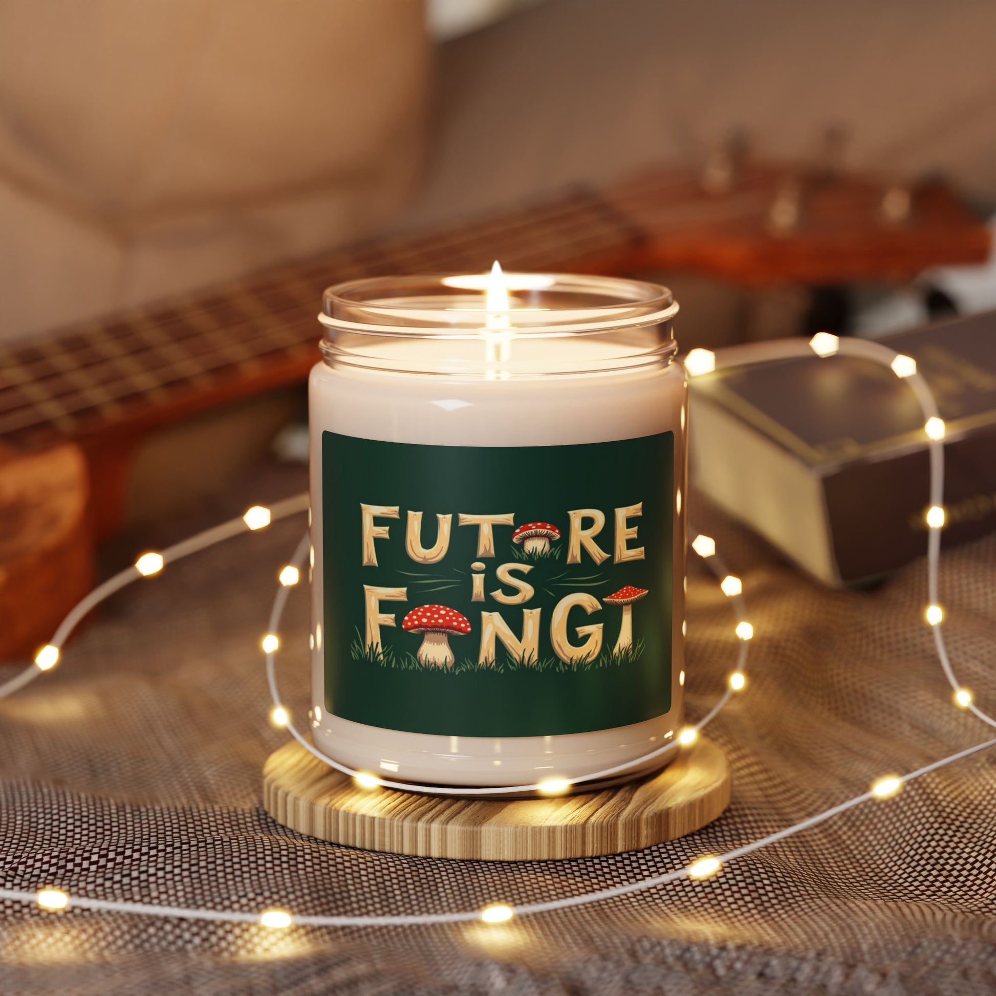 This graphic design features the text "FUTURE IS FUNGI" on a deep green background, with stylized wooden-textured letters. Three red and white spotted mushrooms (resembling Amanita muscaria or fly agaric mushrooms) are strategically placed around and within the text, nestled among small blades of grass. The typography is three-dimensional and appears slightly carved or textured, giving the image a natural, organic feel. The color palette is limited to shades of green, cream, and vibrant red, creating a striking visual contrast. The design appears to be a playful and artistic statement about the potential importance of fungi in the future.