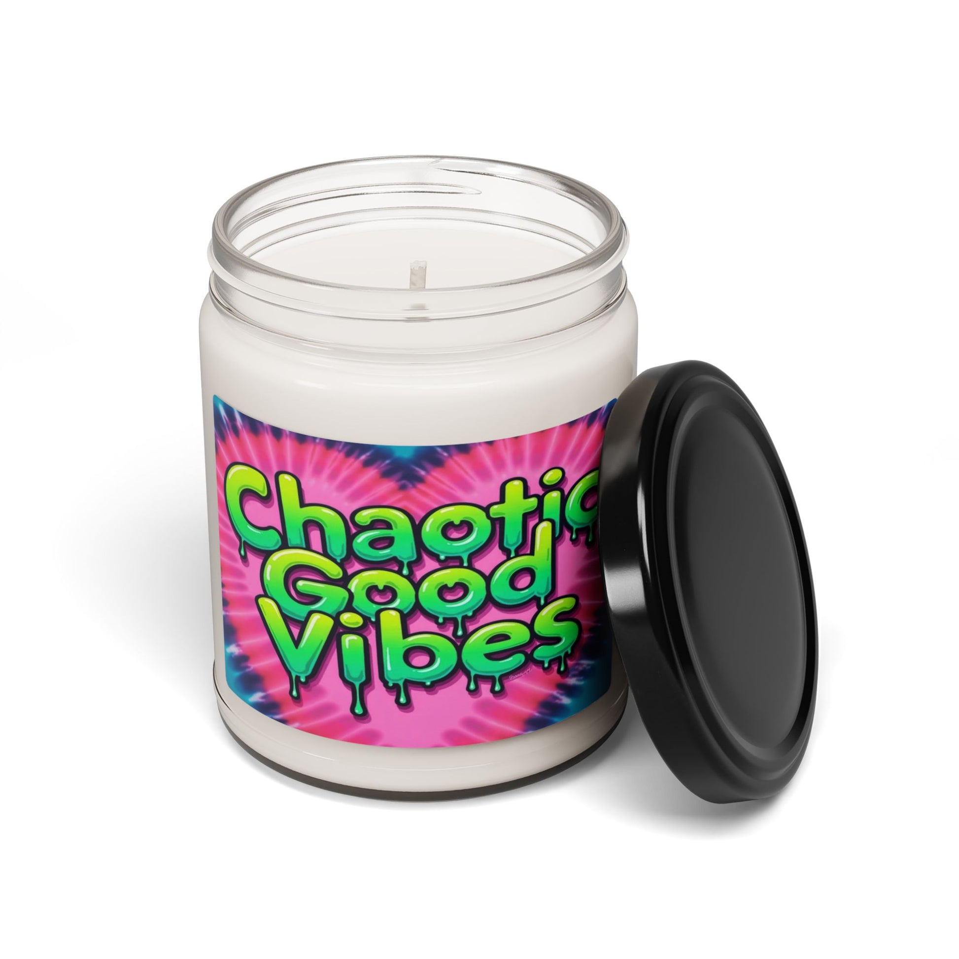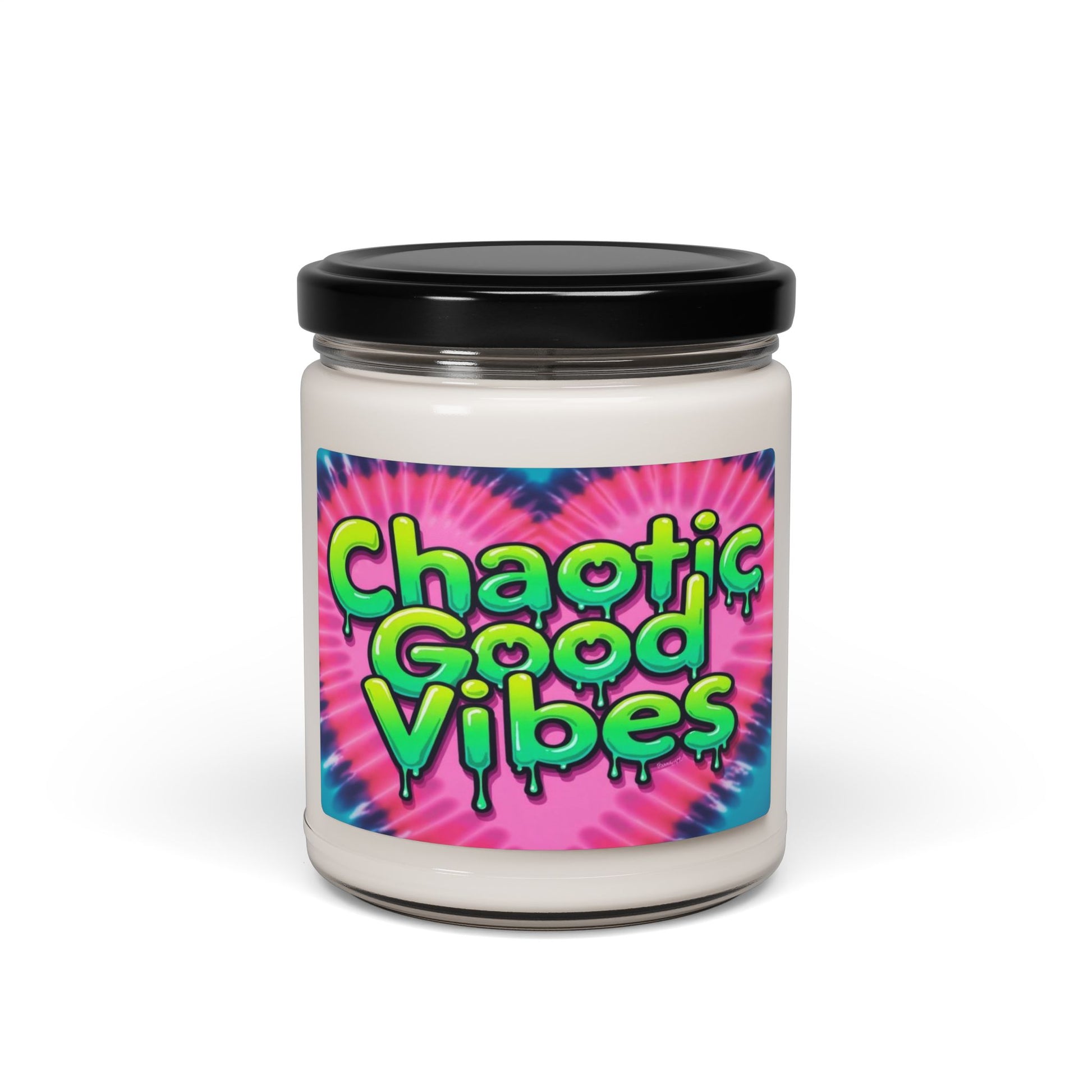 This vibrant graphic design features the text "Chaotic Good Vibes" in a bold, graffiti-inspired style with dripping, glossy green letters. The typography is set against a psychedelic tie-dye background with radial pink and blue color gradients creating a starburst effect. Each letter appears three-dimensional, with a glossy sheen and a melting, liquid-like quality that gives the text a dynamic and energetic feel. The color palette transitions from bright lime green to a slightly deeper teal green, creating depth and visual interest. The overall aesthetic evokes a sense of playful rebellion and positive energy, blending street art style with a nostalgic 90s/early 2000s graphic design approach.
