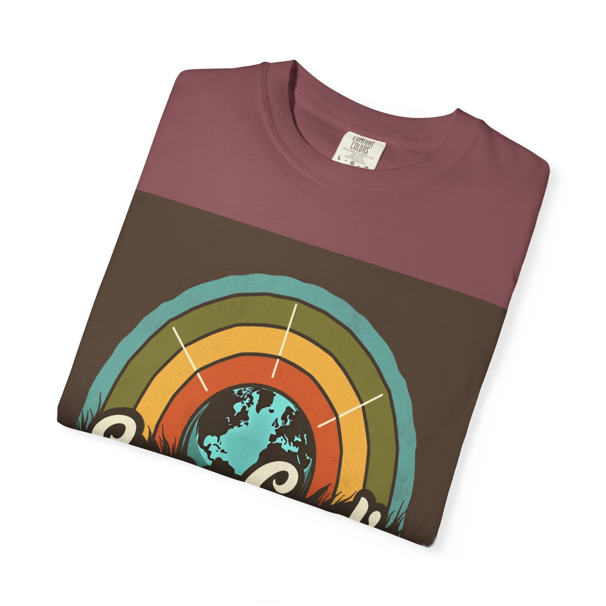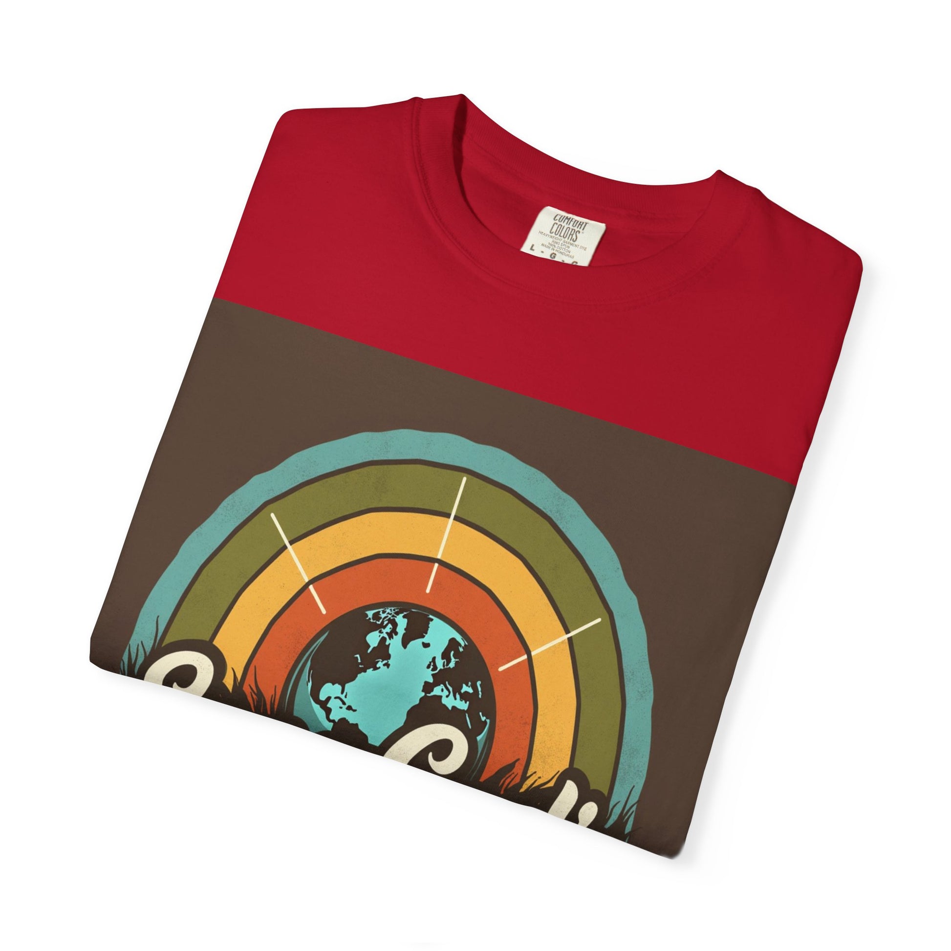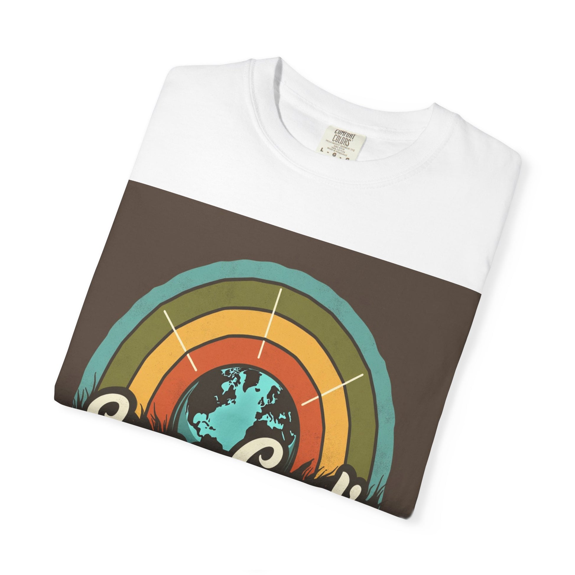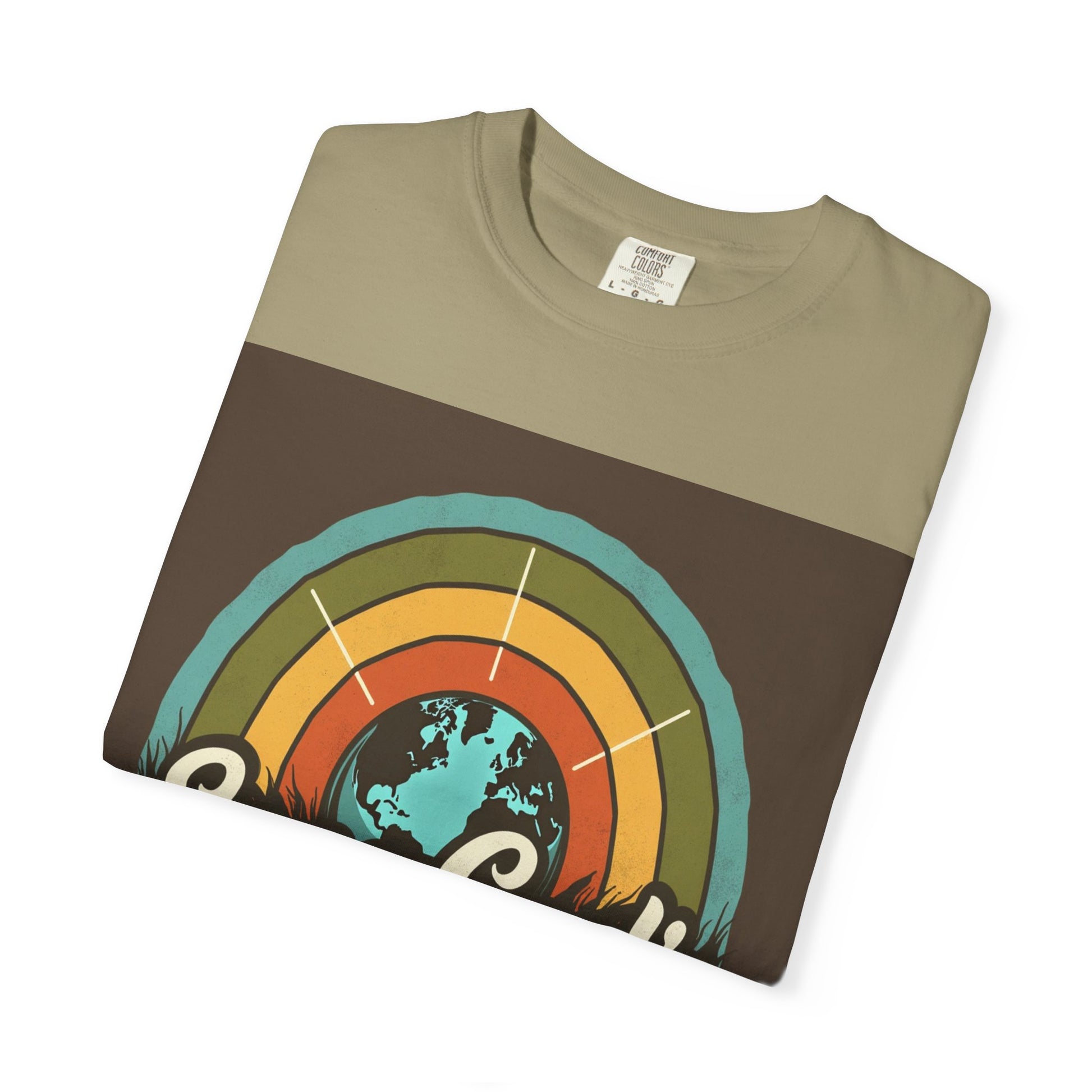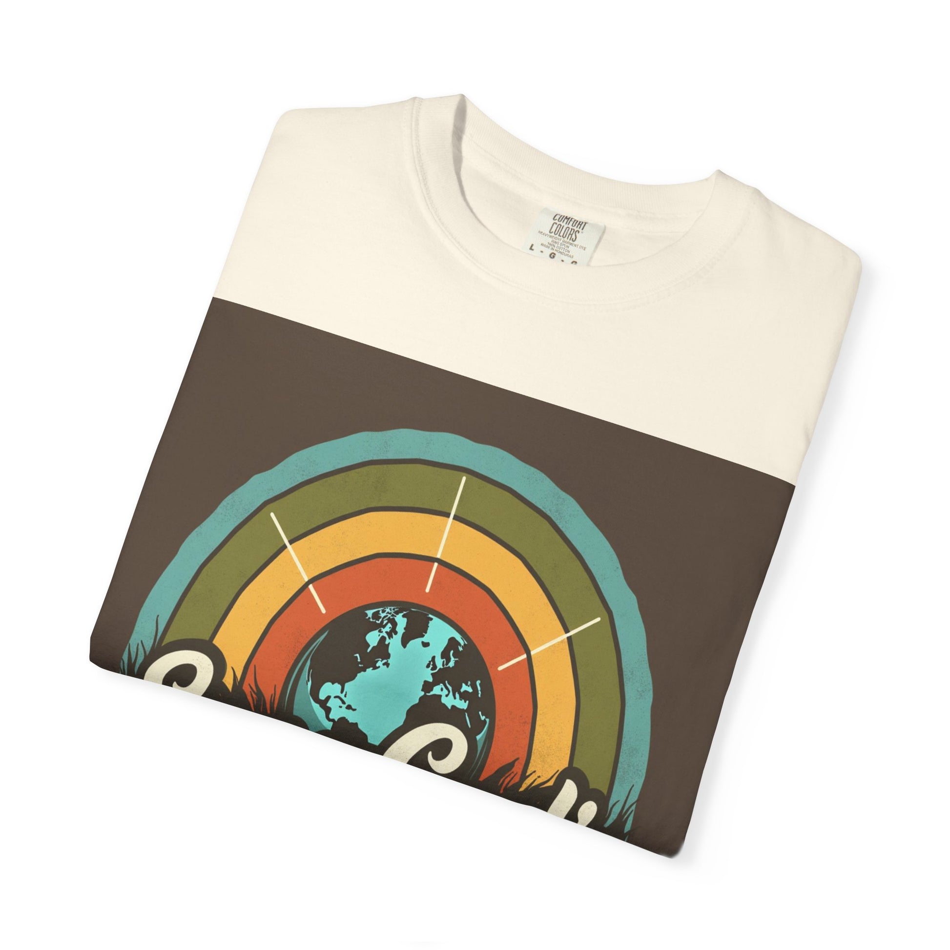 This vintage-inspired graphic design features a stylized Earth globe centered within a colorful, arc-like rainbow gradient of blue, green, yellow, and orange hues. The text "Save God's CREATION" appears prominently below the globe, rendered in a bold, retro typography with a slightly weathered texture. Small grass or vegetation silhouettes are visible at the bottom of the image, adding an organic element to the design. The color palette and graphic style evoke a nostalgic, 1970s environmental awareness aesthetic. The overall composition suggests a message of environmental stewardship and planetary conservation from a faith-based perspective.