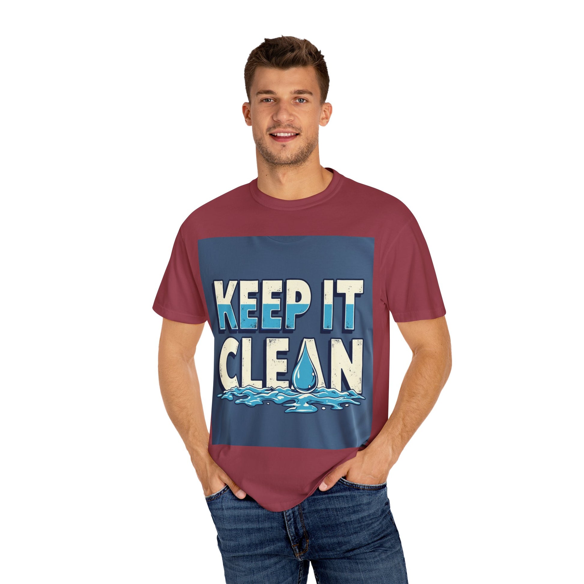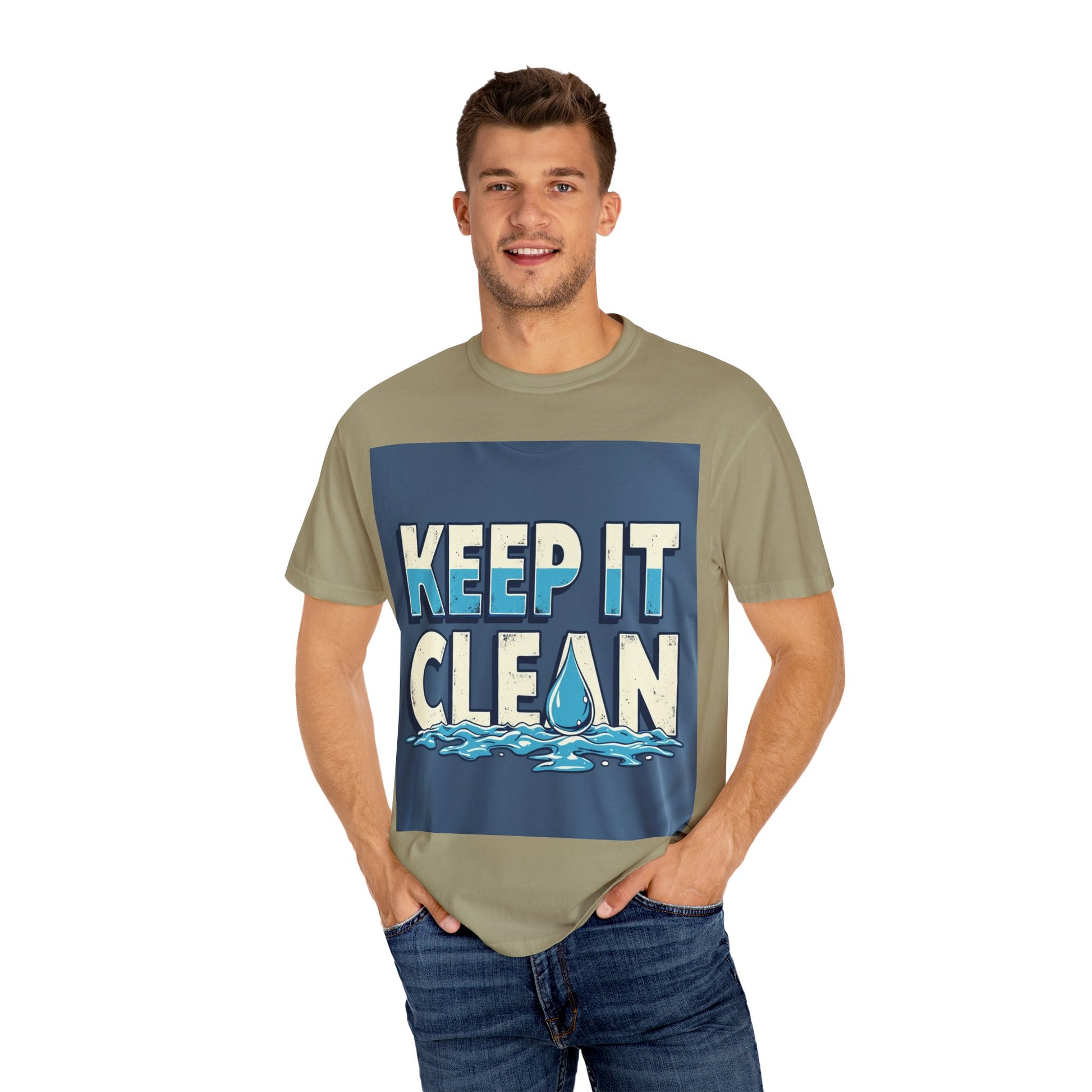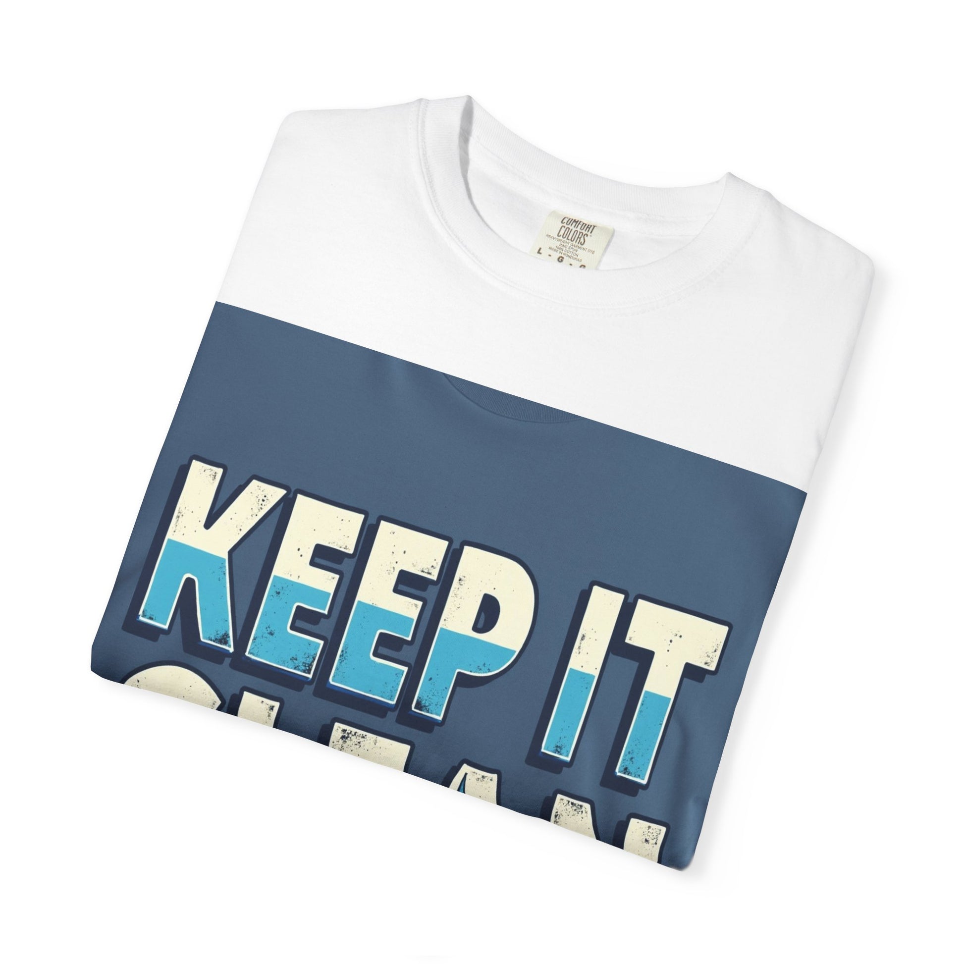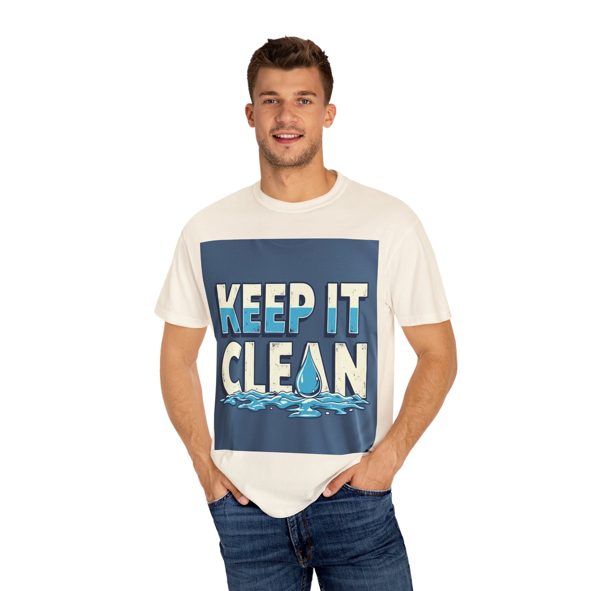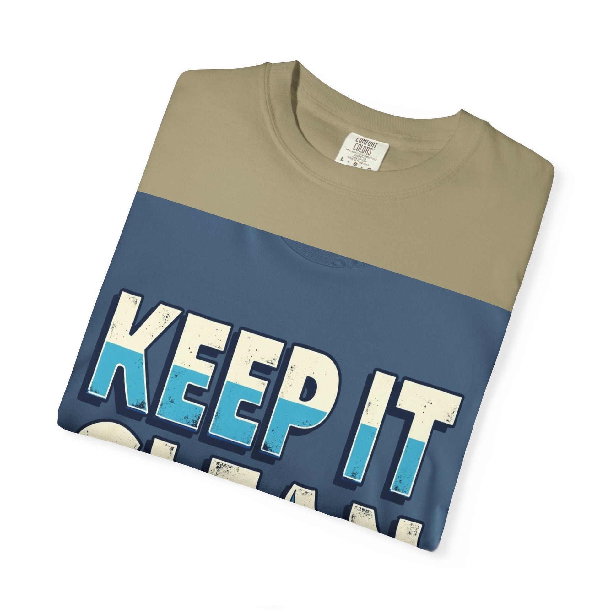 This image features a graphic design with the text "KEEP IT CLEAN" displayed in large, bold letters against a blue-gray background. The typography is stylized with a vintage, slightly distressed look, with the letters "KEEP IT" in white and cream tones, and "CLEAN" in a similar color palette. A stylized water droplet sits at the bottom of the letter "A" in "CLEAN", with rippling water waves beneath it in shades of blue. The design has a three-dimensional effect with shadowing and layering that gives depth to the text. The overall aesthetic suggests an environmental or cleanliness message, utilizing a clean and crisp graphic design style.
