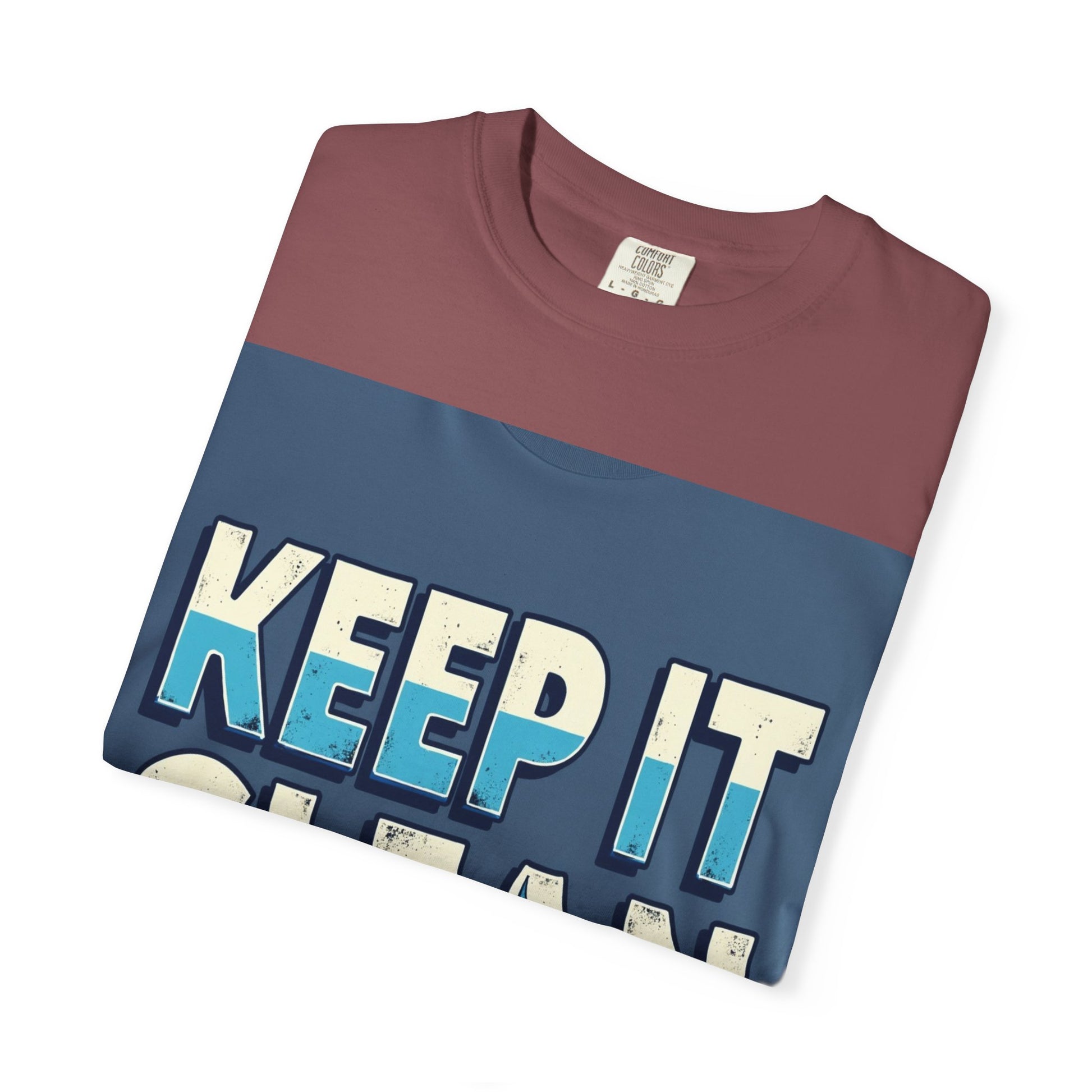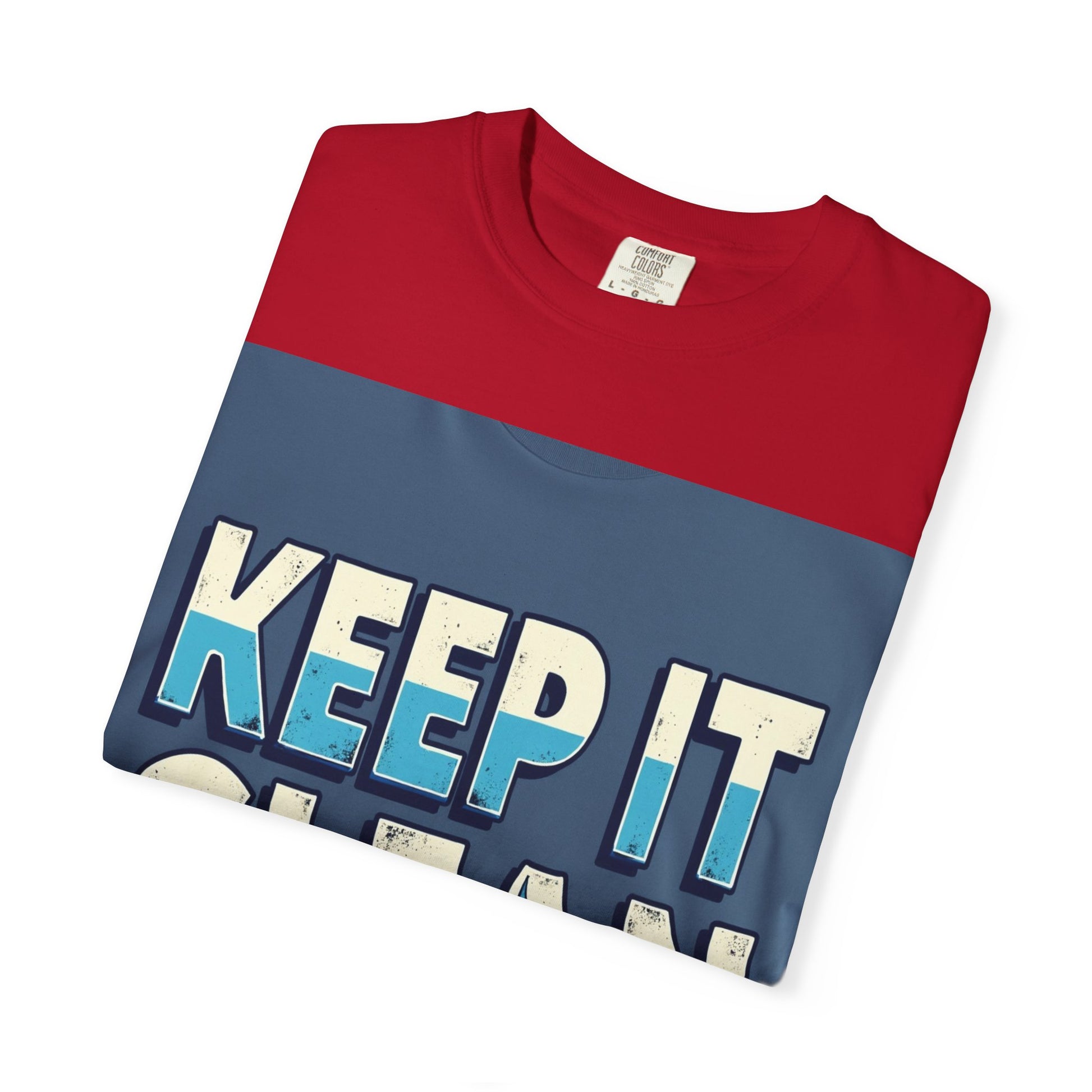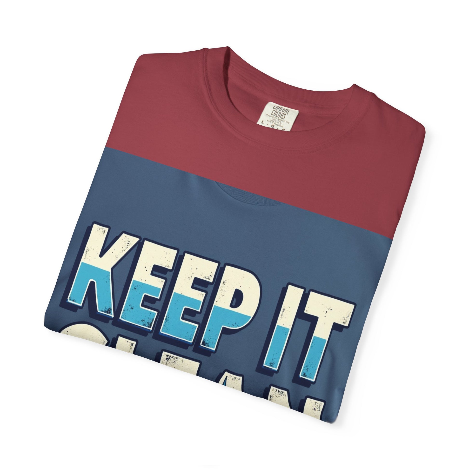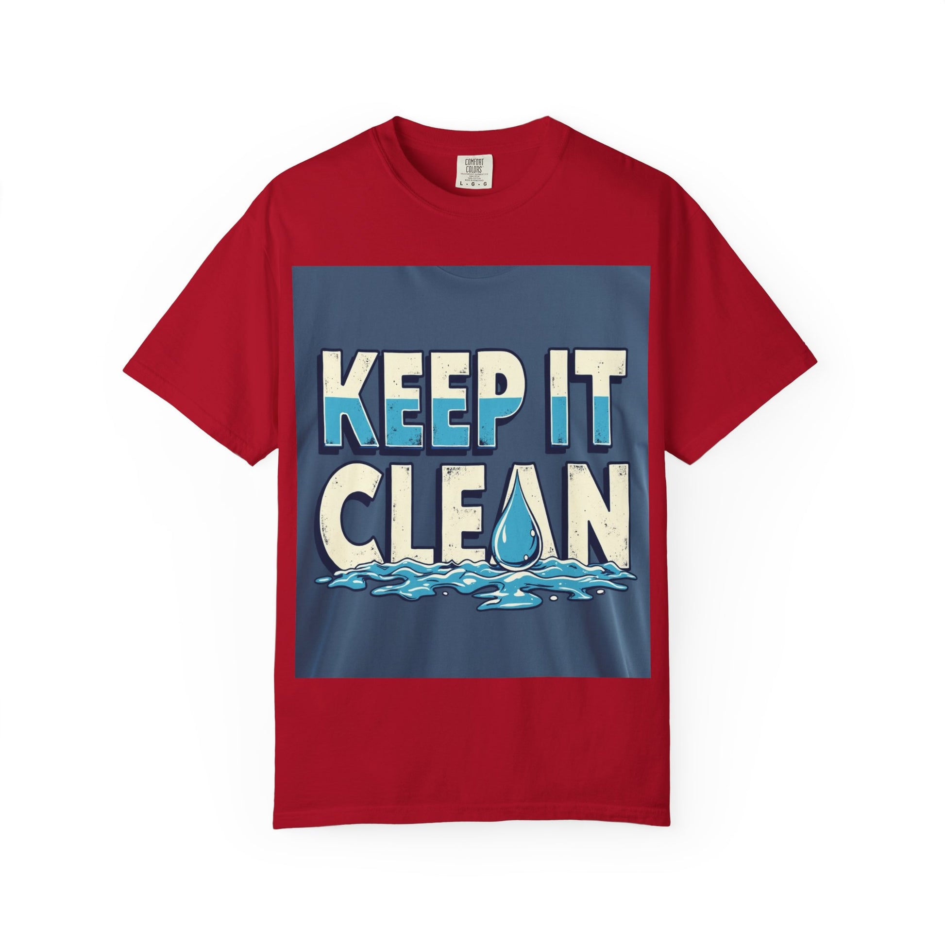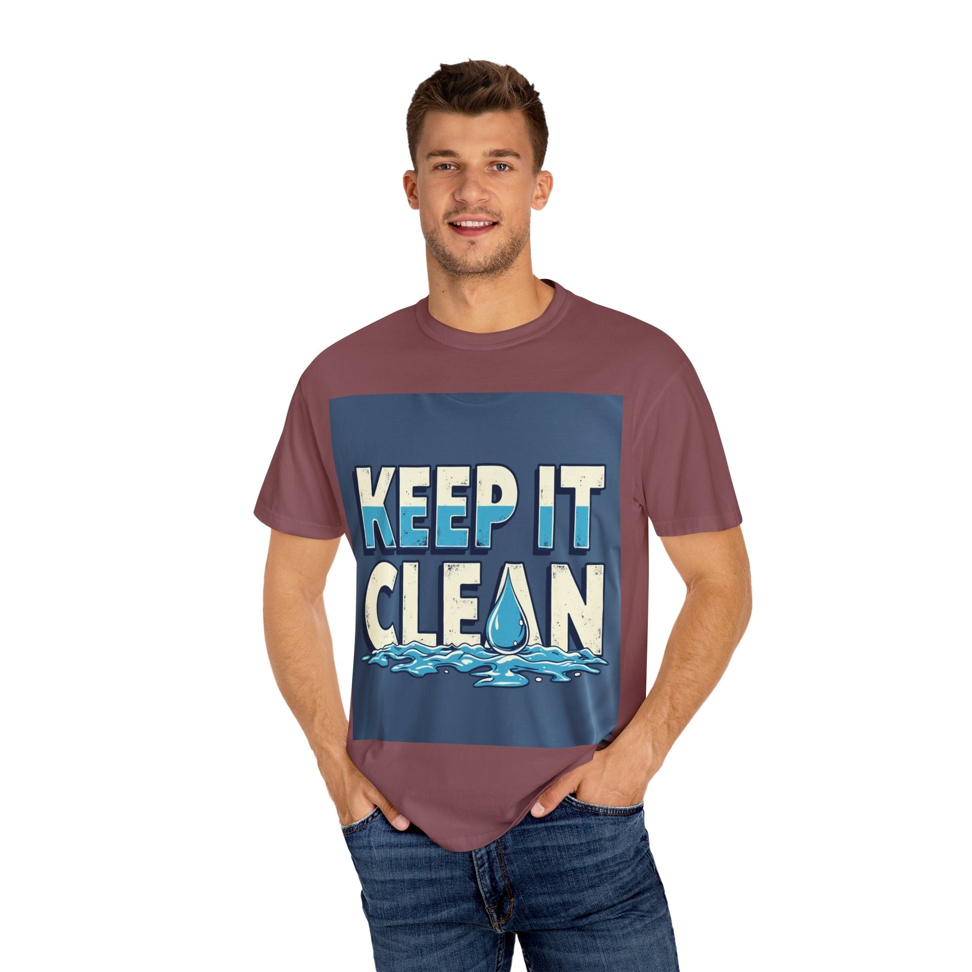 This image features a graphic design with the text "KEEP IT CLEAN" displayed in large, bold letters against a blue-gray background. The typography is stylized with a vintage, slightly distressed look, with the letters "KEEP IT" in white and cream tones, and "CLEAN" in a similar color palette. A stylized water droplet sits at the bottom of the letter "A" in "CLEAN", with rippling water waves beneath it in shades of blue. The design has a three-dimensional effect with shadowing and layering that gives depth to the text. The overall aesthetic suggests an environmental or cleanliness message, utilizing a clean and crisp graphic design style.