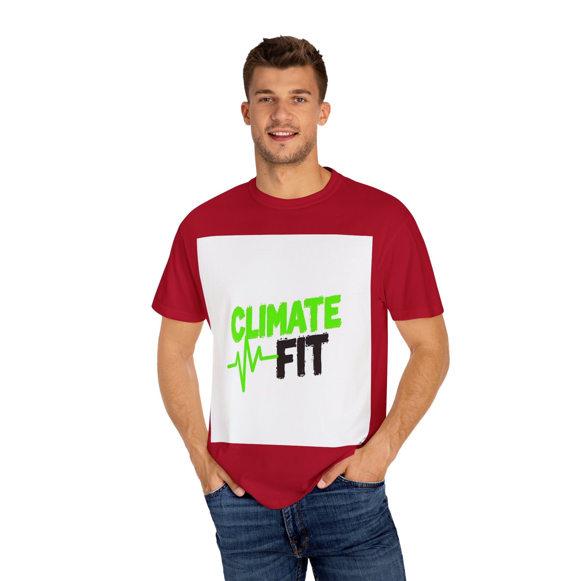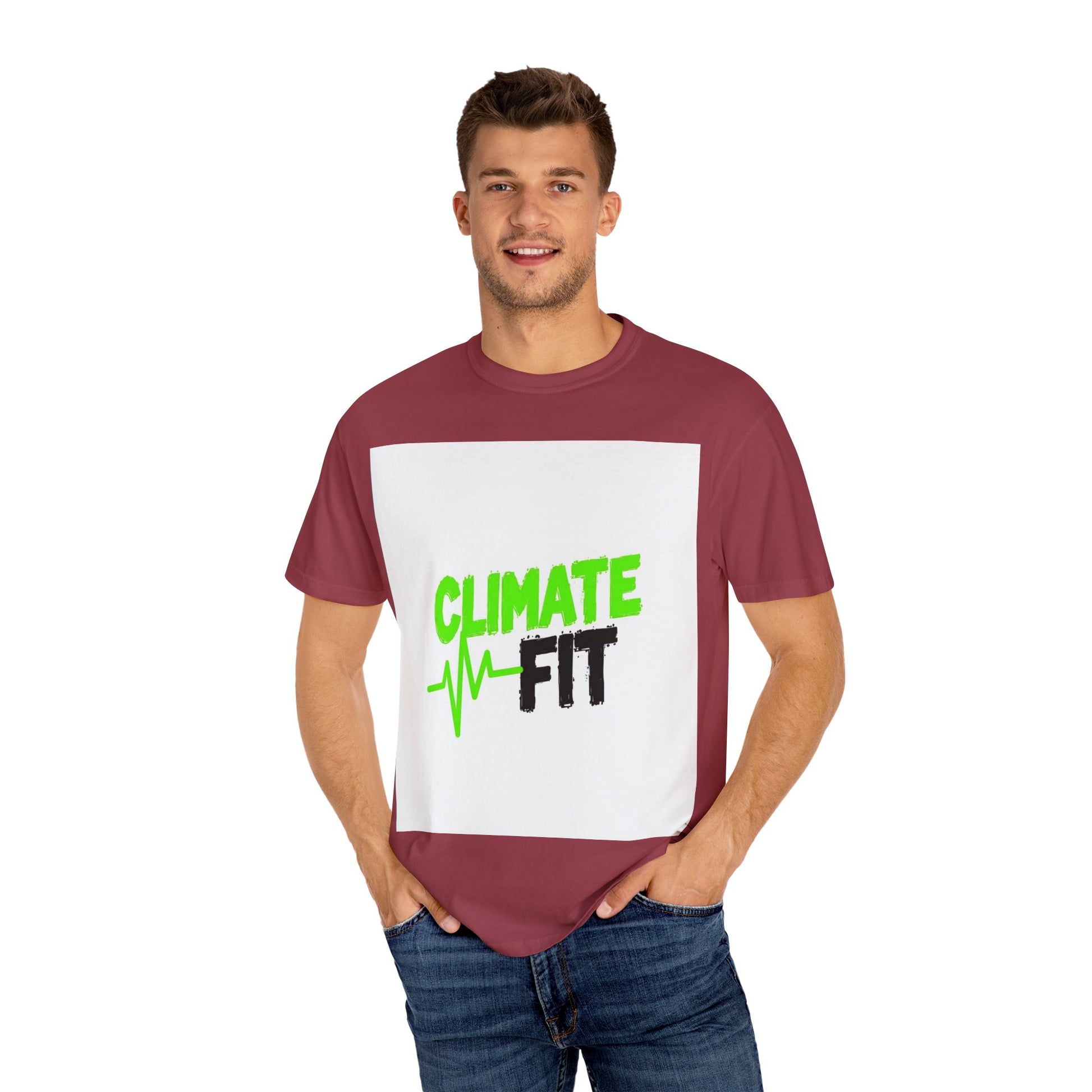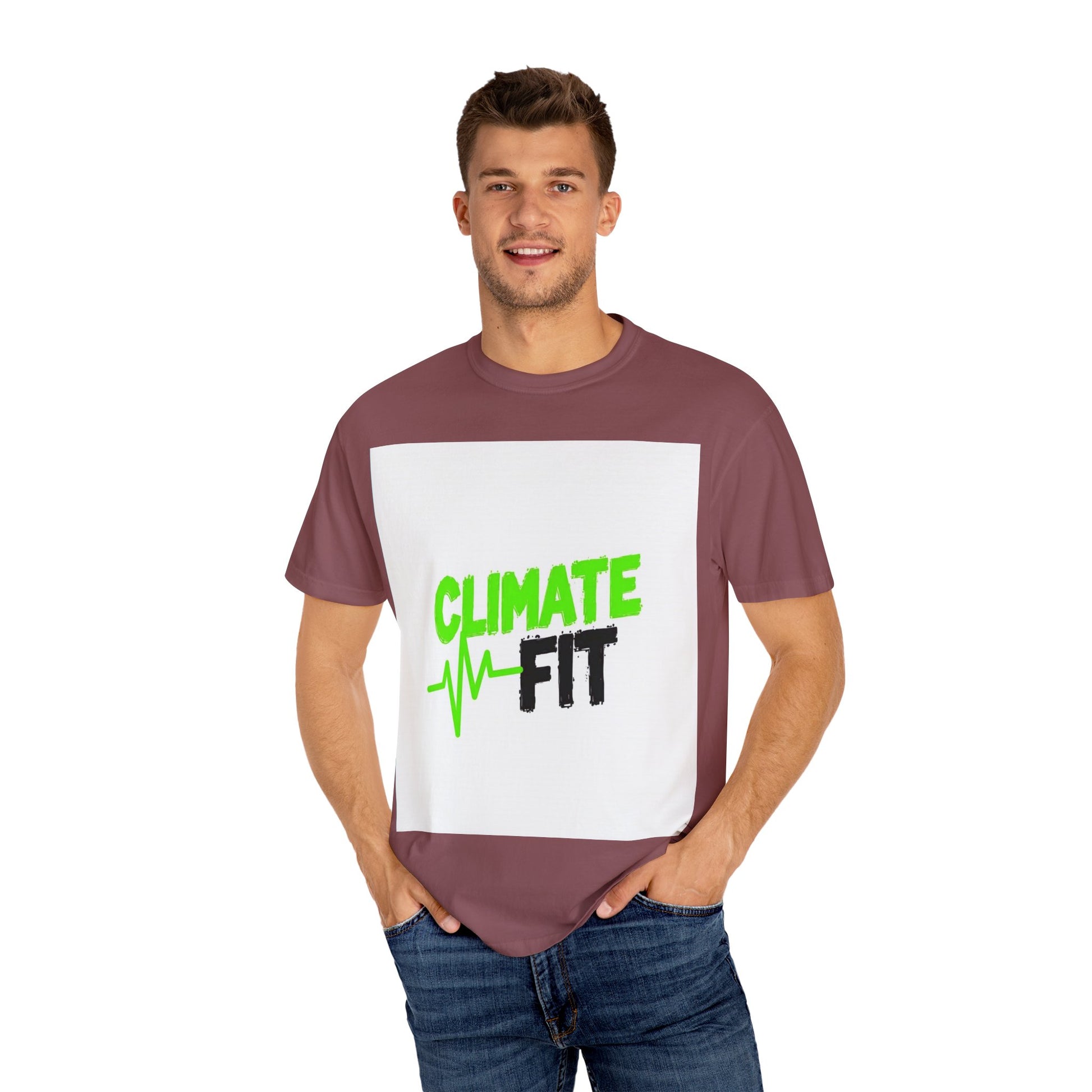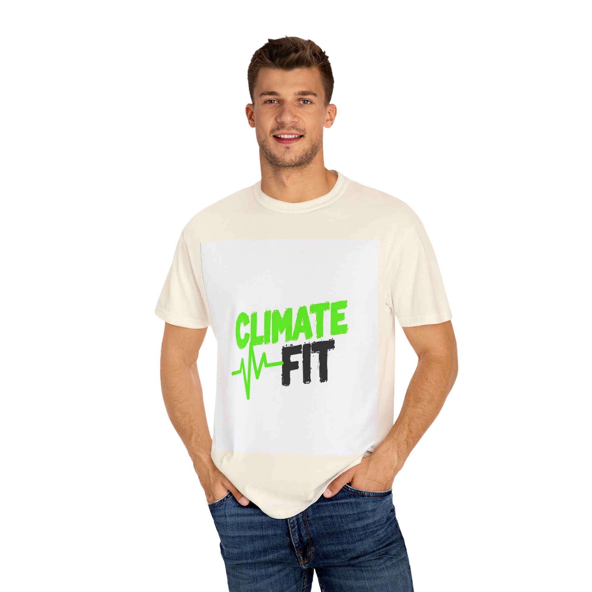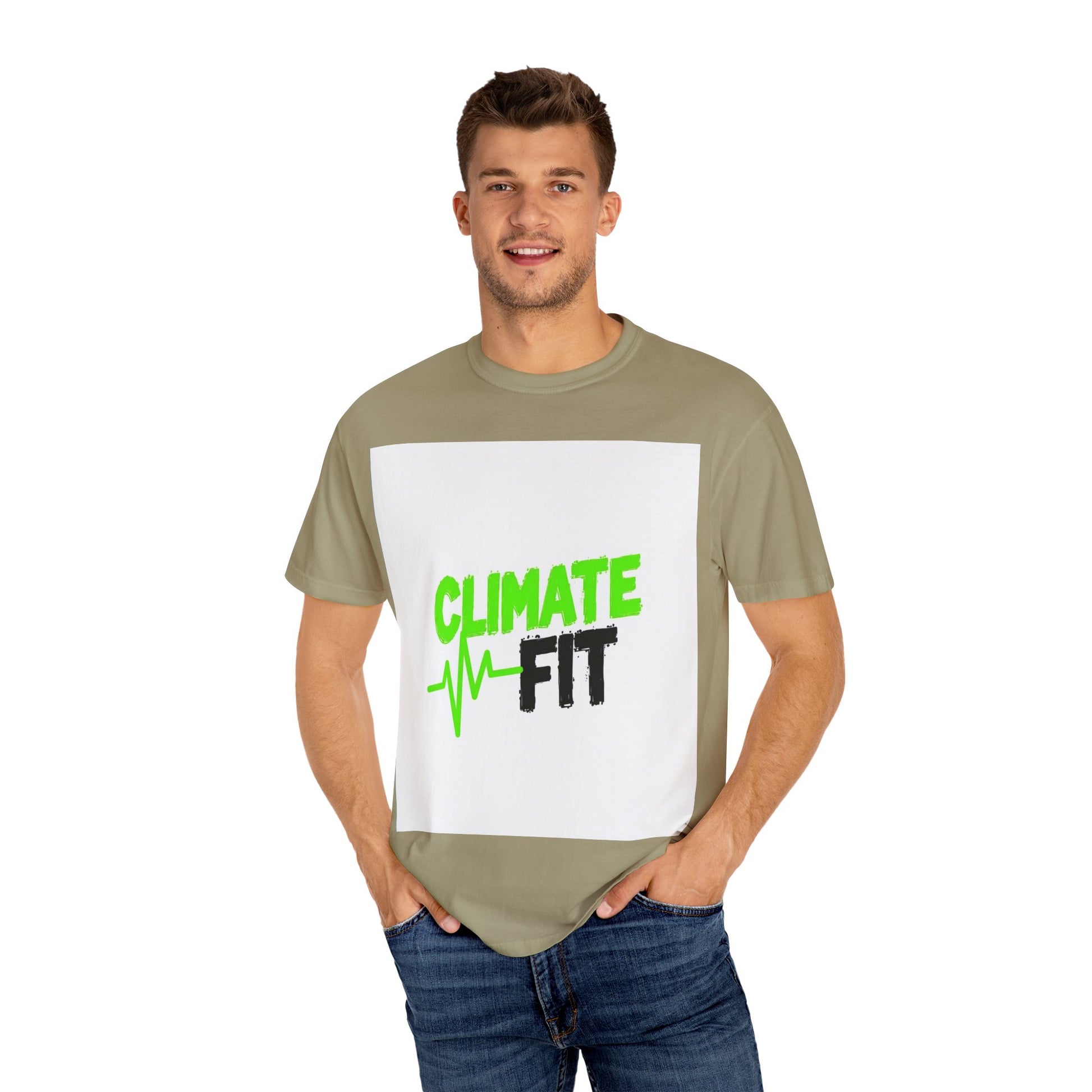 The image displays a bold graphic design featuring the text "CLIMATE FIT" in a dynamic, high-contrast style. The words are rendered in bright neon green and black, with the "CLIMATE" portion accompanied by a green heartbeat or pulse line graphic. The typography appears rough and slightly distressed, giving the design an energetic and impactful feel. The text is centered on a plain white background, creating a stark visual contrast. The overall design suggests a modern, health or environmental-related concept that connects climate awareness with fitness or well-being.