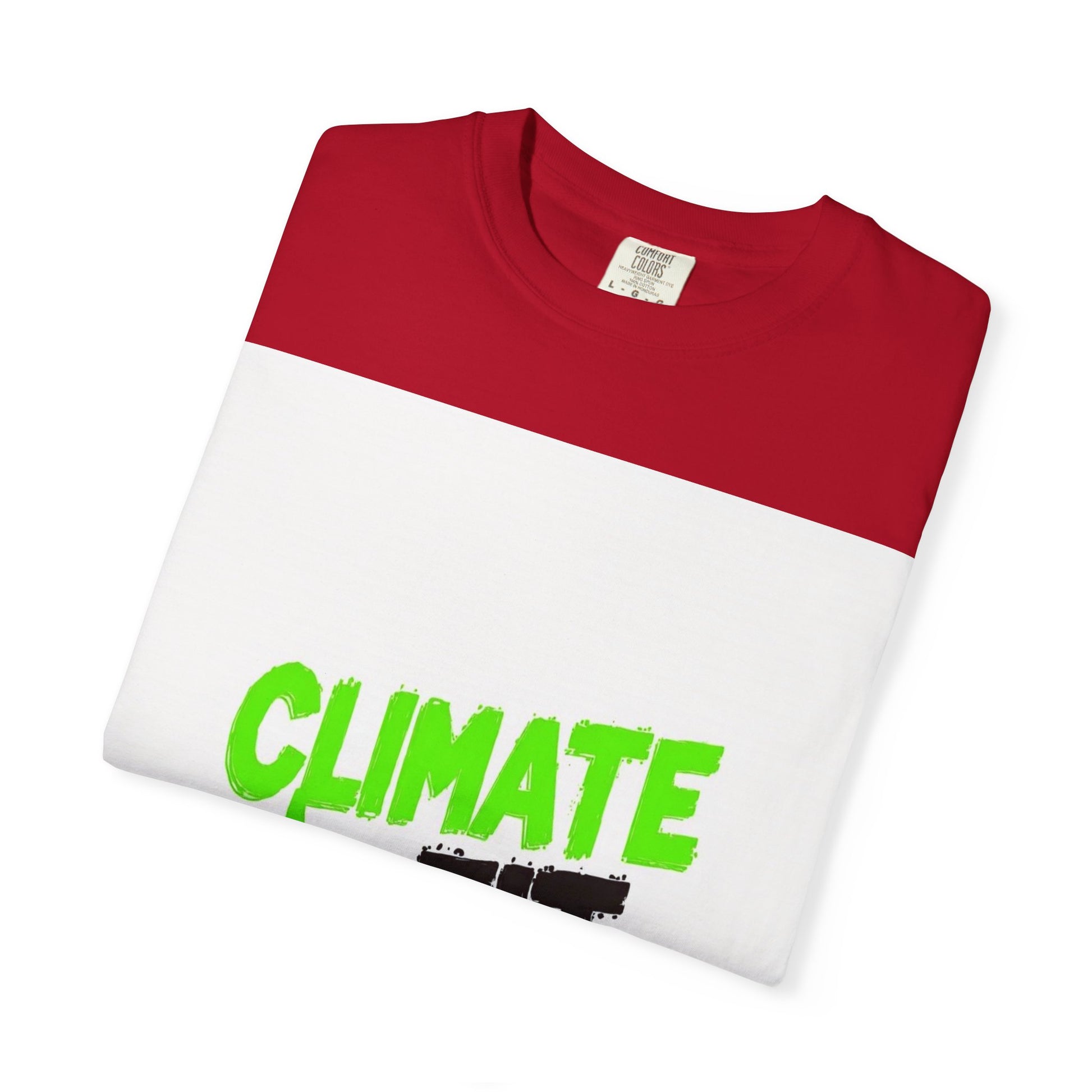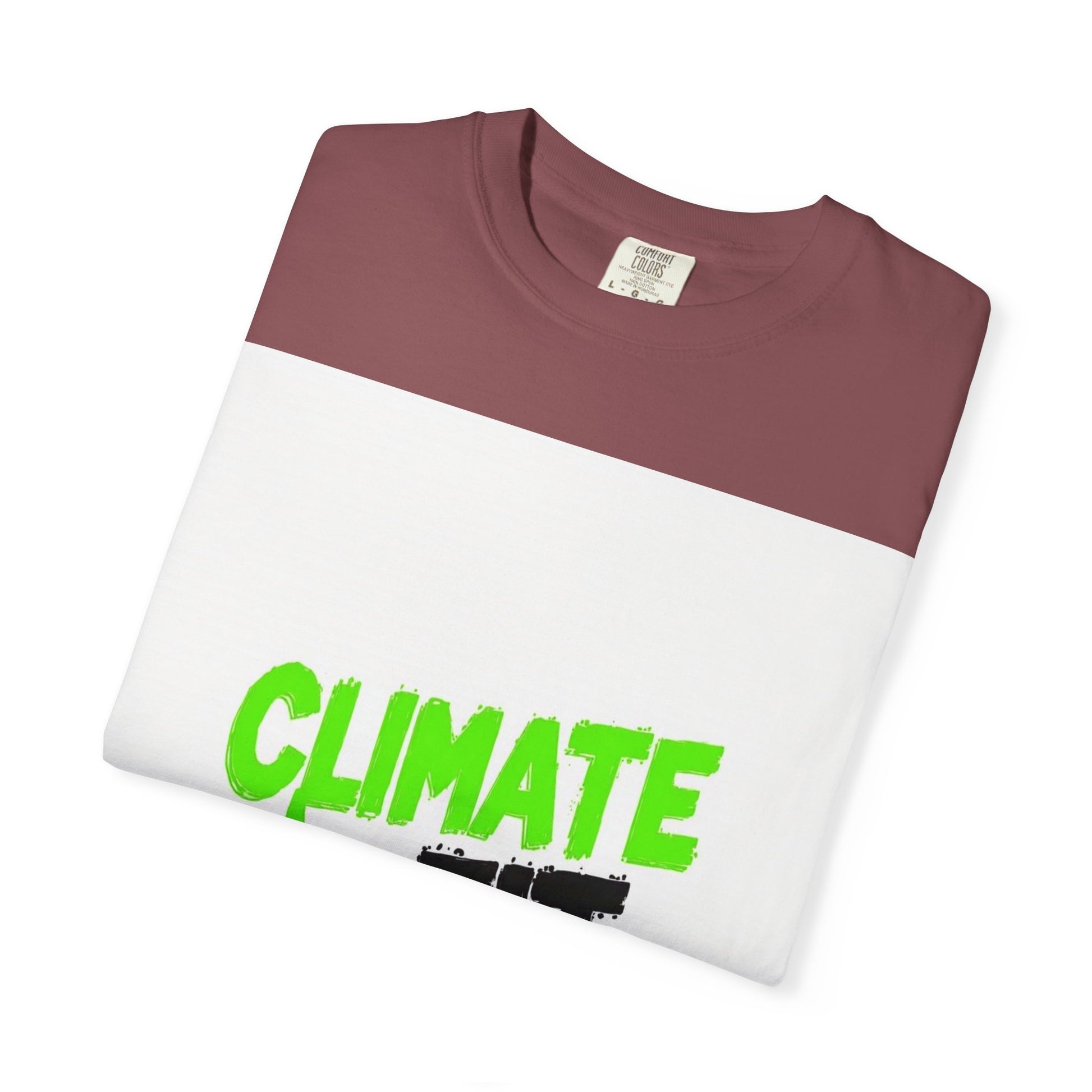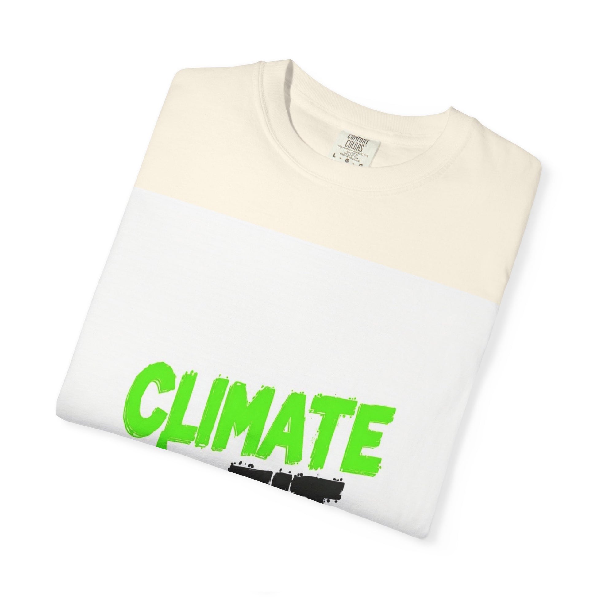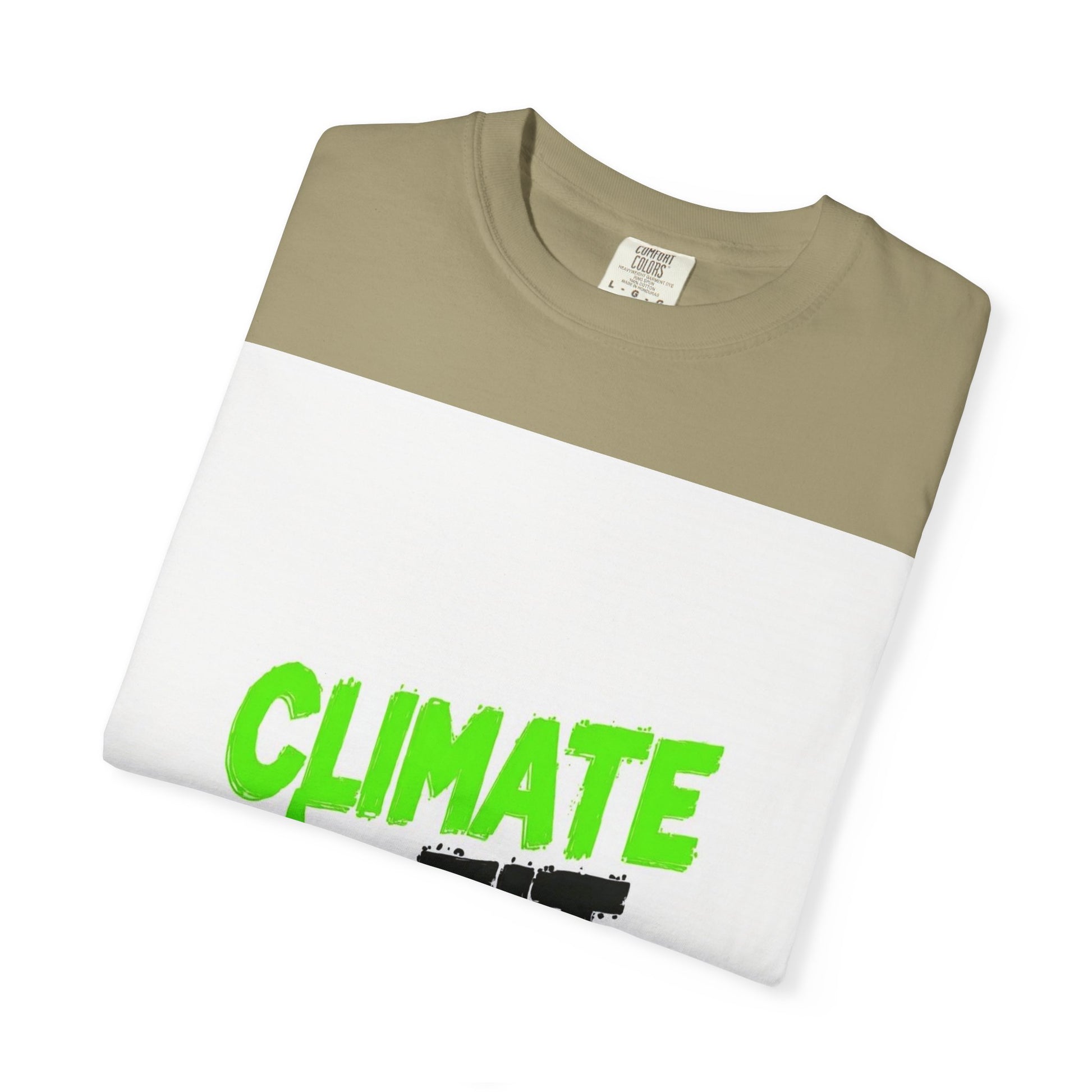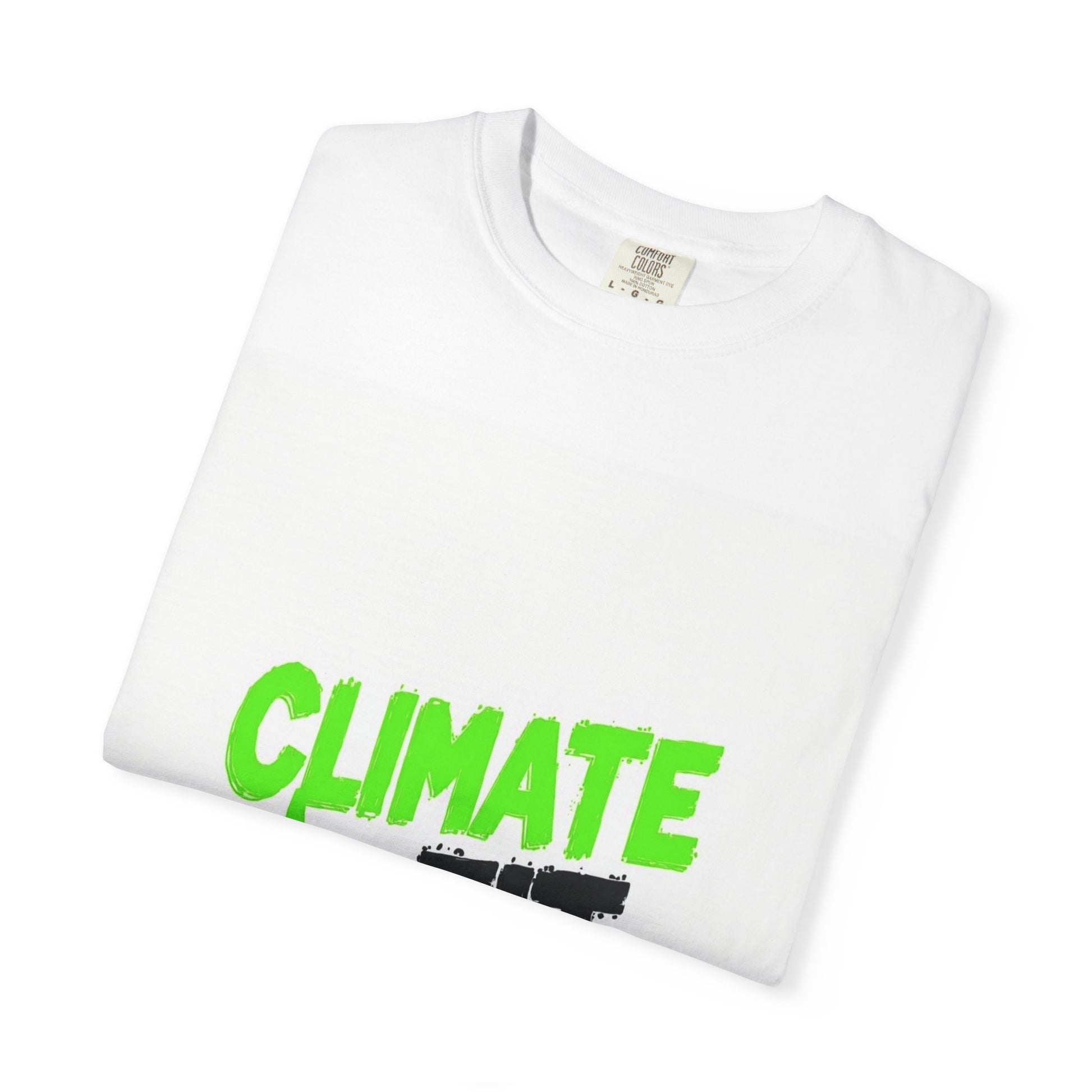 The image displays a bold graphic design featuring the text "CLIMATE FIT" in a dynamic, high-contrast style. The words are rendered in bright neon green and black, with the "CLIMATE" portion accompanied by a green heartbeat or pulse line graphic. The typography appears rough and slightly distressed, giving the design an energetic and impactful feel. The text is centered on a plain white background, creating a stark visual contrast. The overall design suggests a modern, health or environmental-related concept that connects climate awareness with fitness or well-being.