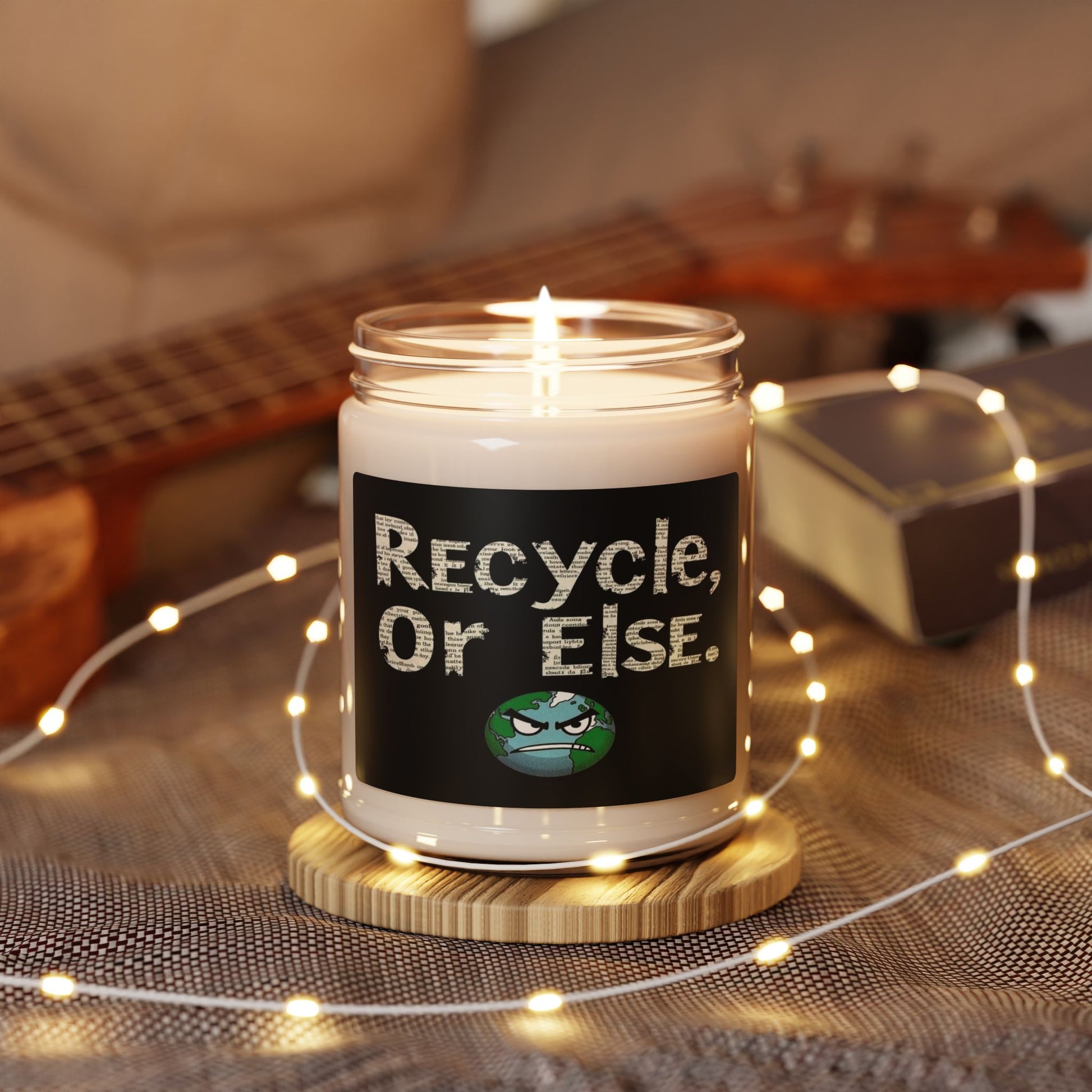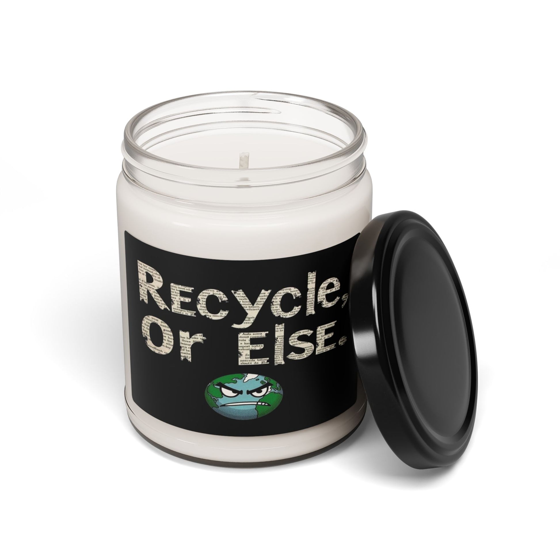 This striking graphic design features the text "Recycle, or else" written in large letters composed of newspaper or book text against a black background. The letters are filled with fragments of text, creating a collage-like effect that adds depth and texture to the typography. Below the text is a stylized cartoon Earth with an angry, frustrated expression, colored in green and blue tones. The planet's face shows furrowed brows and a grimacing mouth, suggesting a sense of urgency and frustration about environmental issues. The overall design uses a powerful visual metaphor to communicate the importance of recycling and environmental conservation.