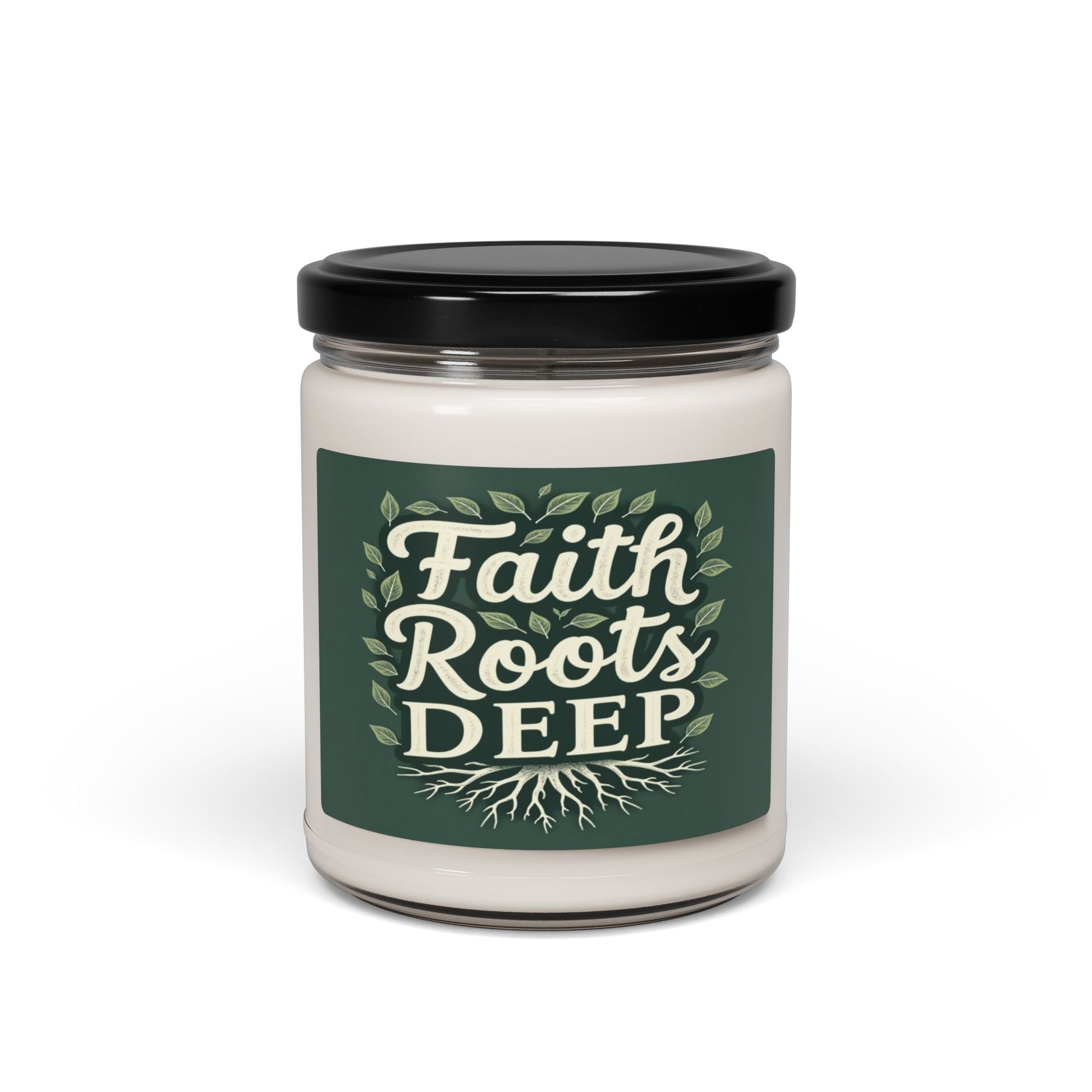 This inspirational typography artwork features the phrase "Faith Roots Deep" in a stylized, vintage-inspired lettering design. The text is surrounded by delicate green leaves, creating a natural, organic border that frames the words. At the bottom of the composition, a detailed root system is illustrated, symbolizing strength, grounding, and growth. The color palette is dominated by deep green tones with cream-colored text, giving the design a calm, earthy feel. The overall style blends hand-drawn typography with botanical illustration, creating a visually compelling and meaningful graphic.