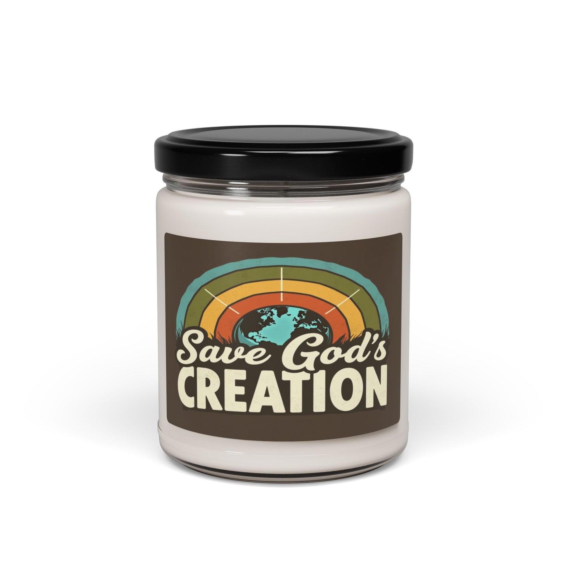 This vintage-style graphic design features a powerful environmental message centered around the Earth. The image showcases a stylized globe surrounded by a rainbow-like gradient of blue, green, yellow, and orange colors, creating a retro aesthetic. The text "Save God's CREATION" is prominently displayed at the bottom of the image in large, textured white letters, emphasizing a religious environmental stewardship theme. Small grass or blade-like elements frame the bottom of the design, adding a natural, grounded feel to the composition. The overall color palette and design evoke a sense of nostalgia while communicating a serious call to protect and preserve the planet.