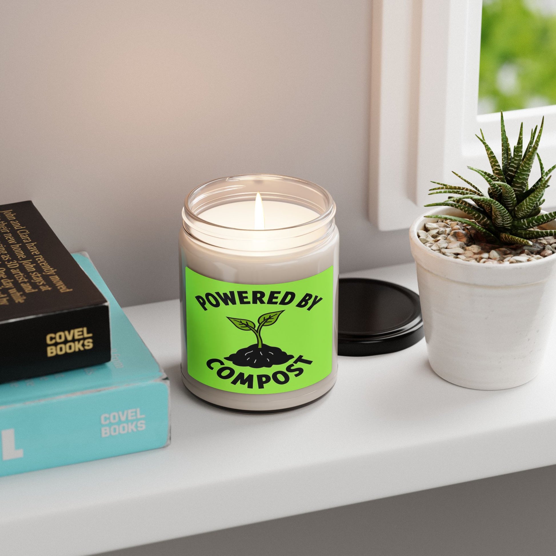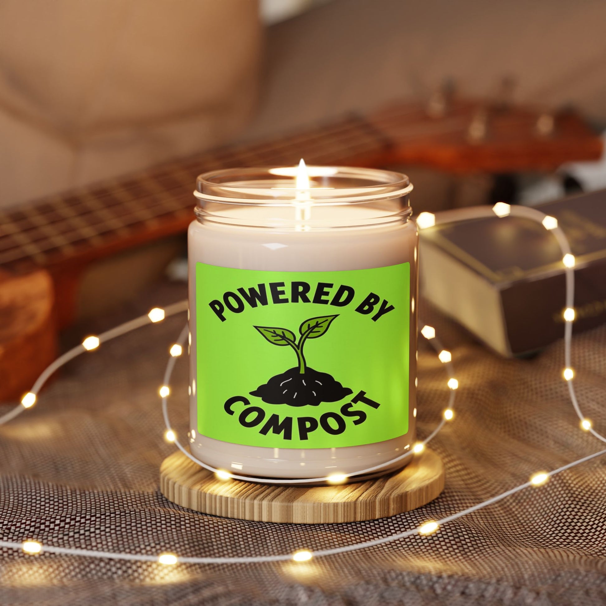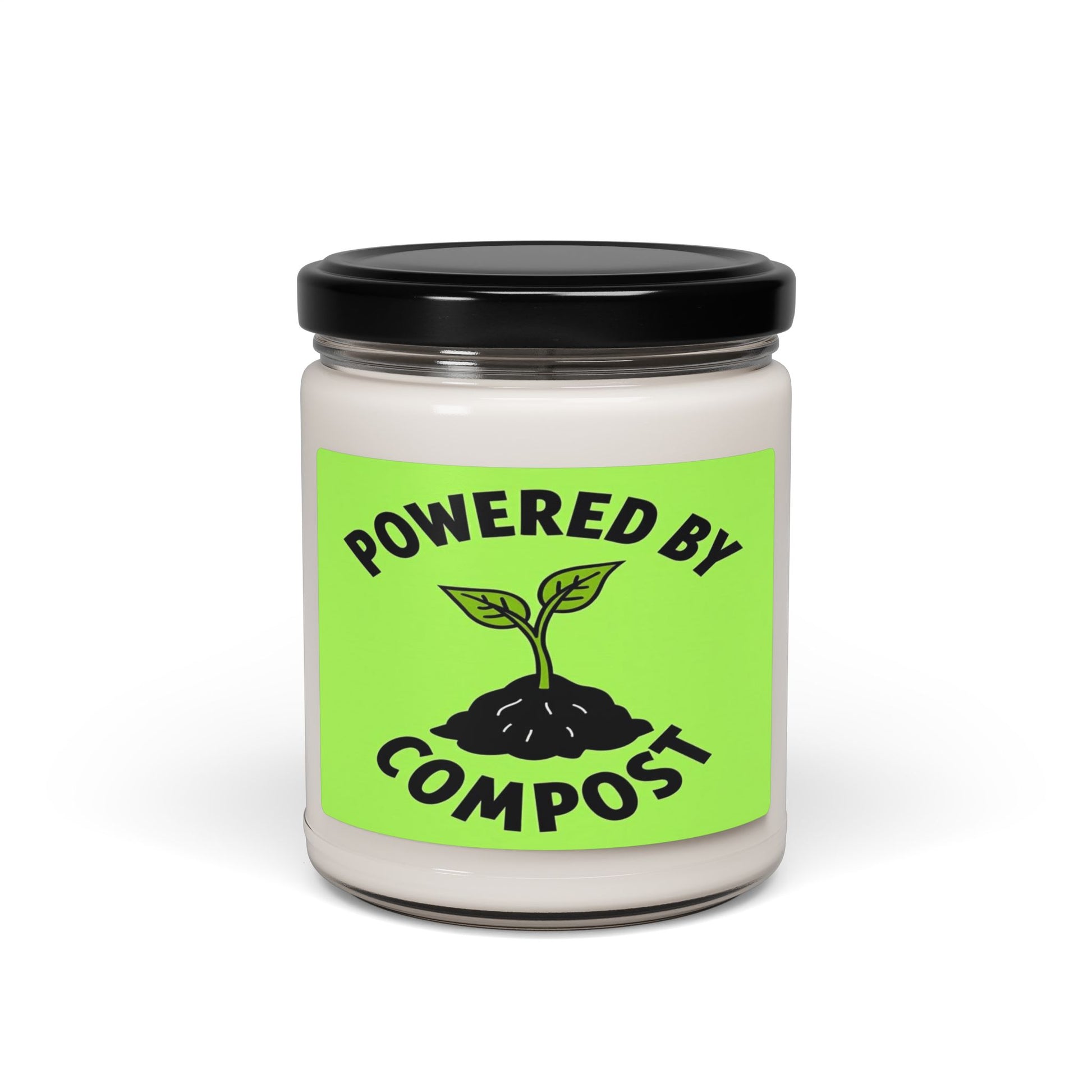 This graphic design image features a bold, minimalist illustration with the text "POWERED BY COMPOST" arched around a stylized plant seedling. The seedling emerges from a black, textured mound representing soil or compost, with a vibrant lime green background providing high contrast. The plant has two simple, stylized leaves in a slightly darker green shade, connected to a thin stem rooted in the dark earth. The typography is large, blocky, and curved, creating a strong visual statement about sustainability and ecological growth. The overall design aesthetic is clean, modern, and conveys an environmentally friendly message through its graphic simplicity.