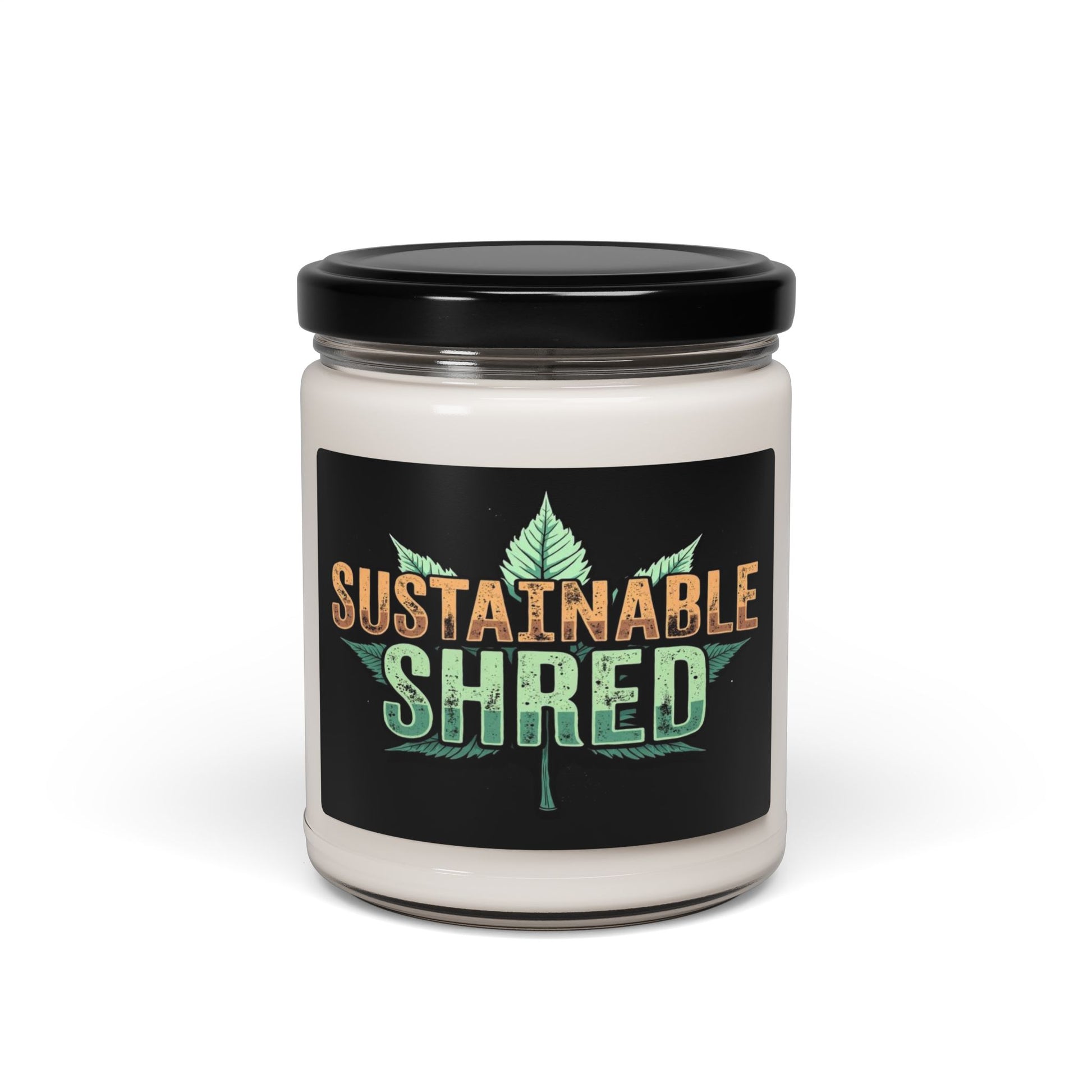 The image features a graphic design centered around the text "SUSTAINABLE SHRED" stylized with a distressed, vintage effect. The words are positioned against a black background and framed by cannabis leaf silhouettes in shades of green and mint. The typography uses bold, uppercase letters in warm orange and cool green tones, creating a visually striking contrast. The leaf elements are detailed with visible veins and textures, suggesting an eco-friendly or cannabis-related theme. The overall design has a grungy, artistic aesthetic with a textured overlay that gives the graphic a worn, screen-printed appearance.