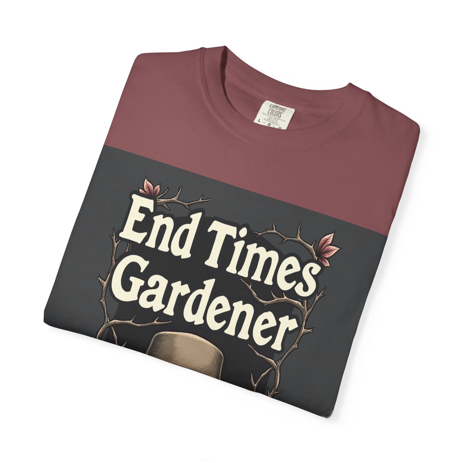 This graphic design artwork features a stylized skull wearing a wide-brimmed hat, centered within a frame of intricate, thorny branches. The text "End Times Gardener" is prominently displayed in large, cream-colored letters above the skull. Pruning shears are crossed below the skull, adding to the gardening theme and creating a dark, humorous visual. The image is rendered in a monochromatic color palette with subtle hints of pink on the leaves, giving it a vintage, slightly macabre aesthetic. The illustration combines elements of botanical imagery with a gothic, edgy style that suggests a playful take on gardening culture.