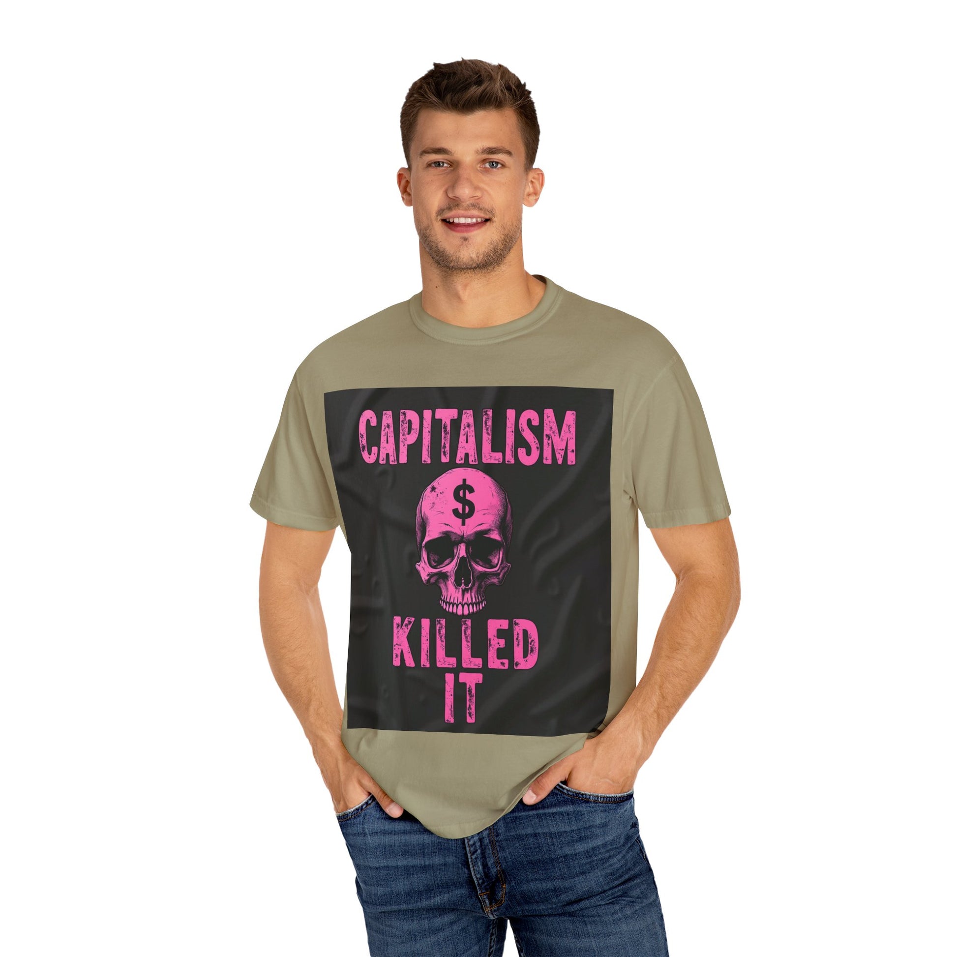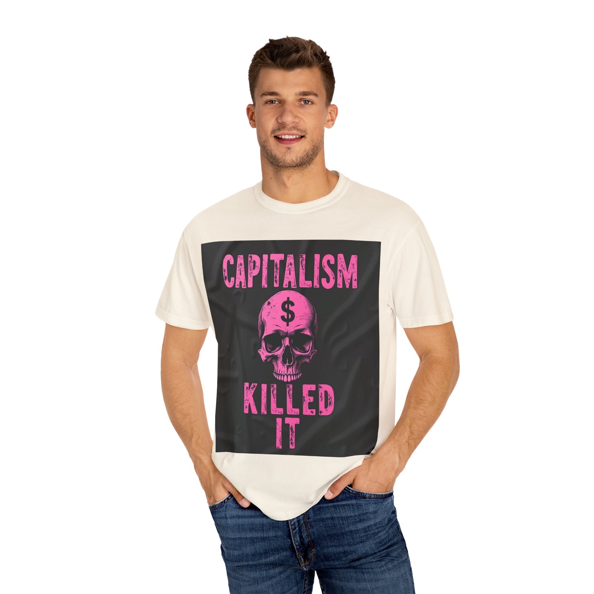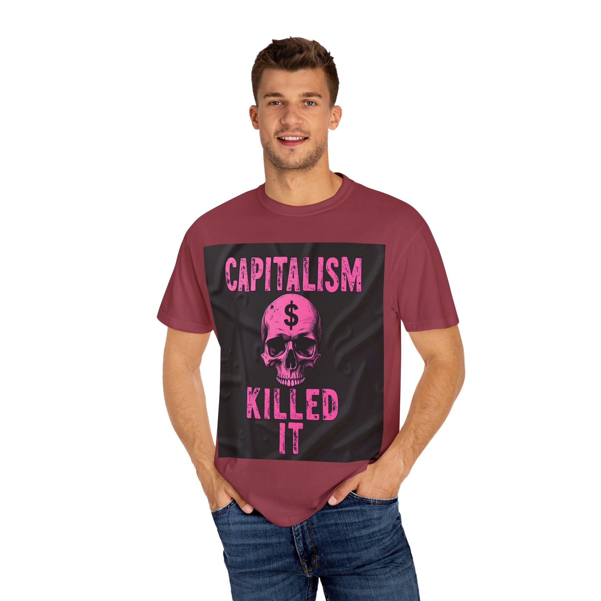 This graphic design artwork features a provocative anti-capitalist message in a striking pink and black color scheme. The image depicts a detailed, stylized human skull with a dollar sign positioned where the forehead would be, symbolizing the destructive nature of capitalism. The words "CAPITALISM KILLED IT" are displayed in large, distressed pink letters above and below the skull, creating a bold visual statement. The skull is rendered in a gritty, engraved-style illustration technique with sharp lines and deep shadows, giving it an intense and confrontational appearance. The background is a dark, blurred texture that provides contrast and depth to the central graphic elements.