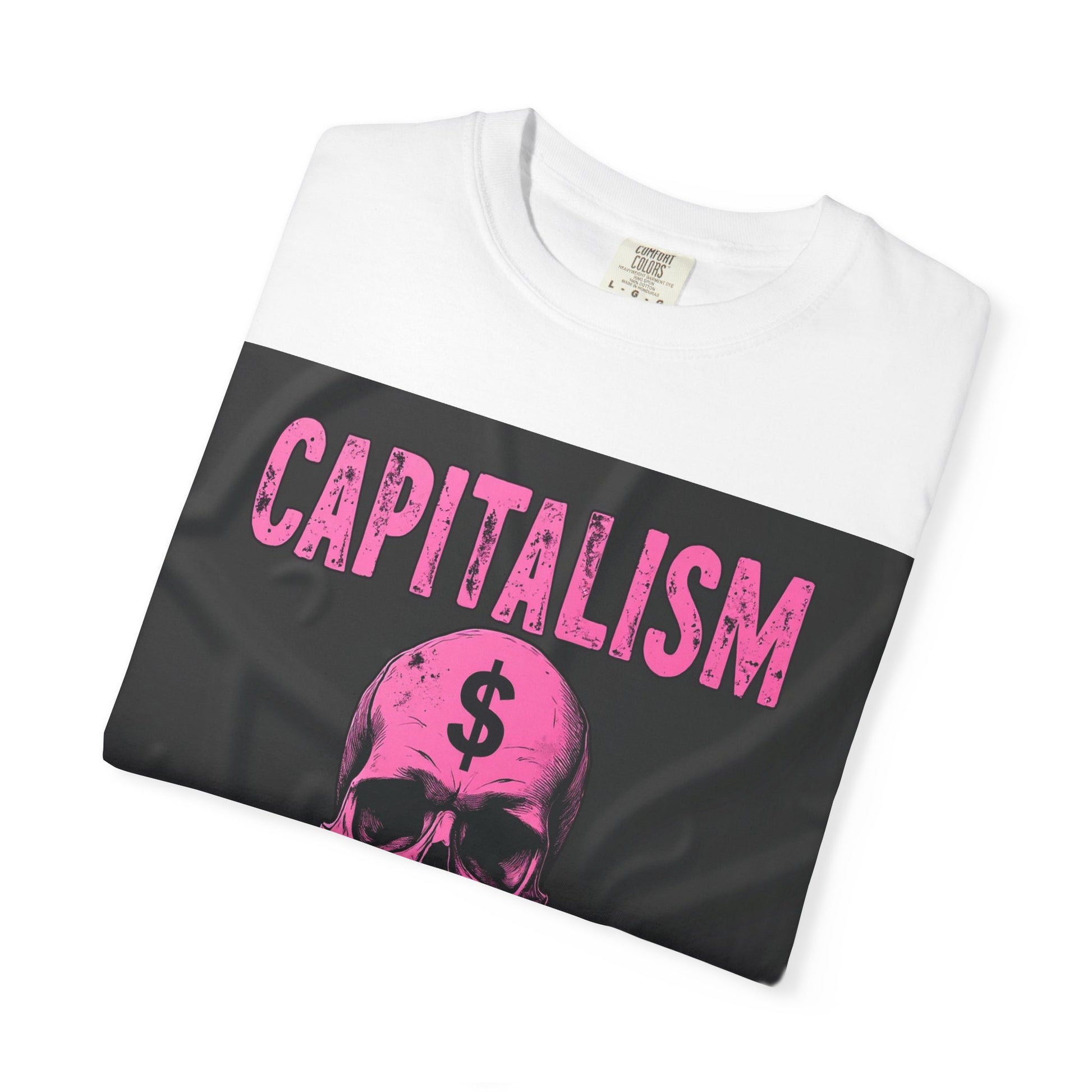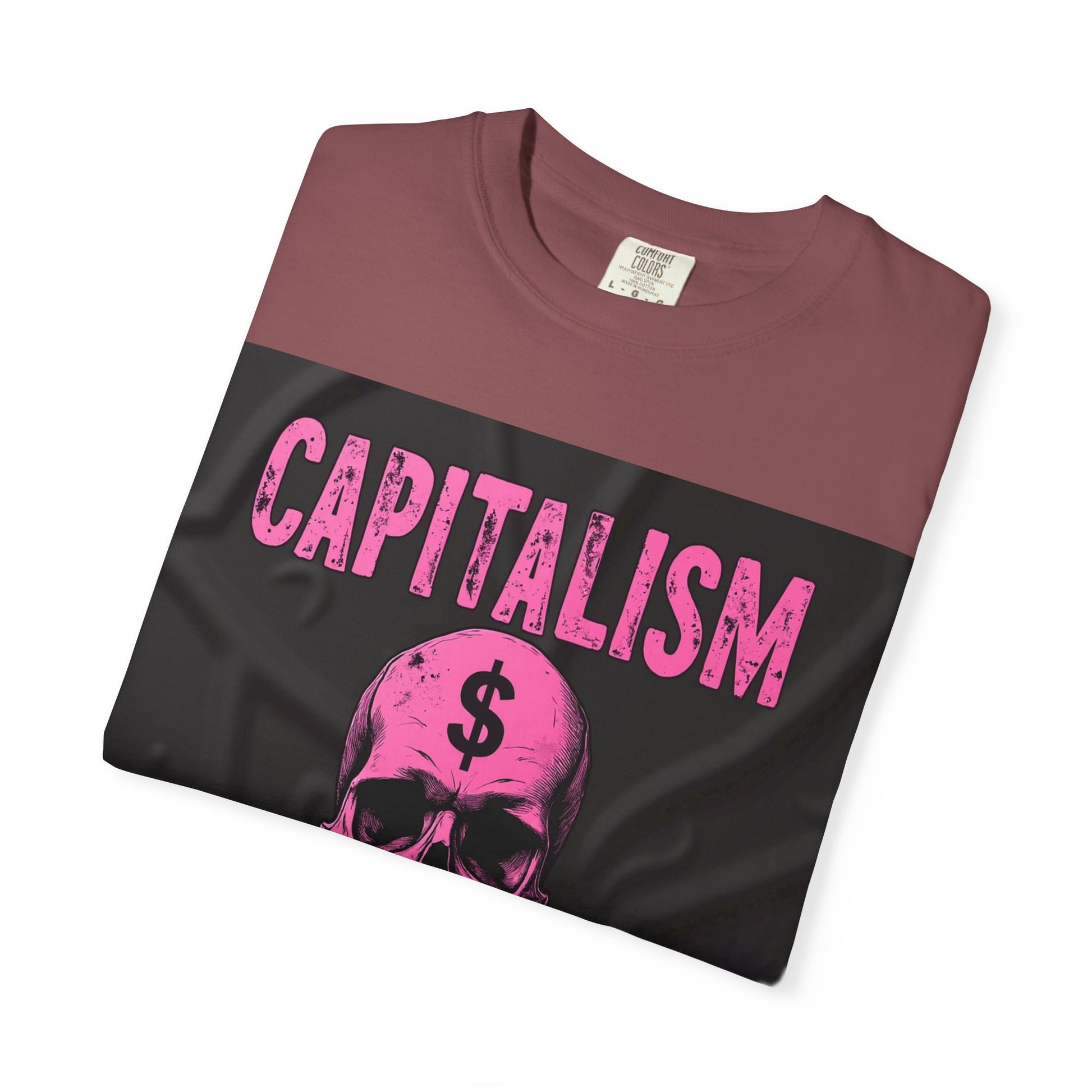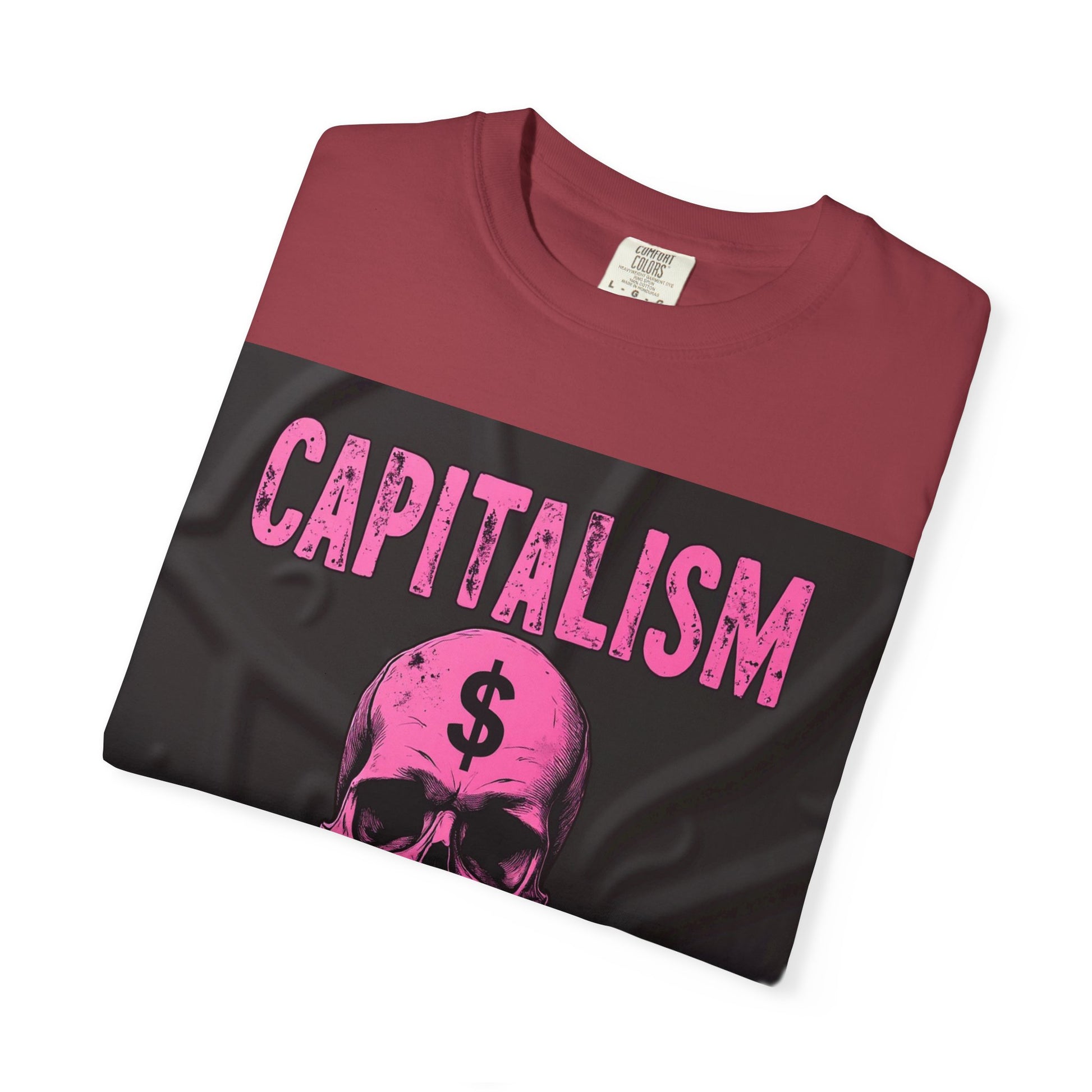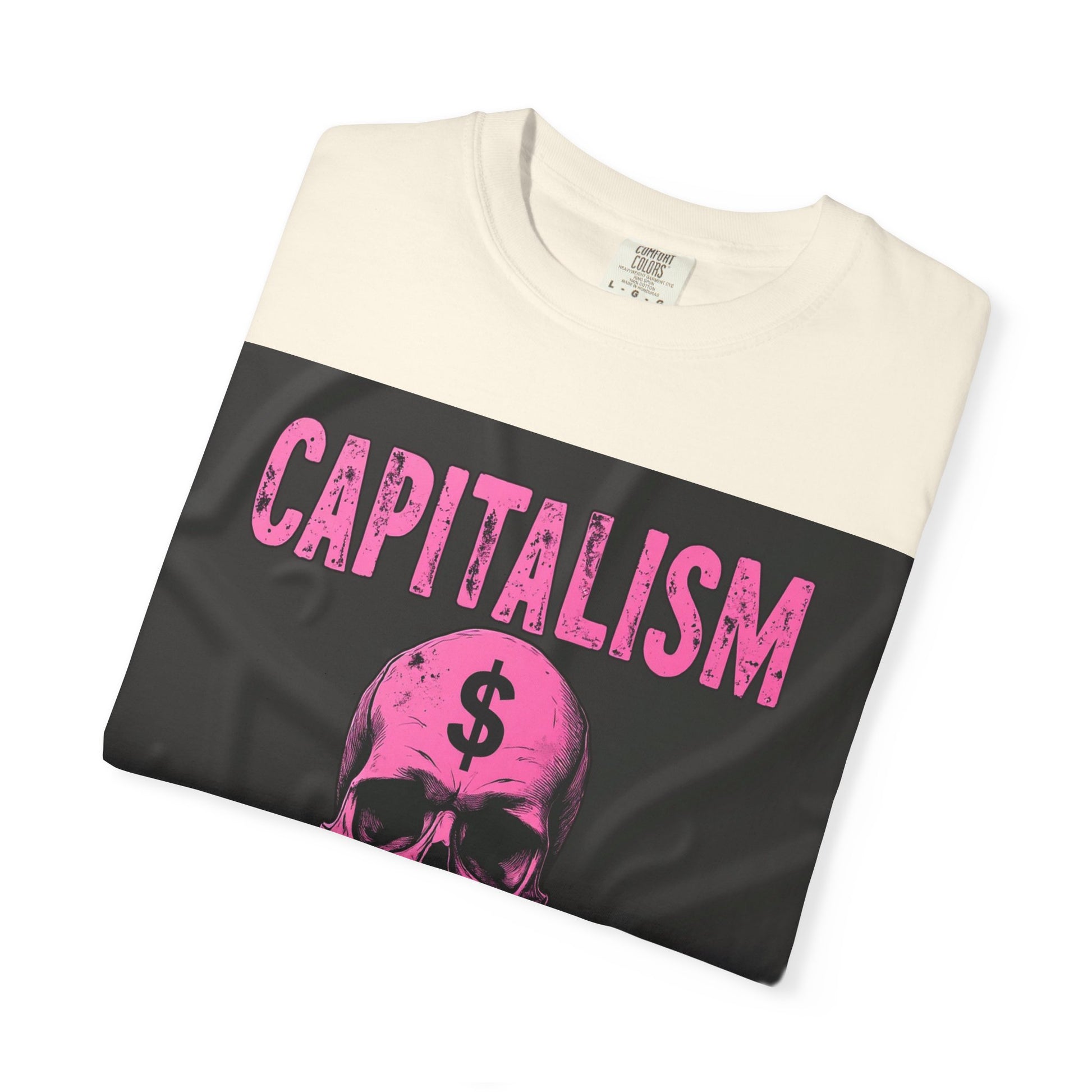 This graphic design artwork features a provocative anti-capitalist message in a striking pink and black color scheme. The image depicts a detailed, stylized human skull with a dollar sign positioned where the forehead would be, symbolizing the destructive nature of capitalism. The words "CAPITALISM KILLED IT" are displayed in large, distressed pink letters above and below the skull, creating a bold visual statement. The skull is rendered in a gritty, engraved-style illustration technique with sharp lines and deep shadows, giving it an intense and confrontational appearance. The background is a dark, blurred texture that provides contrast and depth to the central graphic elements.