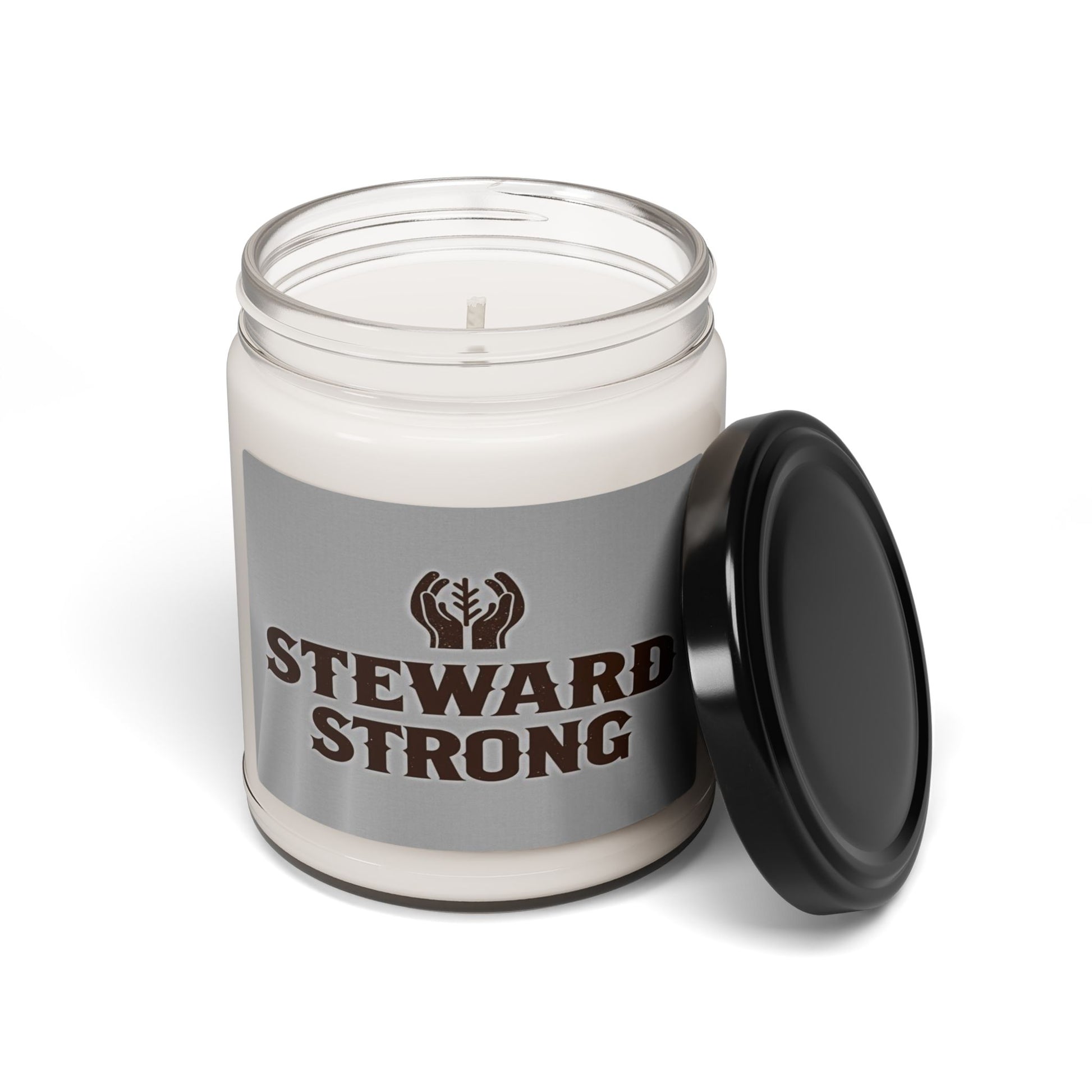 The image features a logo design with the text "STEWARD STRONG" in bold, rustic brown lettering against a light gray background. Above the text is a stylized graphic of two hands cupping a tree or plant, symbolizing protection, nurturing, and environmental stewardship. The logo has a textured, slightly gritty appearance that gives it a rugged and authentic feel. The typography is robust and angular, with a strong, confident aesthetic that matches the "STRONG" part of the message. The color palette of brown and gray creates a natural, earthy tone that reinforces the image's themes of care, sustainability, and strength.