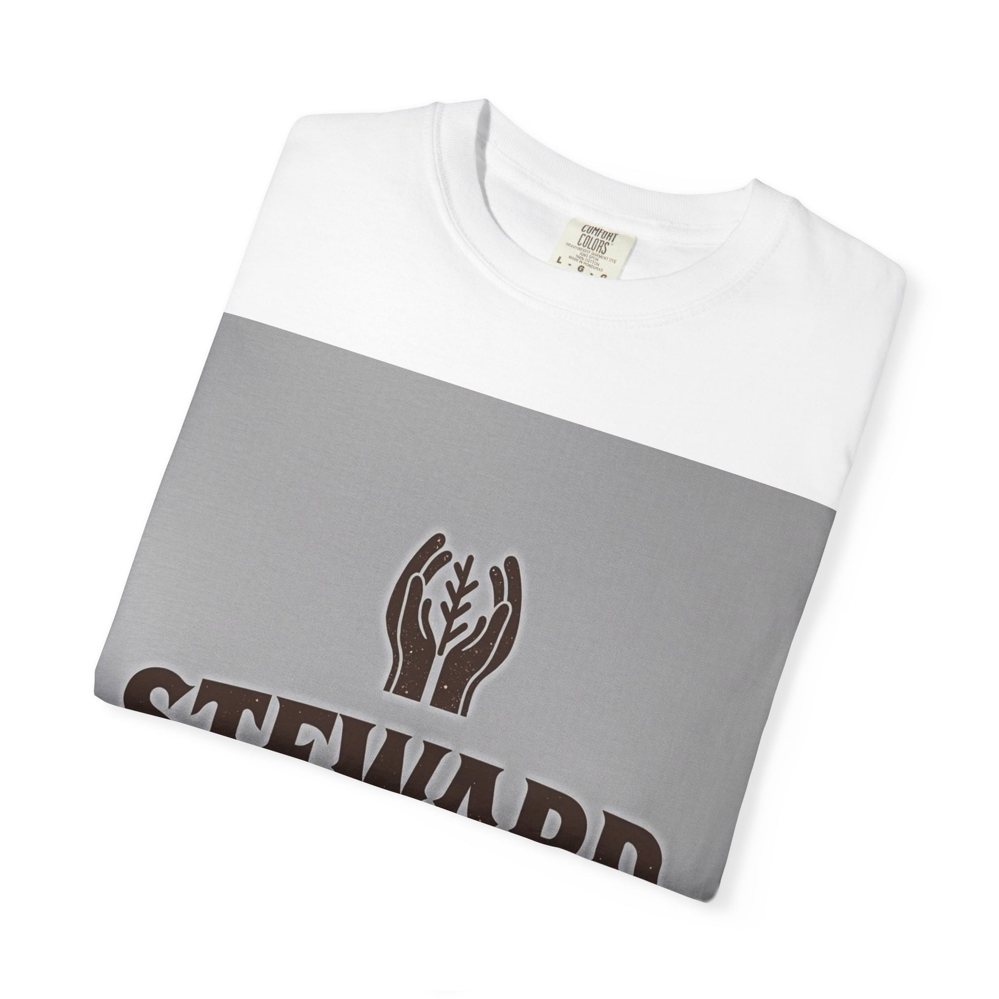 The image displays a graphic design featuring the bold text "STEWARD STRONG" in a rich brown color against a light gray background. Above the text is a stylized logo consisting of two hands cupping a tree or leaf-like symbol, suggesting themes of environmental care, protection, and nurturing. The typography is robust and impactful, with a vintage or weathered texture that adds depth and character to the letters. The logo and text are centered on the image, creating a strong visual focal point that draws the viewer's attention. The color palette of brown and gray evokes a sense of earthiness, stability, and natural strength.