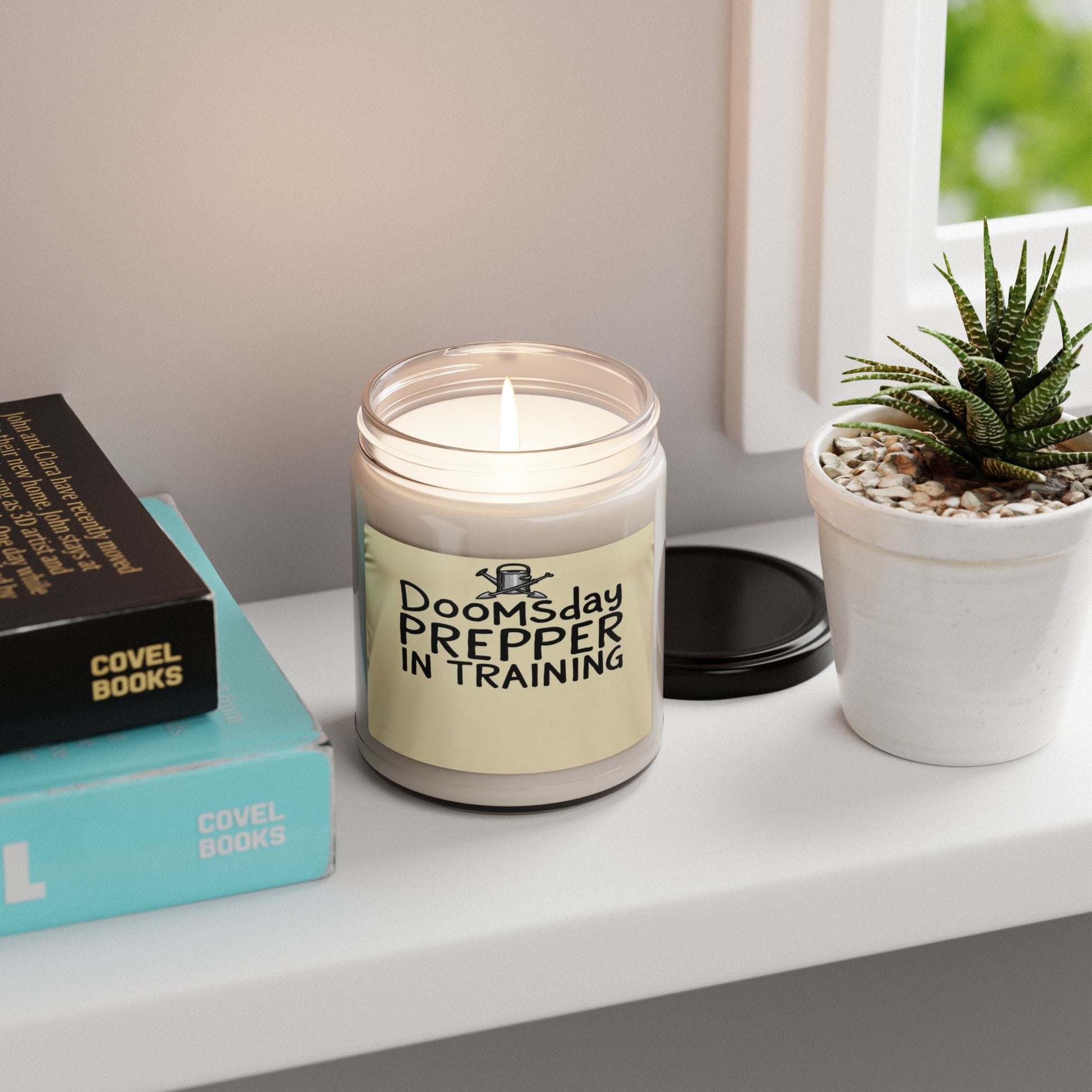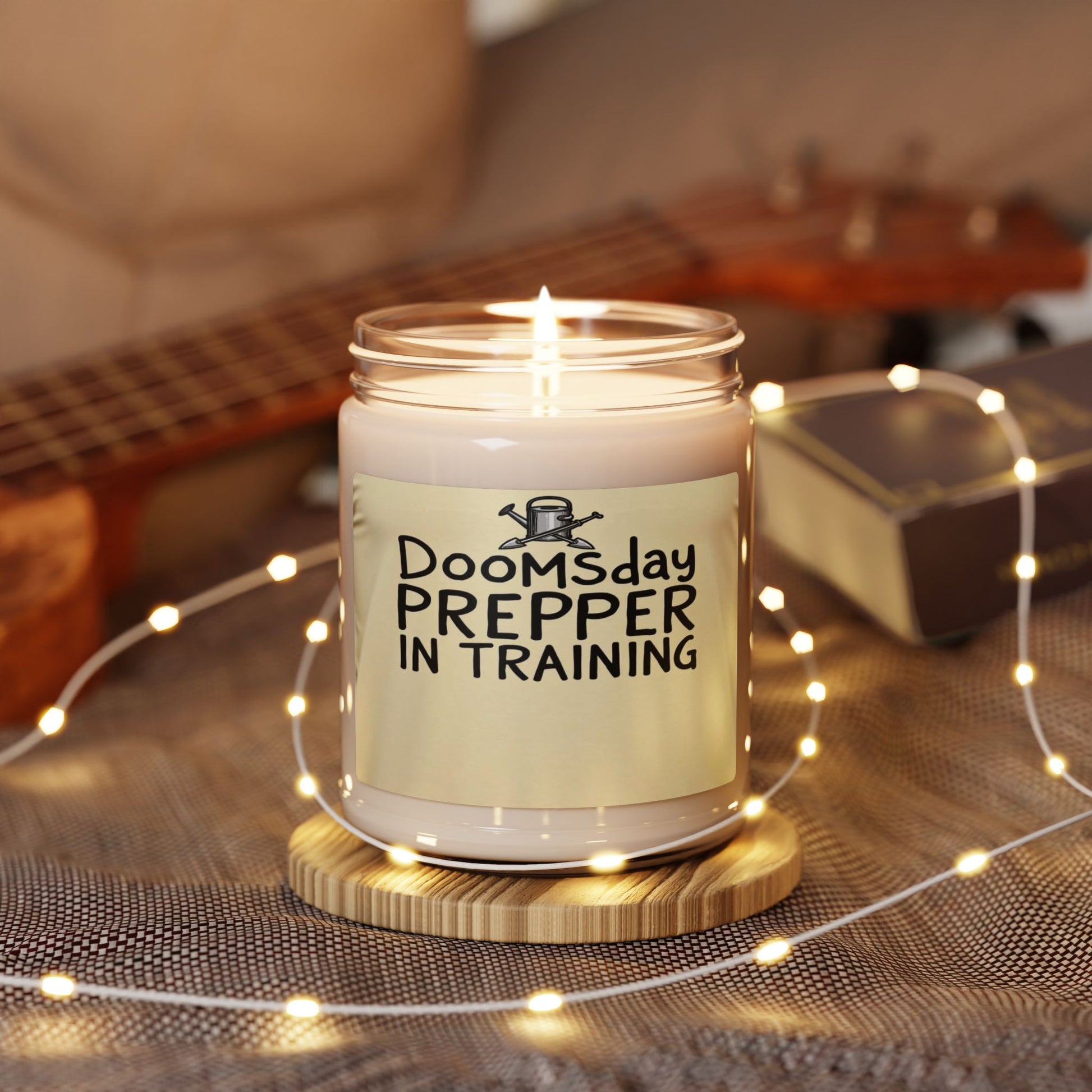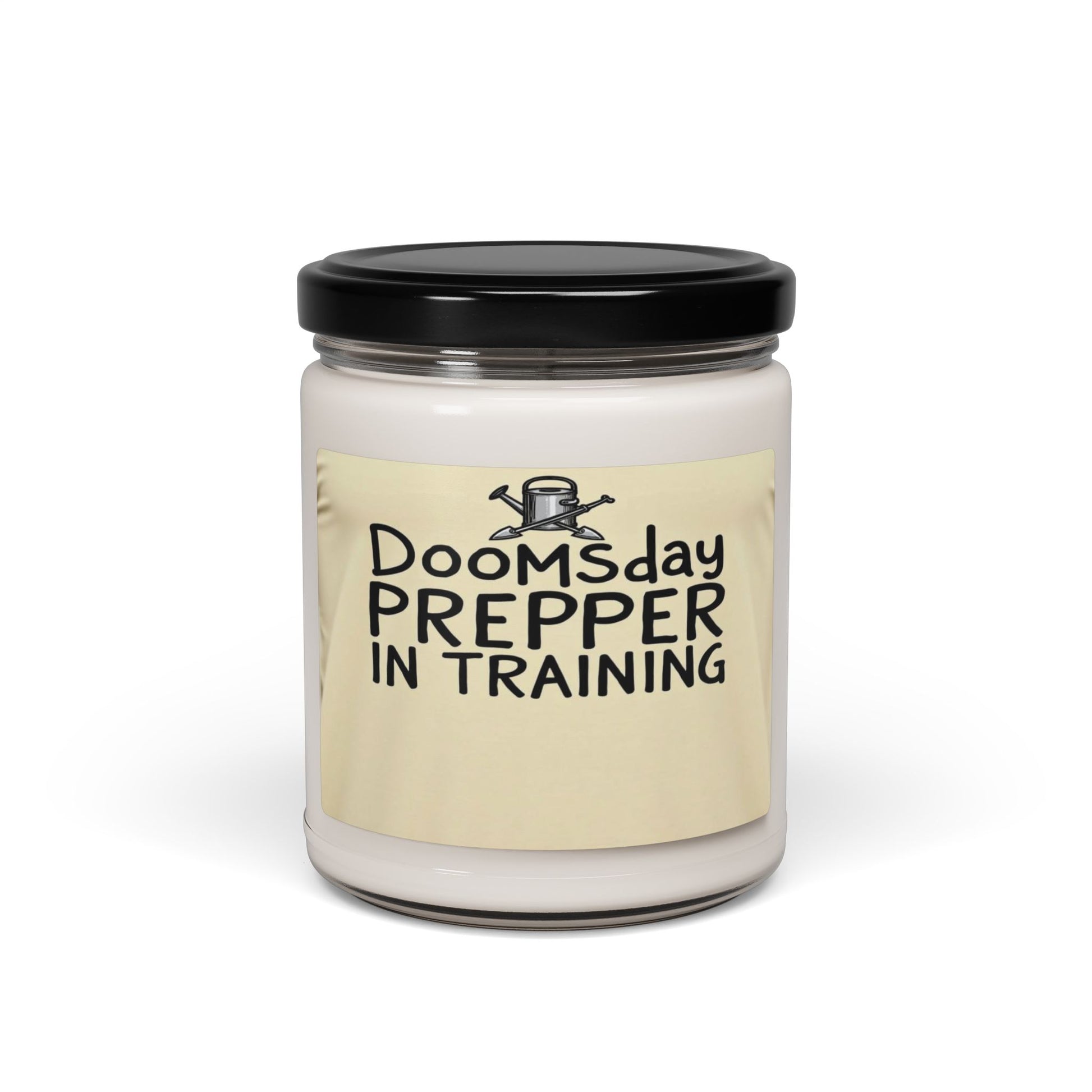 This cream-colored graphic design features bold black text reading "Doomsday PREPPER IN TRAINING" with a stylized metallic watering can and gardening tools crossed above the text. The typography is hand-drawn and playful, using a casual, rounded font that gives the design a lighthearted feel despite the serious-sounding "Doomsday" reference. The illustration's logo-like composition centers the text and graphic element, creating a clean and focused visual presentation. The watering can and tools suggest a connection to self-sufficiency, gardening, and emergency preparedness. The image appears to be designed for a t-shirt, poster, or other merchandise targeting survival enthusiasts or gardening hobbyists with a sense of humor.
