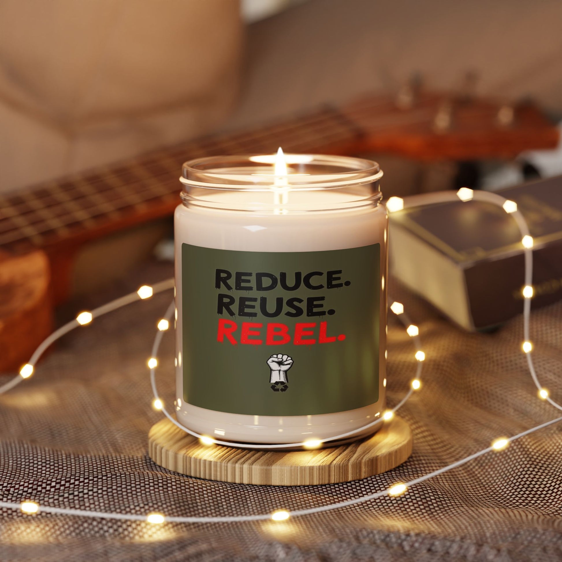 This powerful graphic design image features a bold environmental message against an olive green background. The text "REDUCE. REUSE. REBEL." is displayed in progressively larger and more dramatic typography, with the word "REBEL" highlighted in bright red. The words appear to be dripping or melting, giving the design an intense, urgent feel. At the bottom of the image is a raised white fist symbol, integrated with the recycling logo, symbolizing activism and environmental sustainability. The minimalist color palette and graphic style create a strong visual statement about taking action for ecological preservation.